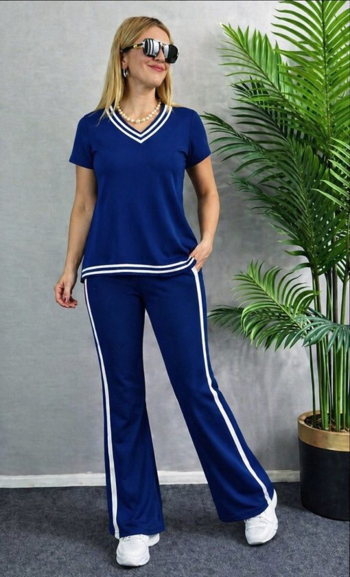 طقم نسائي من قطعتين: بلوزة قصيرة الأكمام بياقة على شكل حرف V مصنوعة من الفسكوز بخيطين، وبنطال.