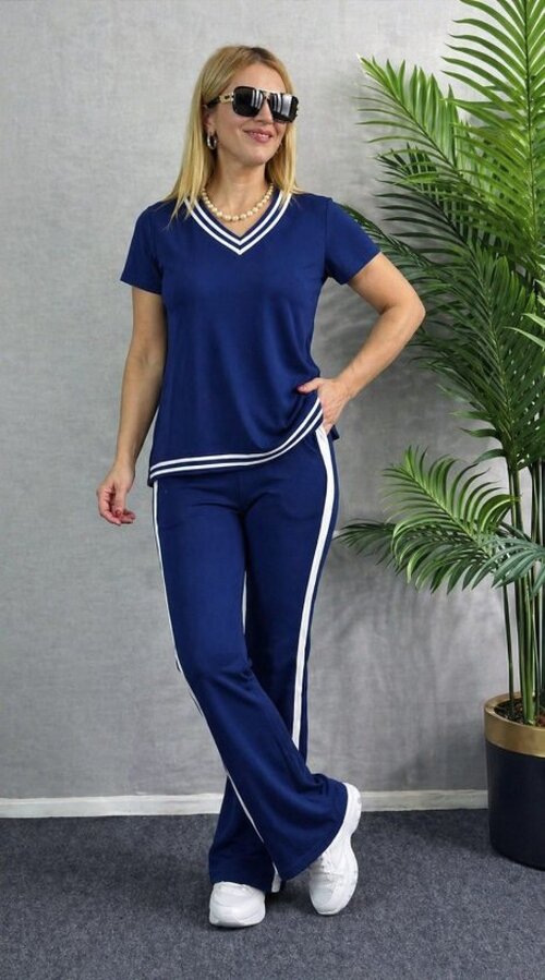 طقم نسائي من قطعتين: بلوزة قصيرة الأكمام بياقة على شكل حرف V مصنوعة من الفسكوز بخيطين، وبنطال. رمز المنتج: 188725