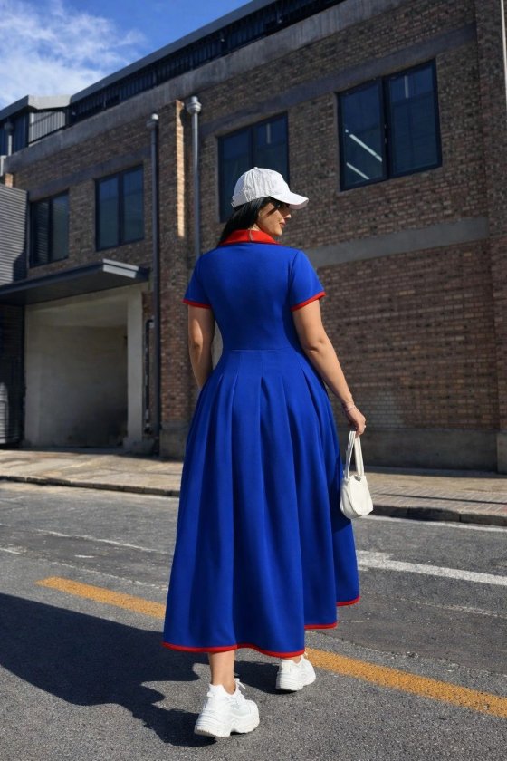 فستان نسائي طويل لامع بأكمام قصيرة وفتحة رقبة على شكل حرف V وثنيات من الكريب