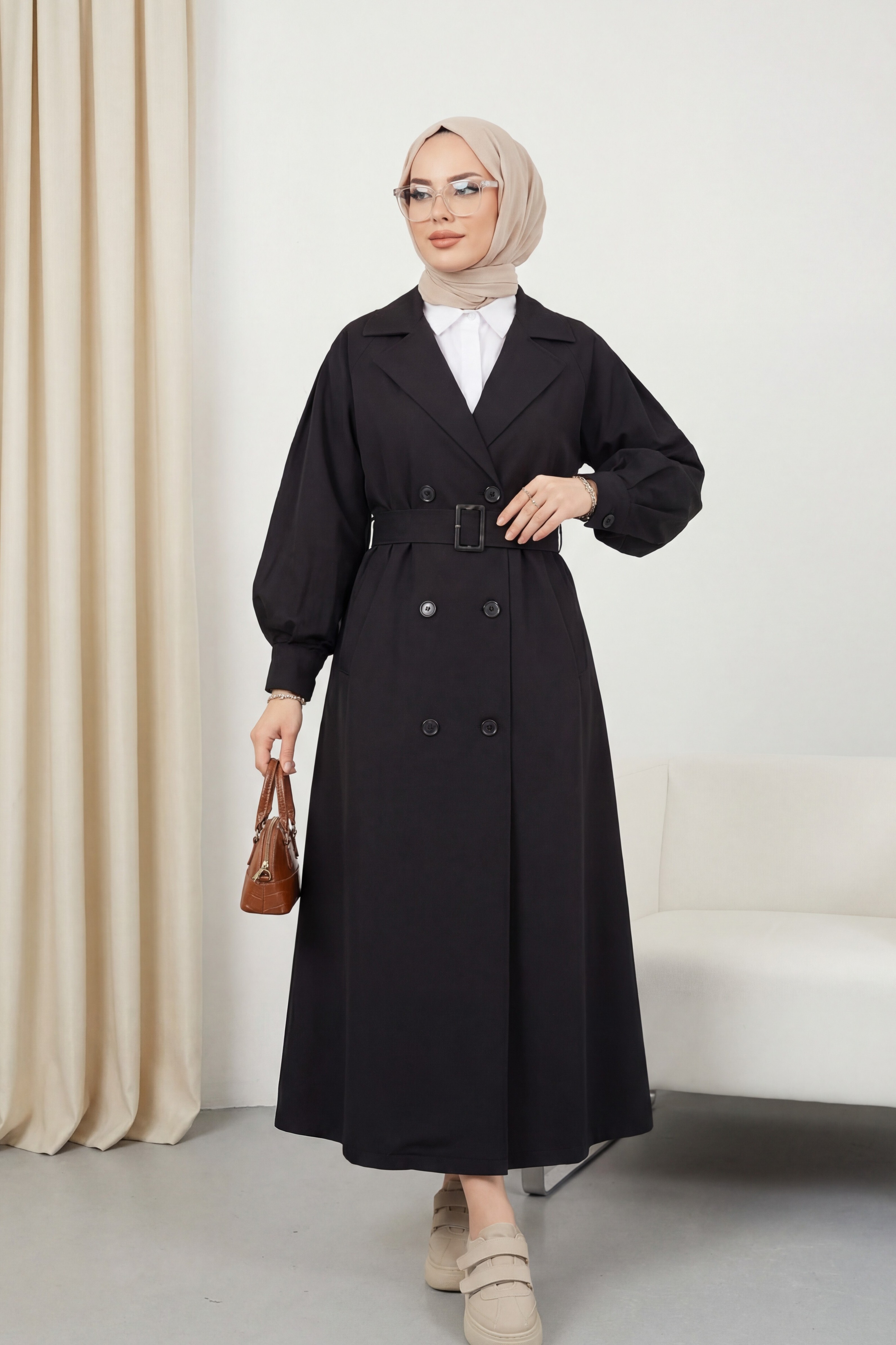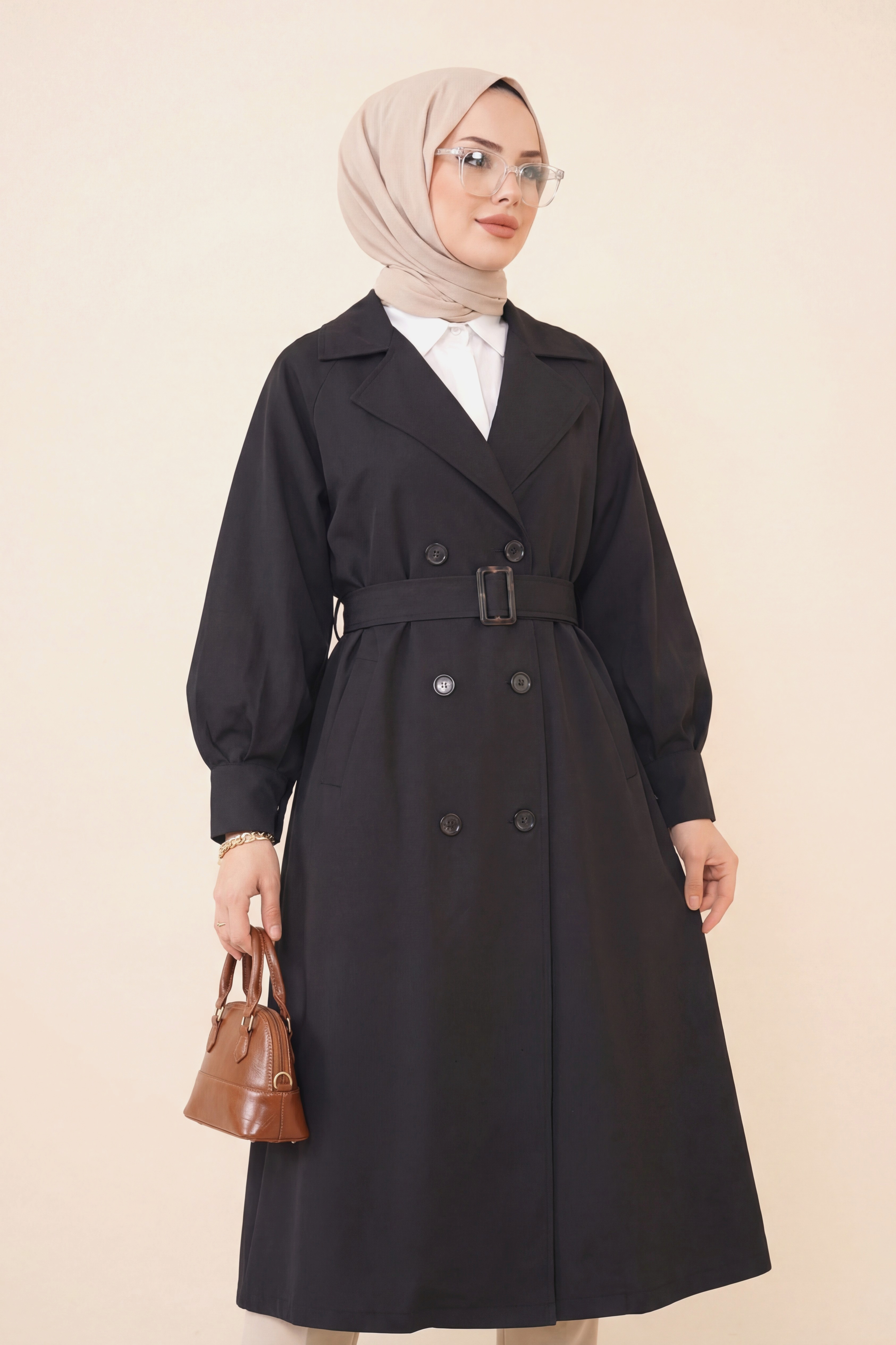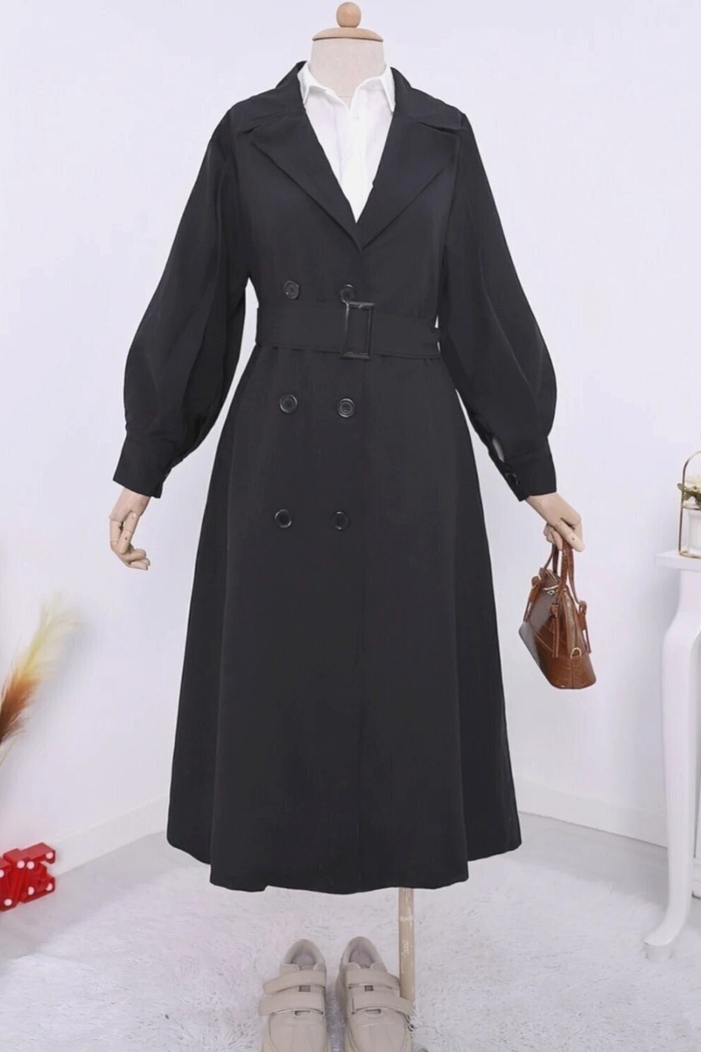 Not: Ürün içeriği trençkottan oluşmaktadır. (Pantolon, gömlek, ayakkabı, çanta ve takılar dekor amaçlı kullanılmaktadır.)