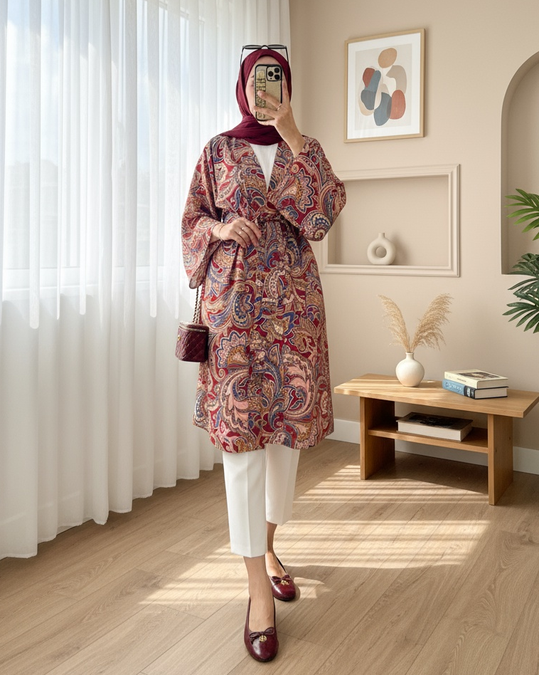 Beli Bağlamalı Etnik Desen Modal Kimono, hafif yapısı ve dikkat çekici etnik deseniyle stilinize bohem bir dokunuş katıyor. Yumuşak modal kumaşı sayesinde gün boyu konfor sunar.