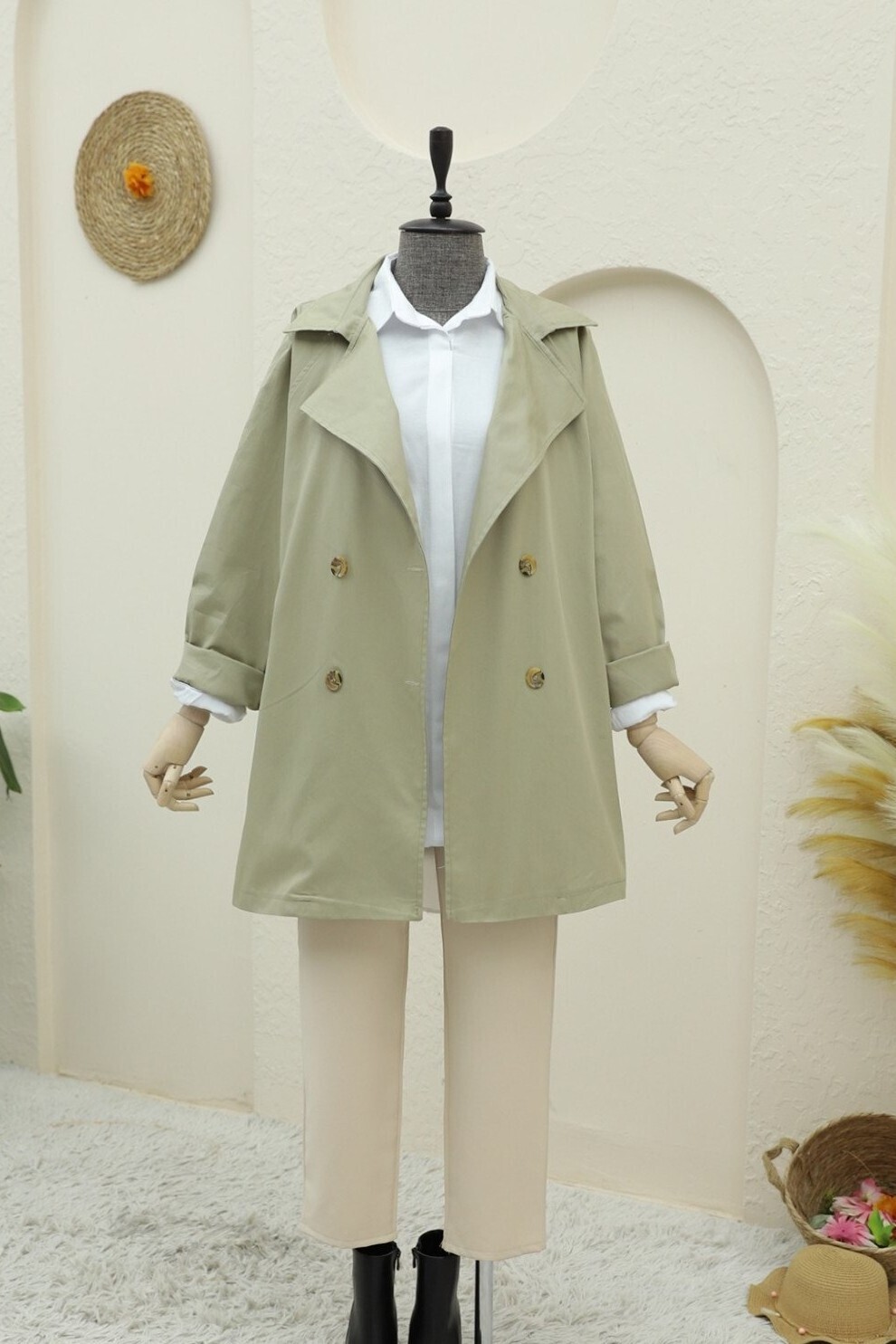 Bolero detaylı, düğmeli, ara boy trençkot; şıklığı ve zarafeti modern bir tasarımla birleştirir. Bolero detayı, trençkota benzersiz bir hava katarken, düğme detayları şıklığı tamamlar. Orta boy tasarımı ise rahatlık ve hareket özgürlüğü sağlar. Hem günlük kullanım hem de şık davetler için mükemmel bir seçenek.
