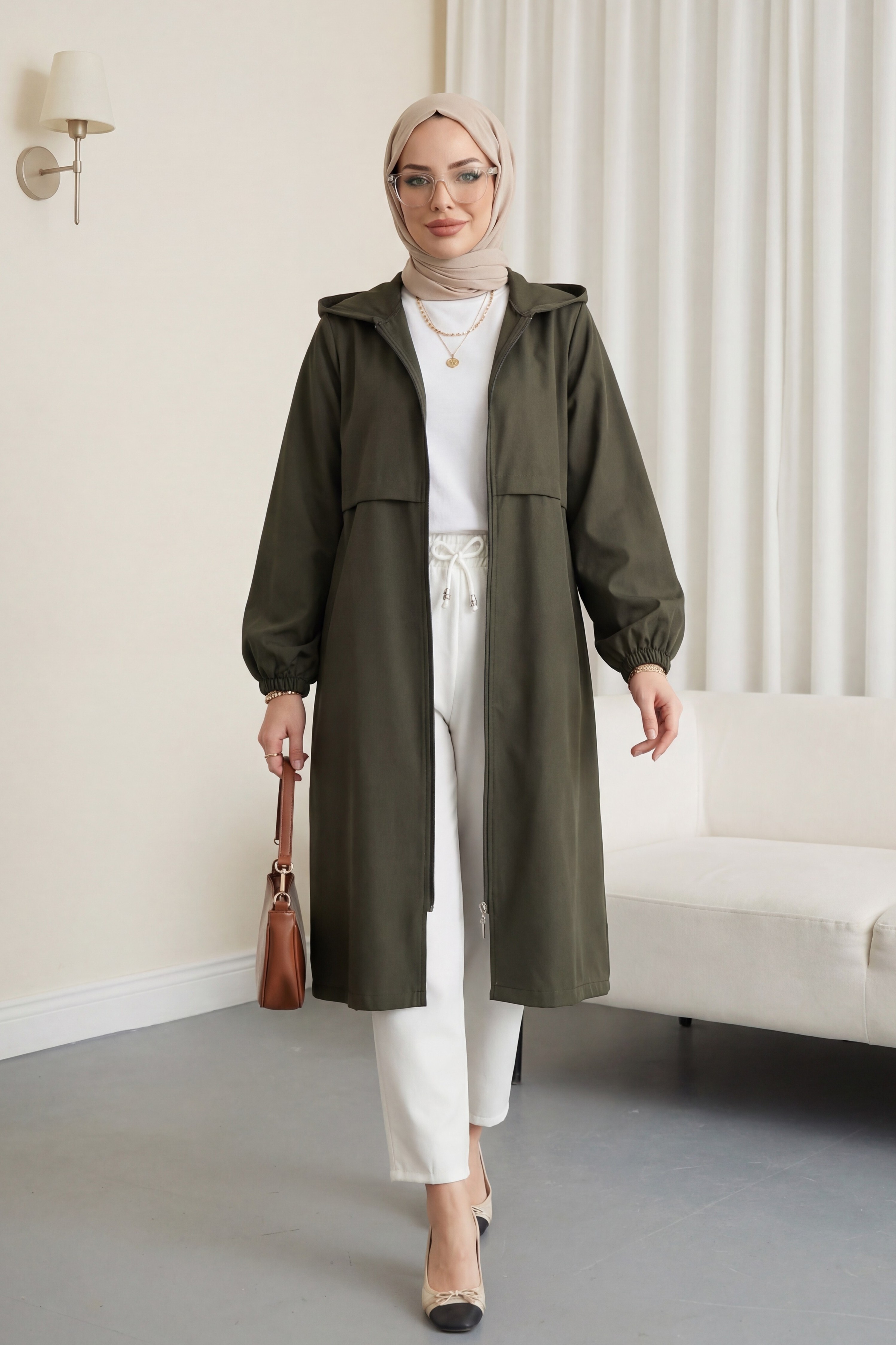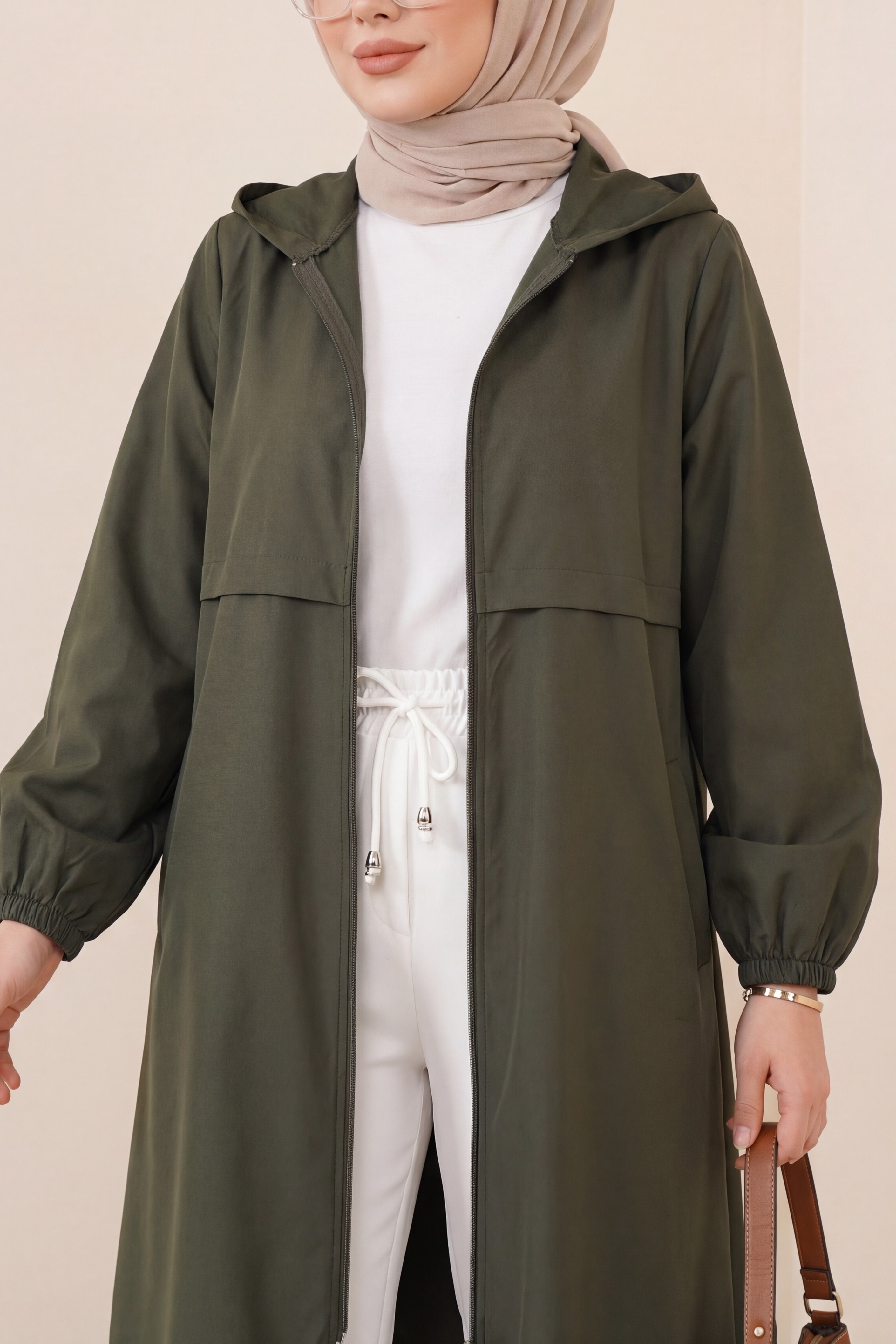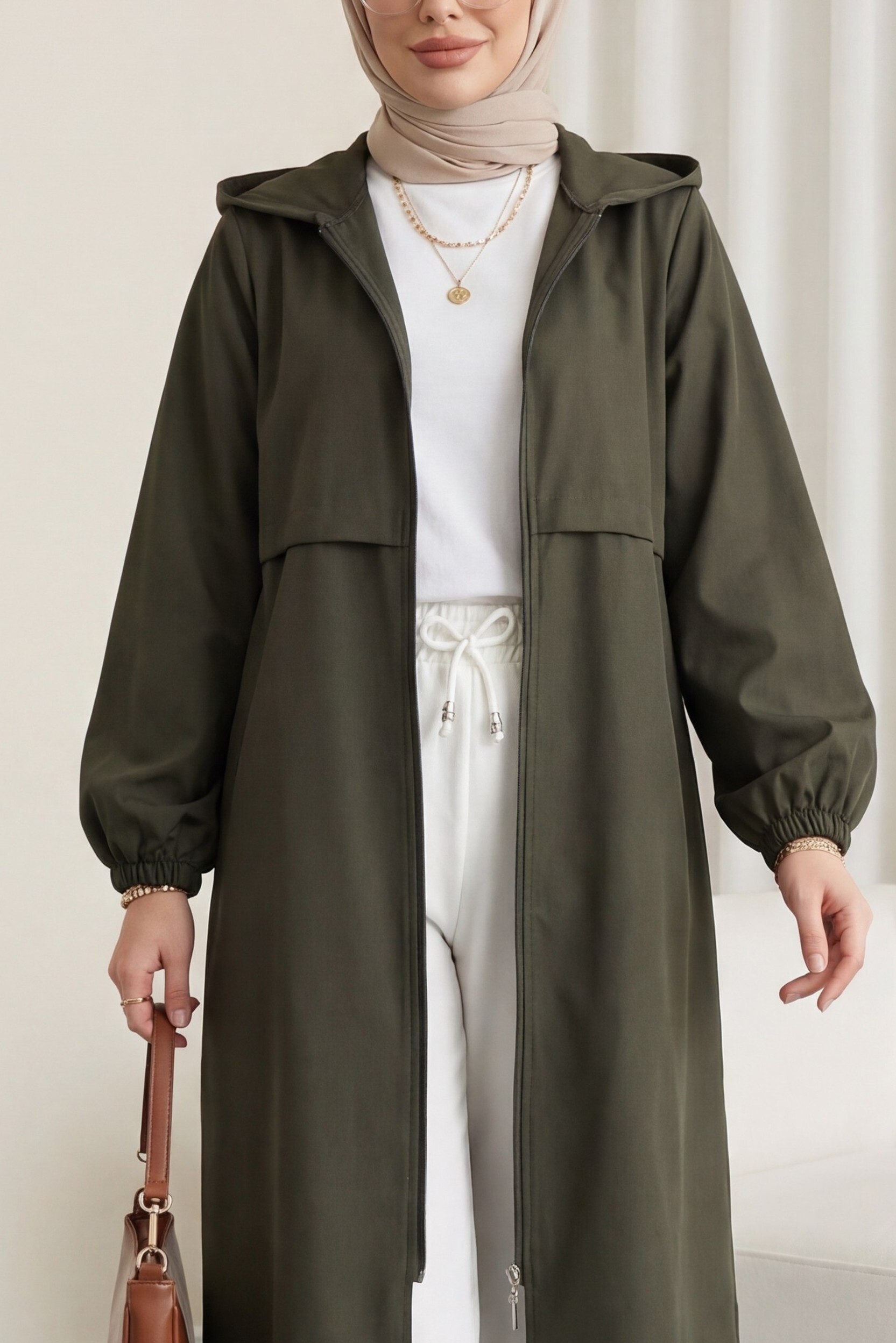 Boydan Fermuarlı Kapşonlu Uzun Yağmurluk -Haki