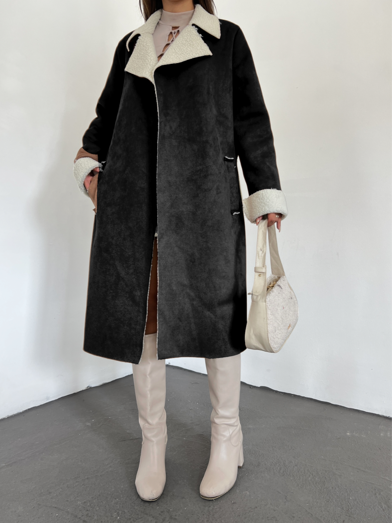 İçi Kürklü Kemerli Süet Kaban -Siyah