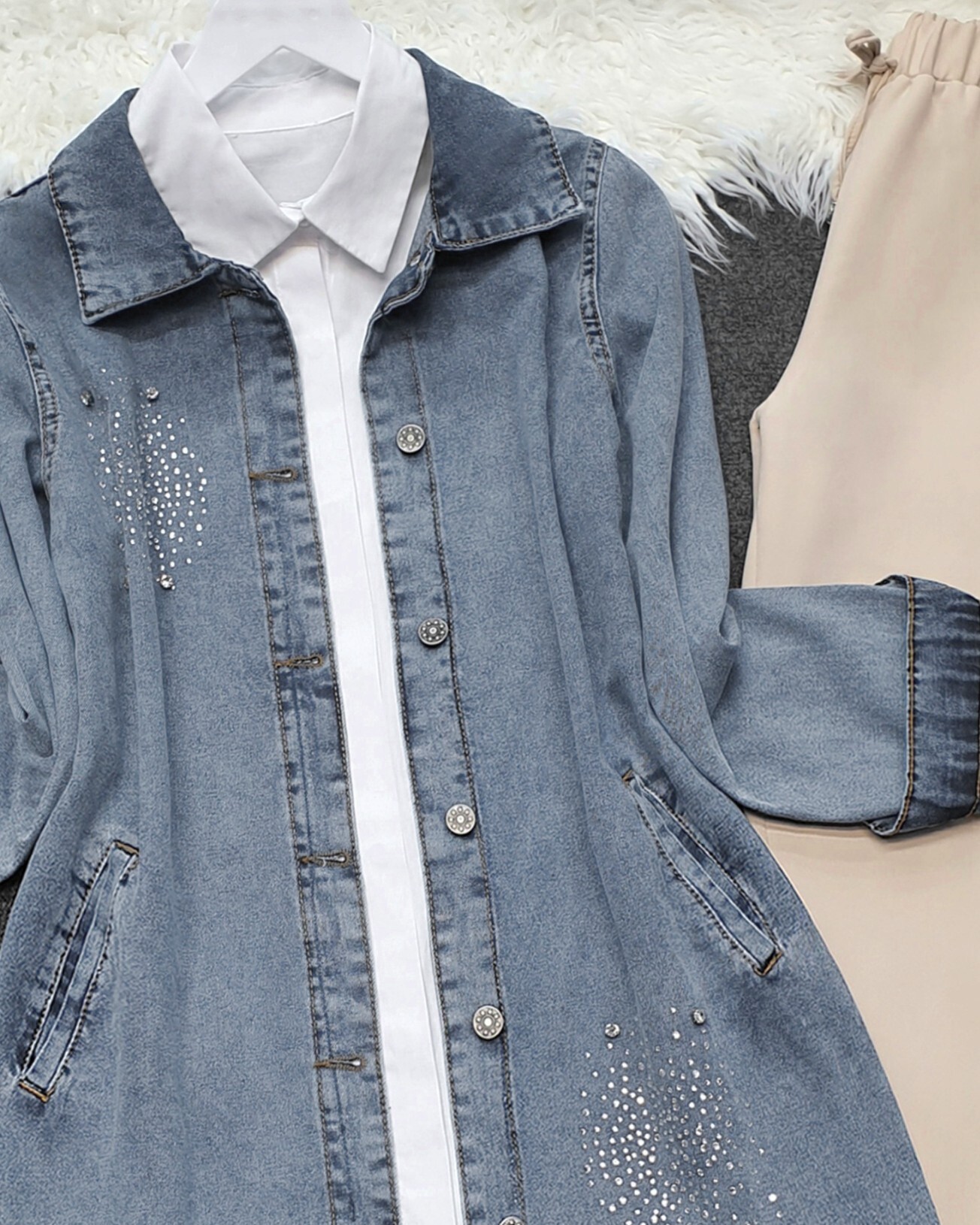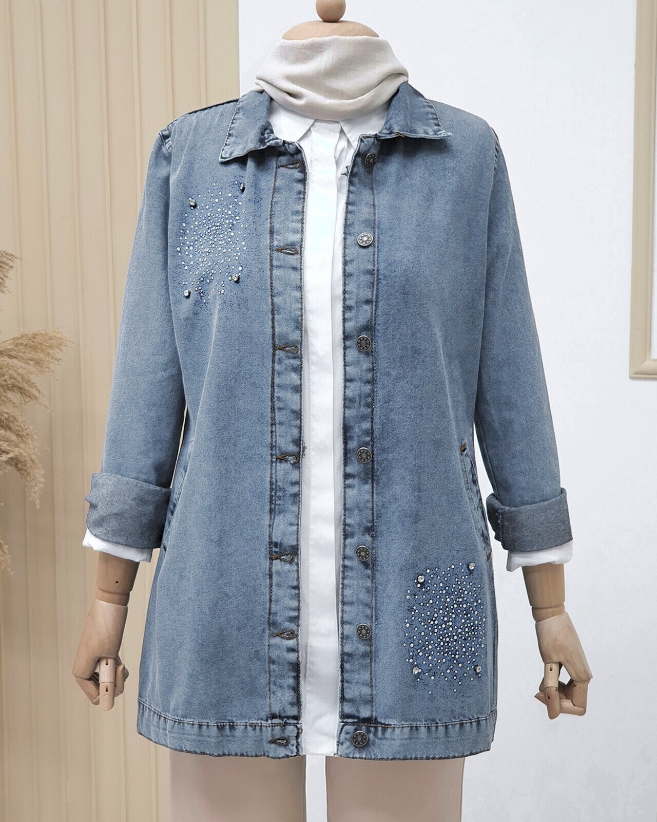 Önden düğmeli, önü taş detaylı, 2 cepli, kol manşeti düğmeli kot ceket modelimiz yeni sezonun en çok sevilen modelleri arasında yer almaktadır.