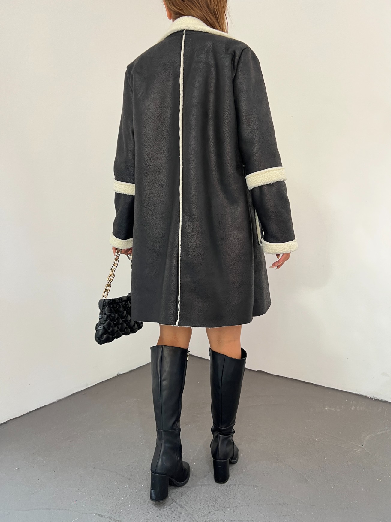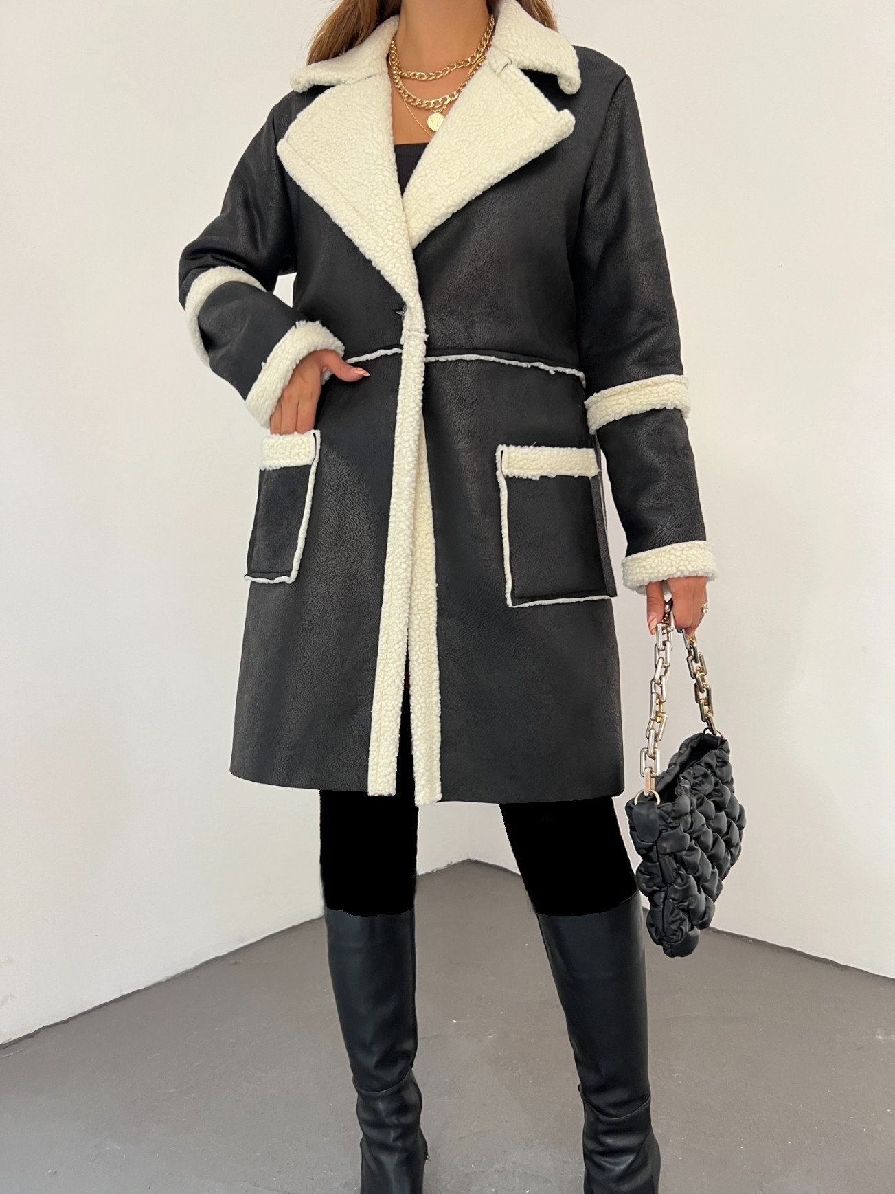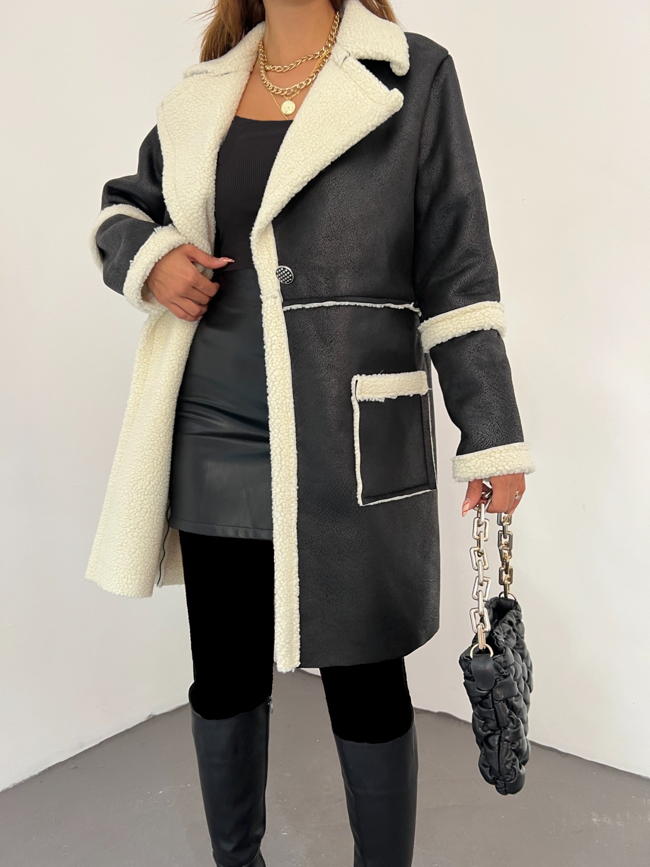 Tek Düğmeli İçi Kürklü Süet Kaban -Siyah