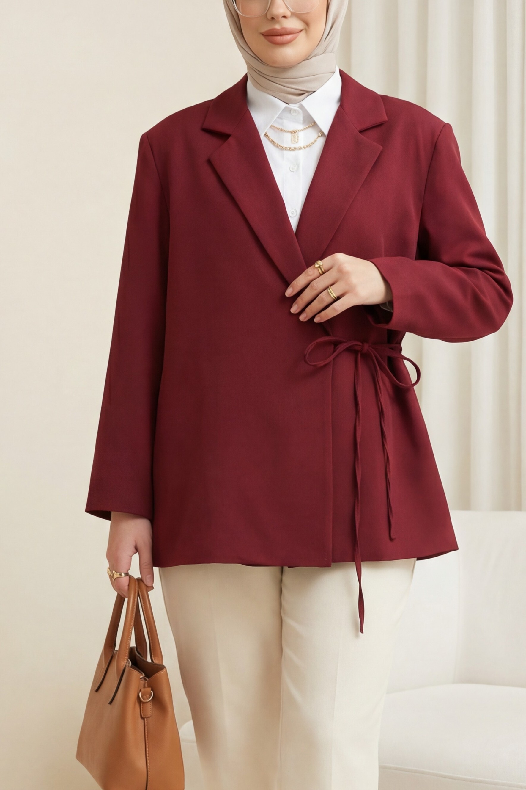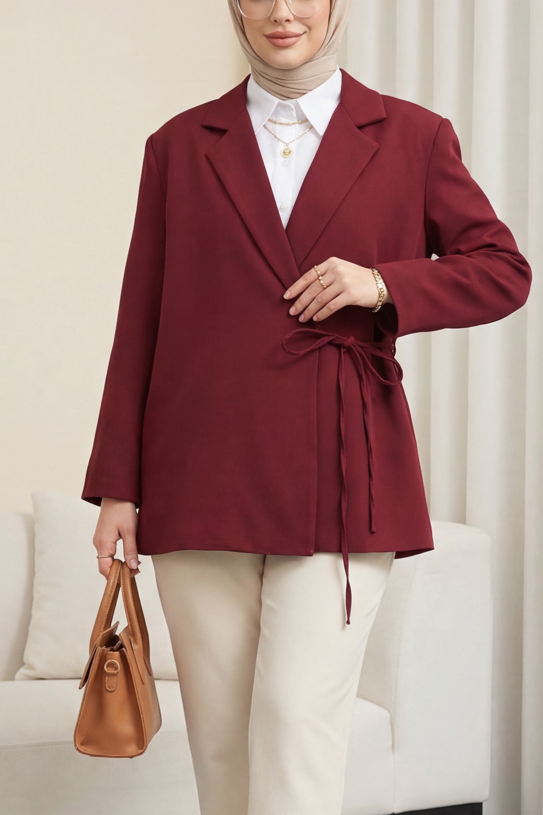 “Double krep ceket”, “bağcıklı kadın ceket”, “astarlı şık ceket”, “modern kadın ceket modeli” gibi adlandırılabilir.