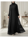 Belted Two-Piece Tulle Abaya Set with Stone and Pearl Details -Black