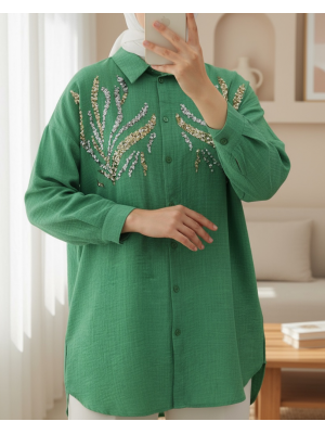 Sequined Long Shirt with Front Sequins -Forest Green