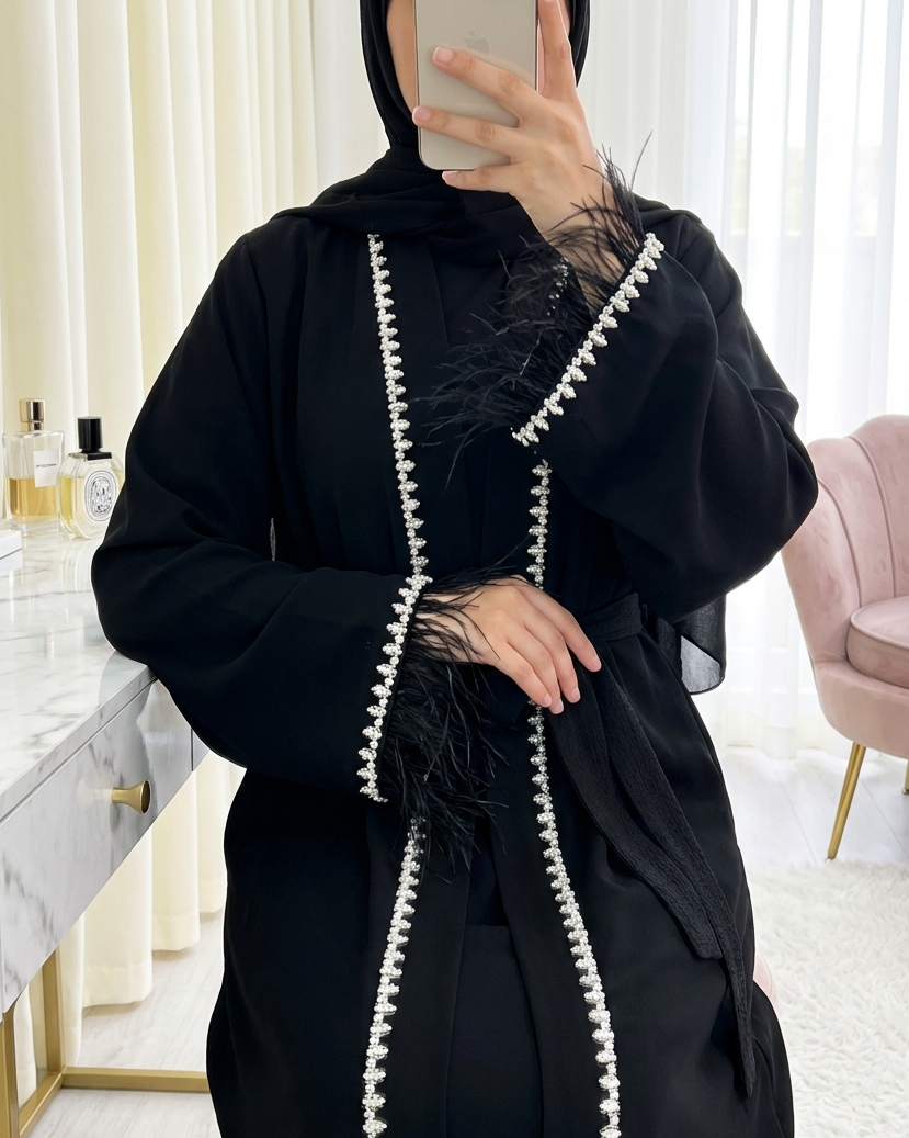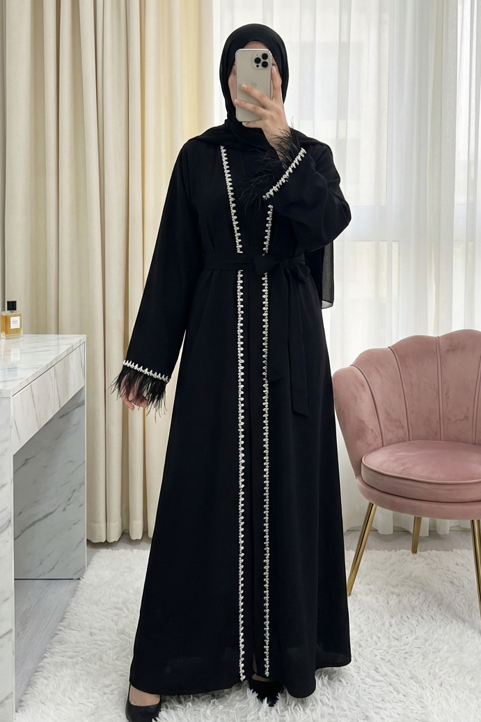 Abaya with Feathered Sleeves and Row of Stone Details, and Belt -Black