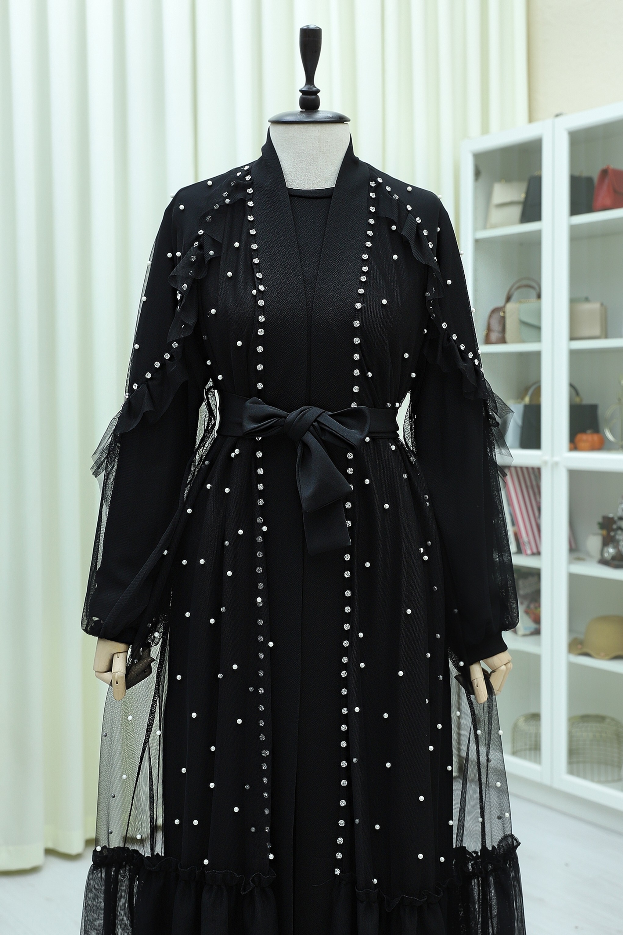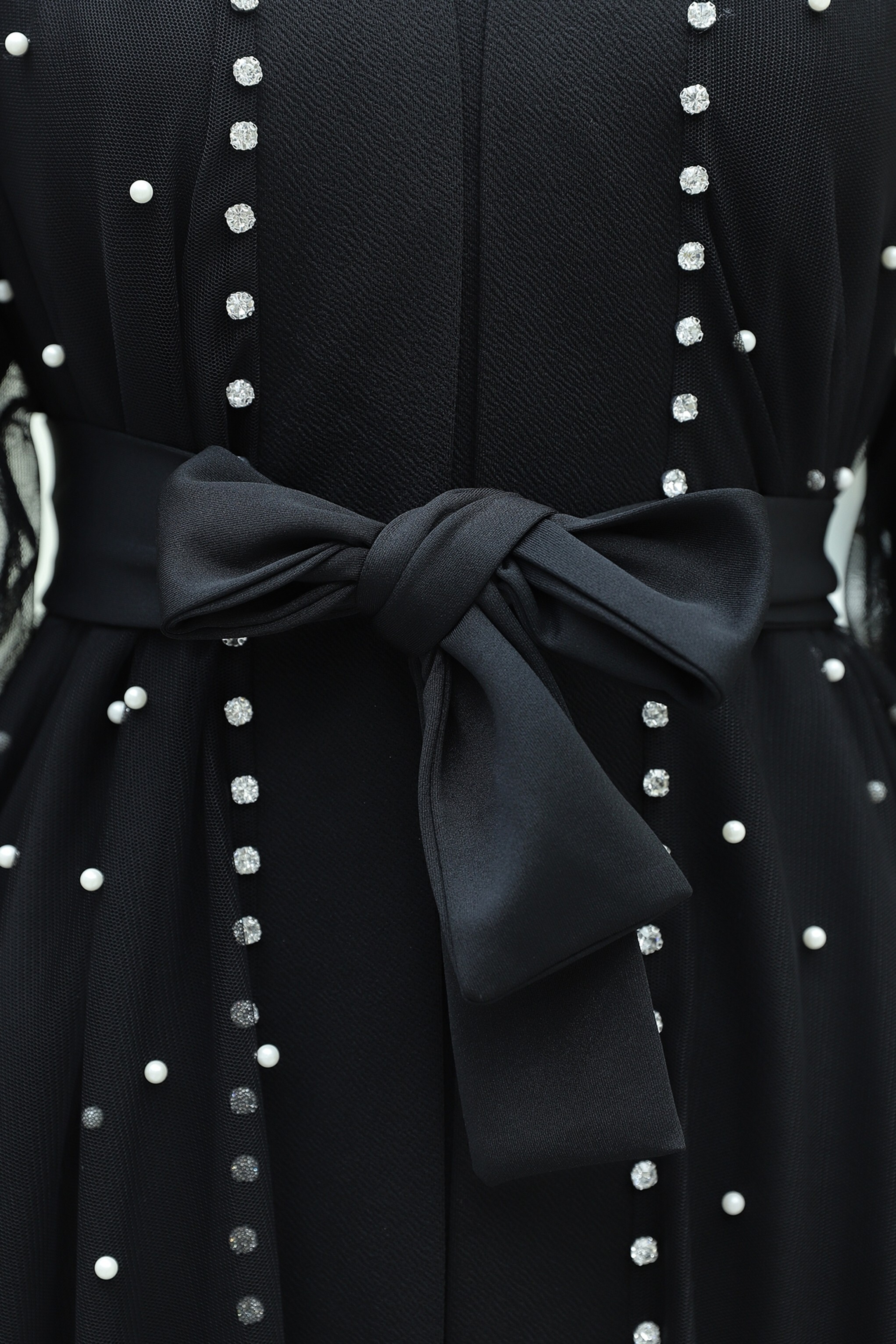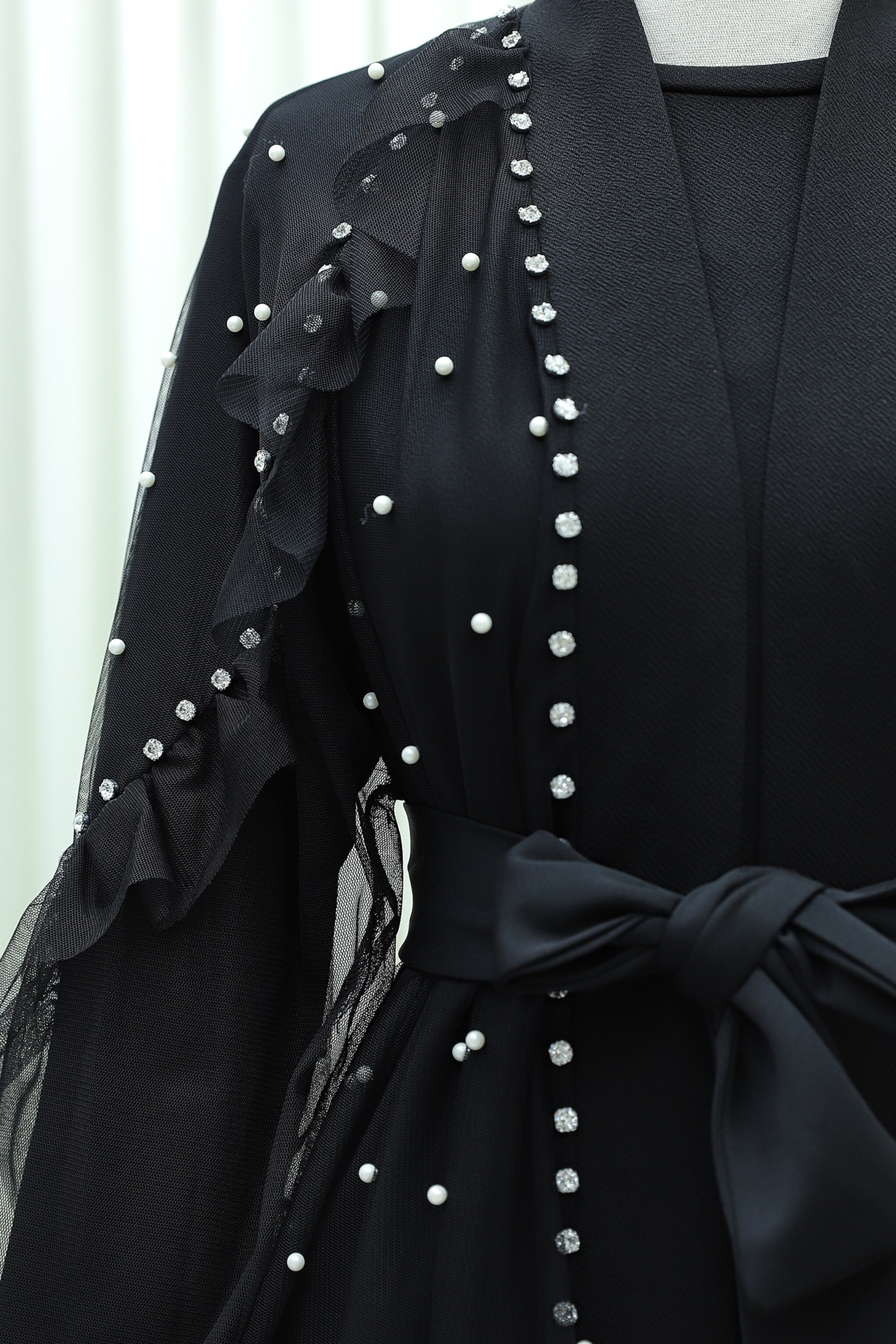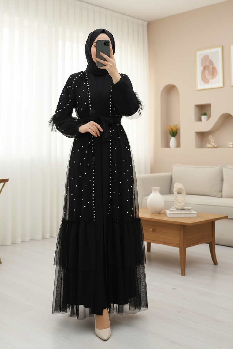Belted Two-Piece Tulle Abaya Set with Stone and Pearl Details -Black