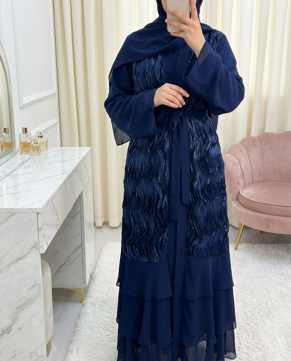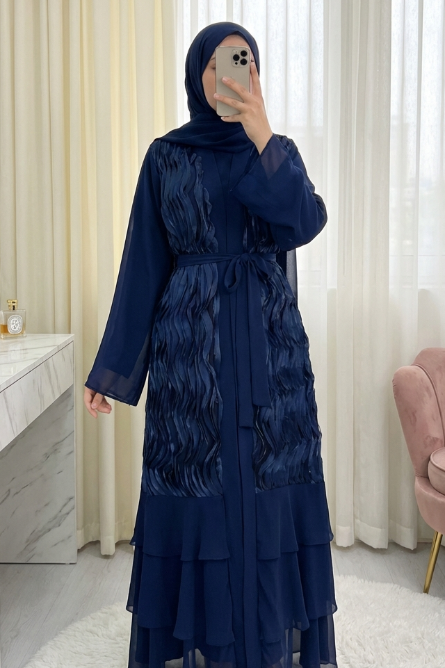 Two-piece abaya set with tulle detail at the front and a belted skirt. -Navy blue
