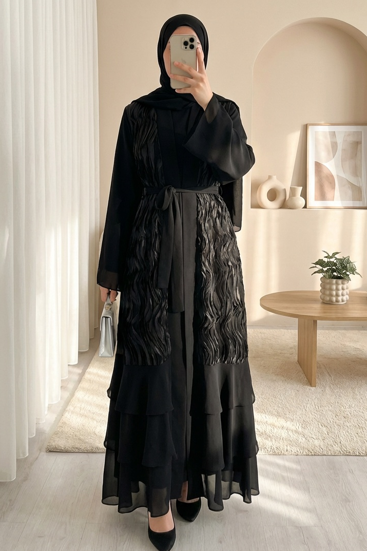 Two-piece abaya set with tulle detail at the front and a belted skirt. -Black