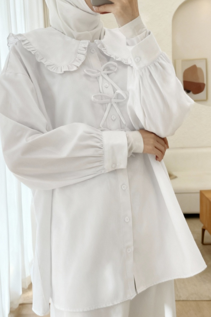 Baby Collar Poplin Shirt with Front Bow Detail -White