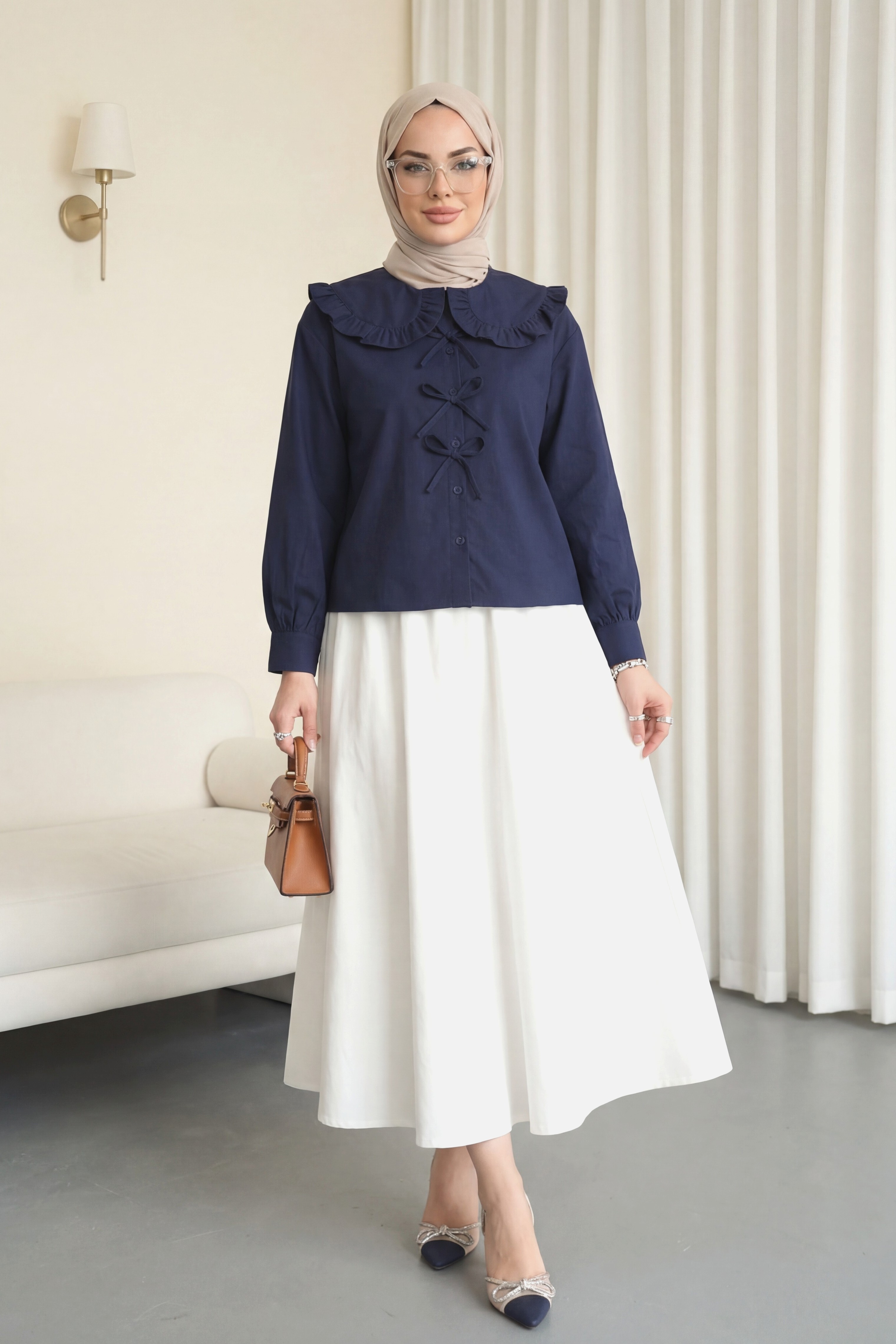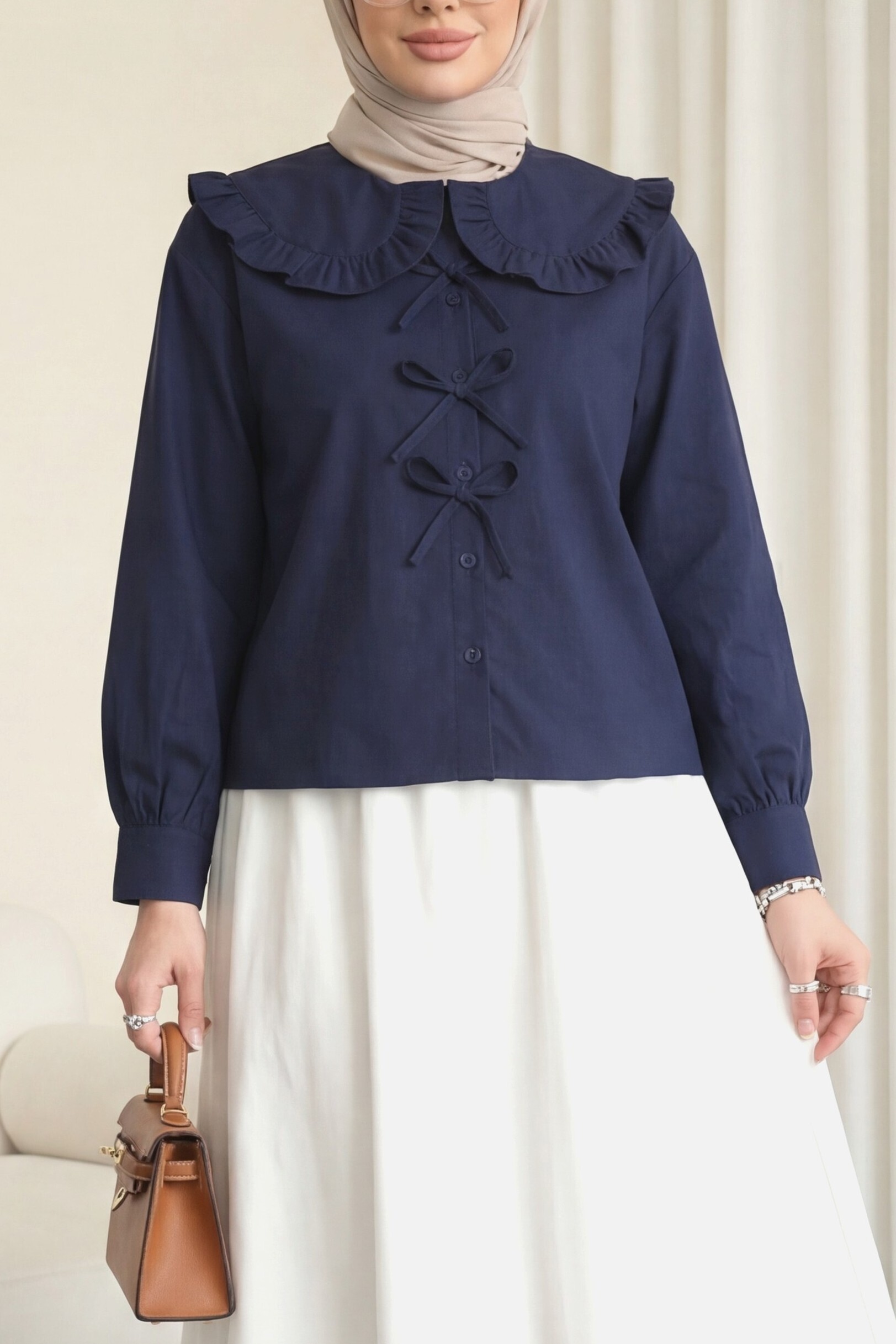 Baby Collar Ribbon Detailed Shirt -Navy blue