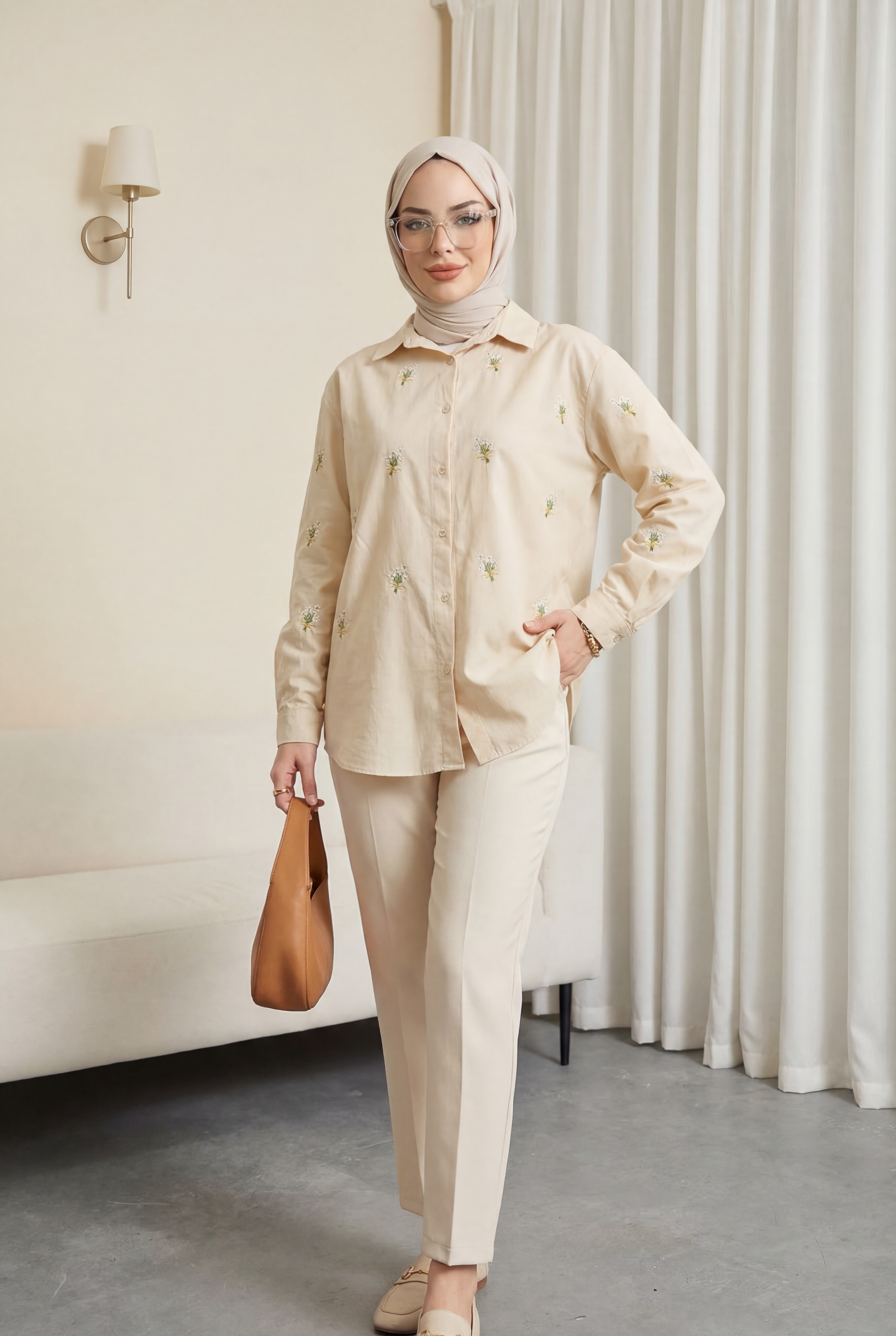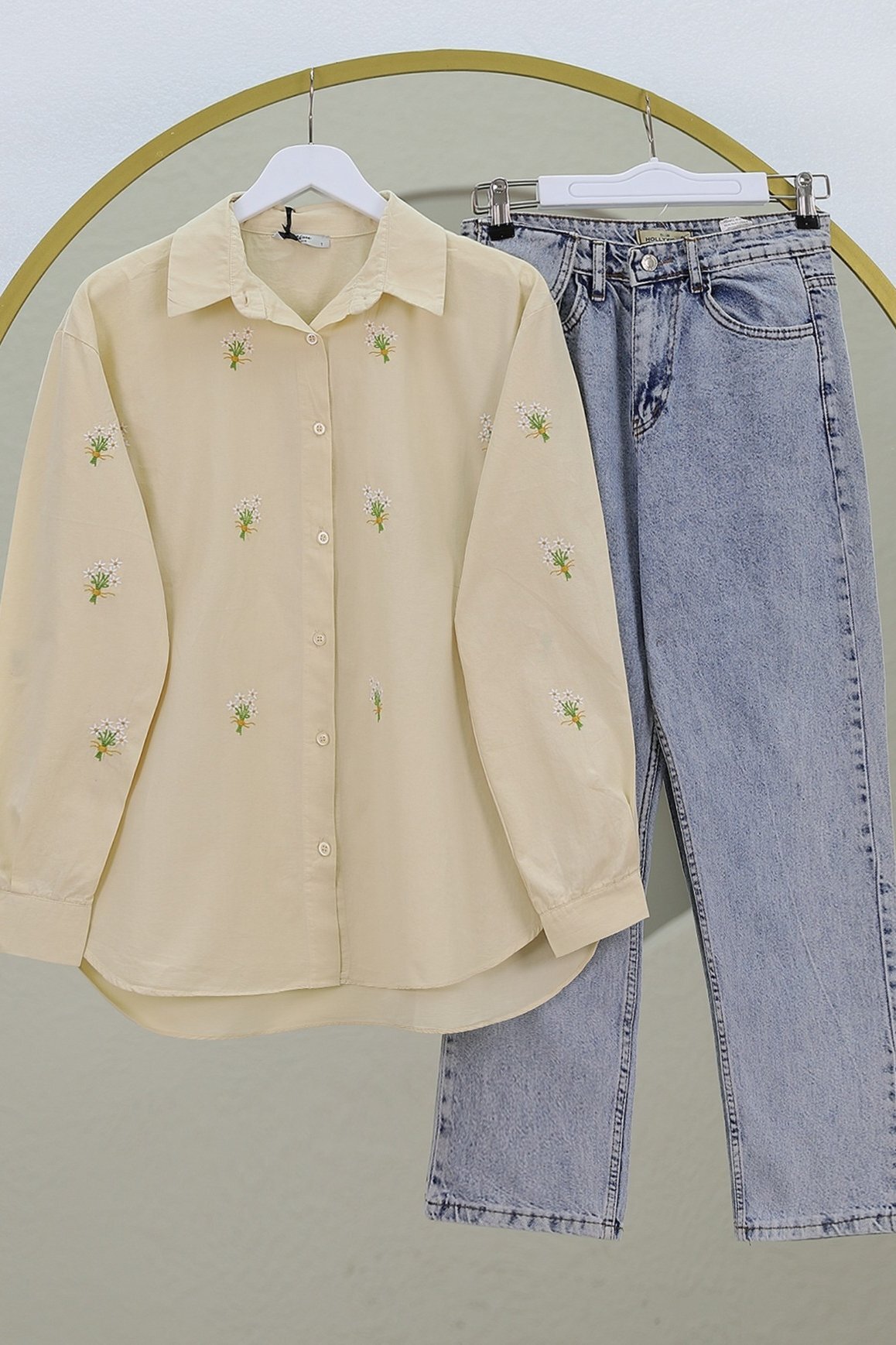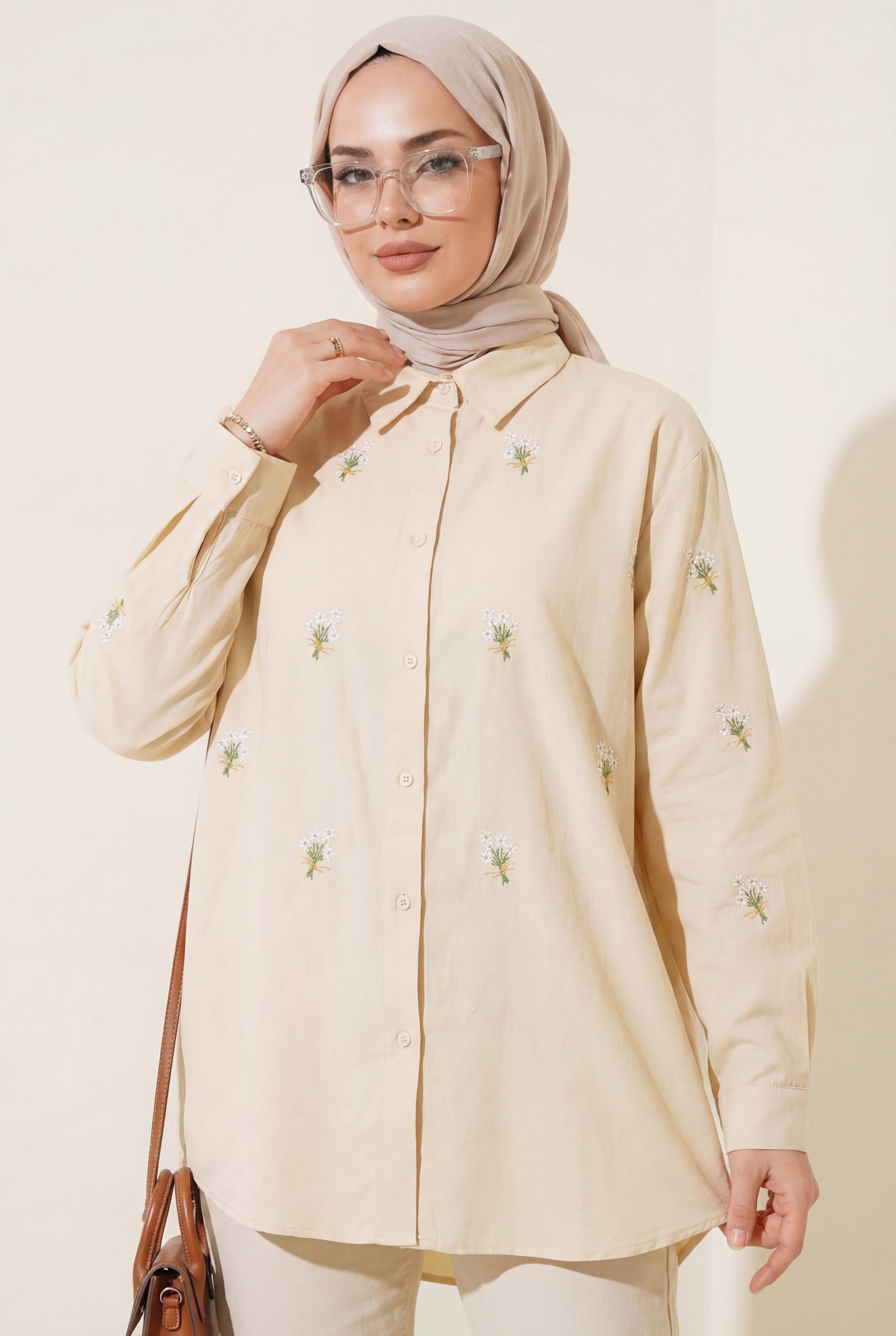 Bouquet Flower Detailed Back Long Shirt - Beige
