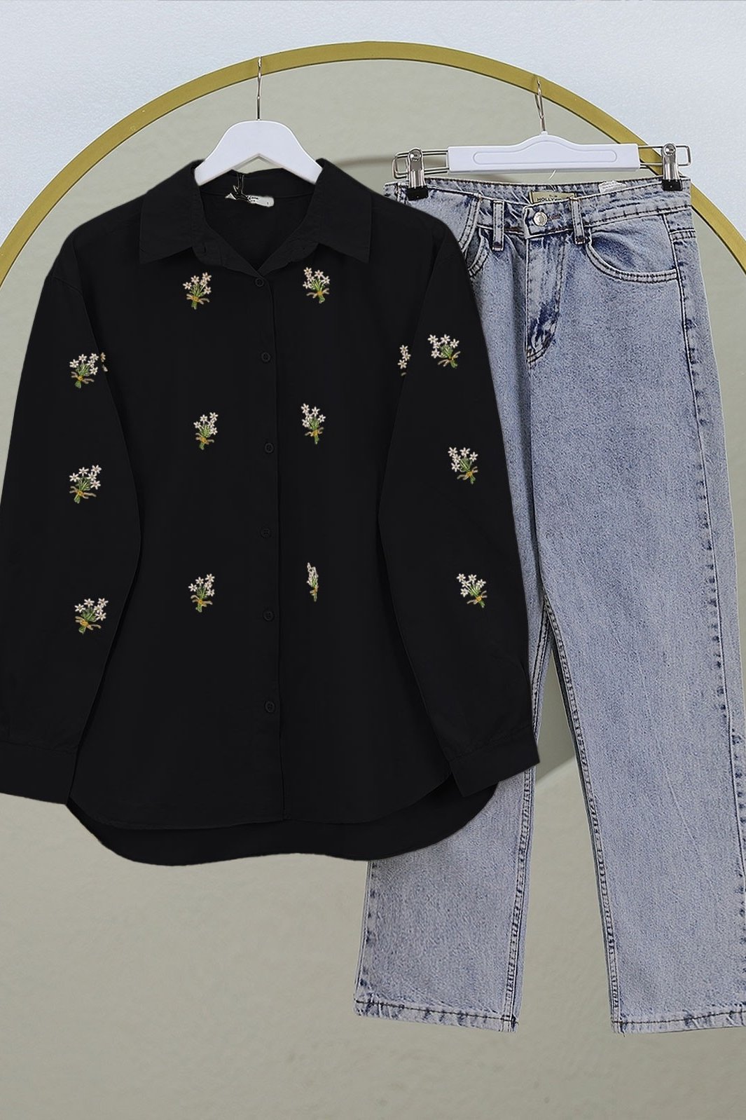 Bouquet Flower Detailed Back Long Shirt -Black