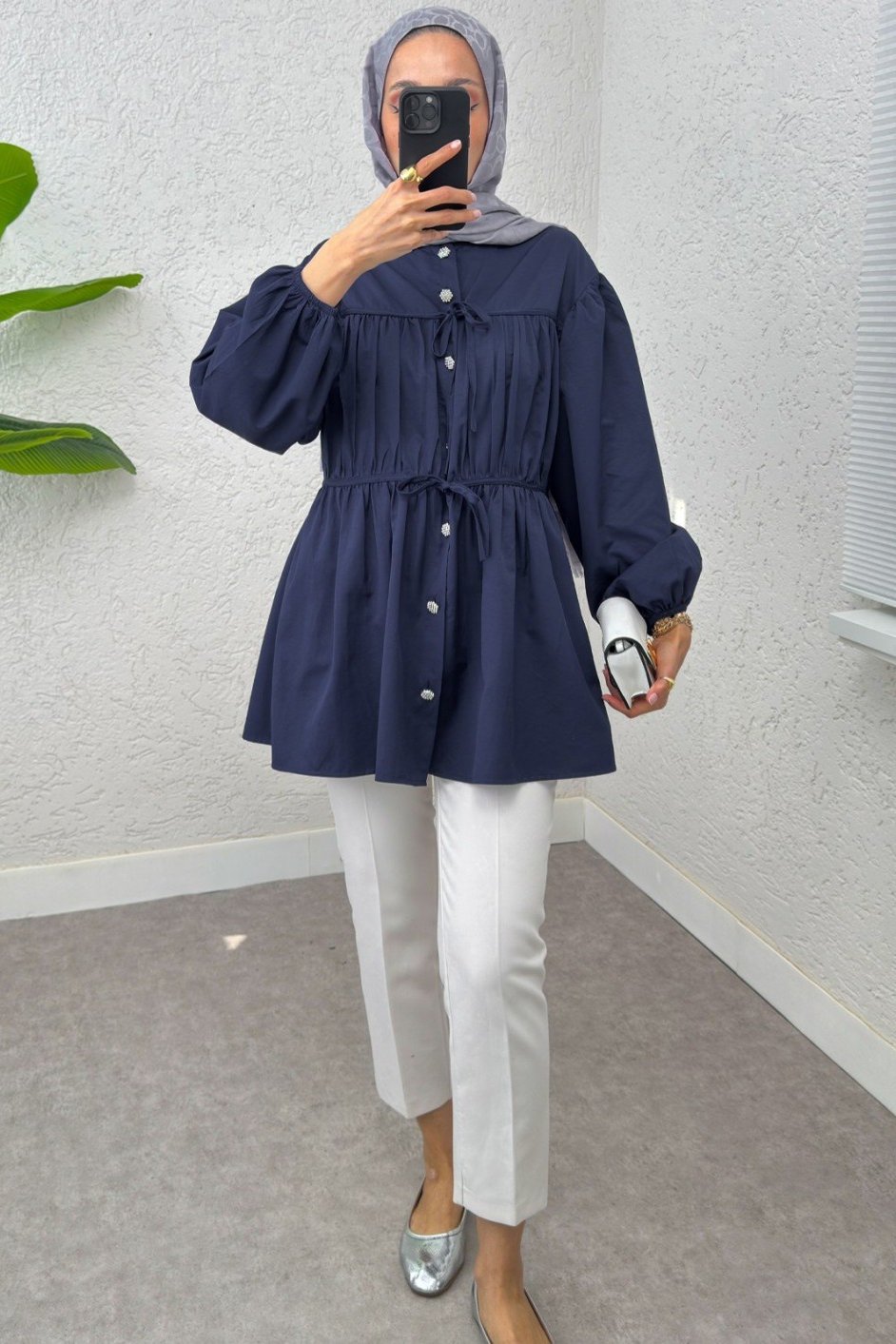 Button-Down Shirt Tunic with Front Lace Detail -Navy blue
