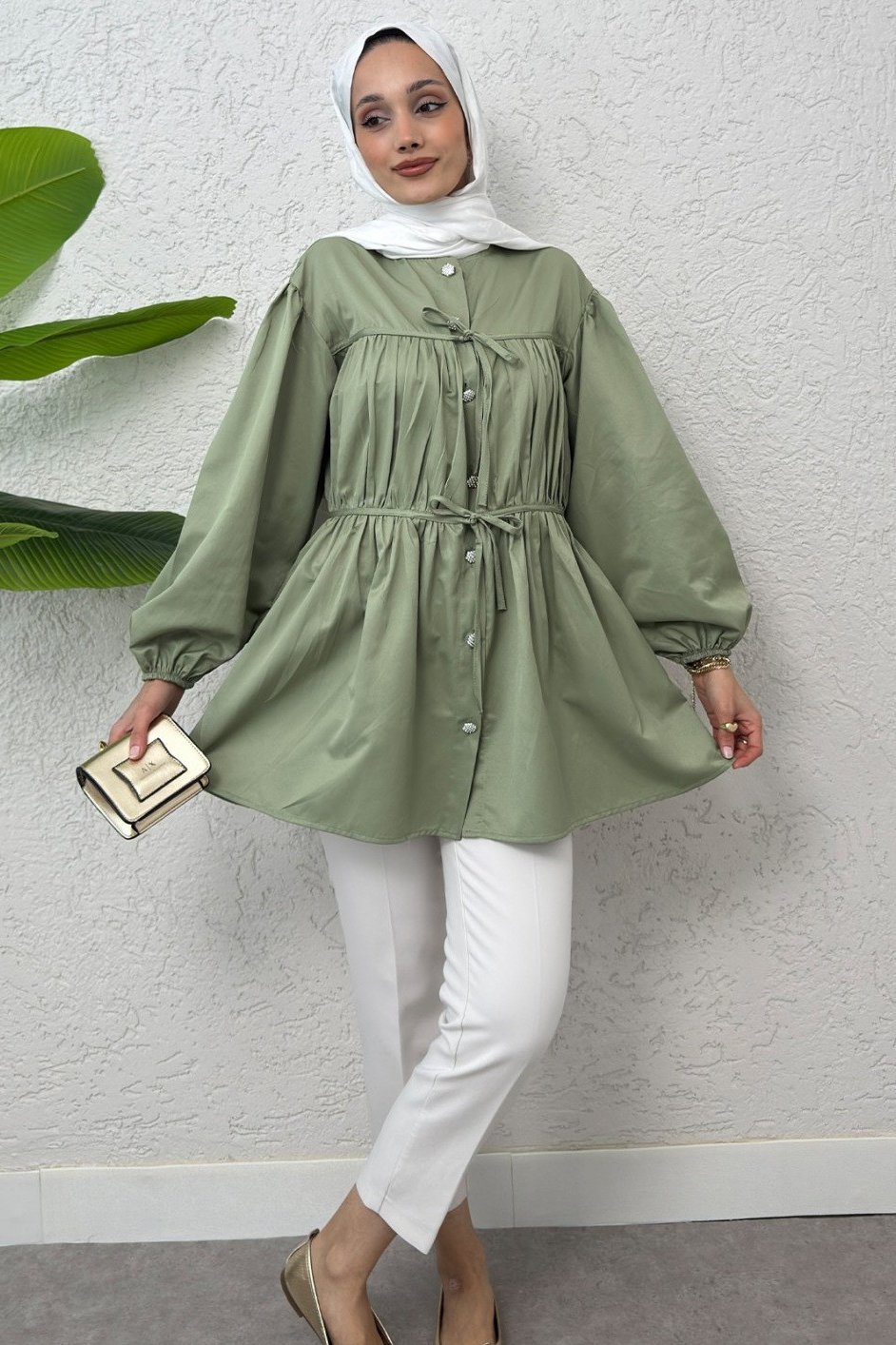 Button-Down Shirt Tunic with Front Lace Detail -Mint Color