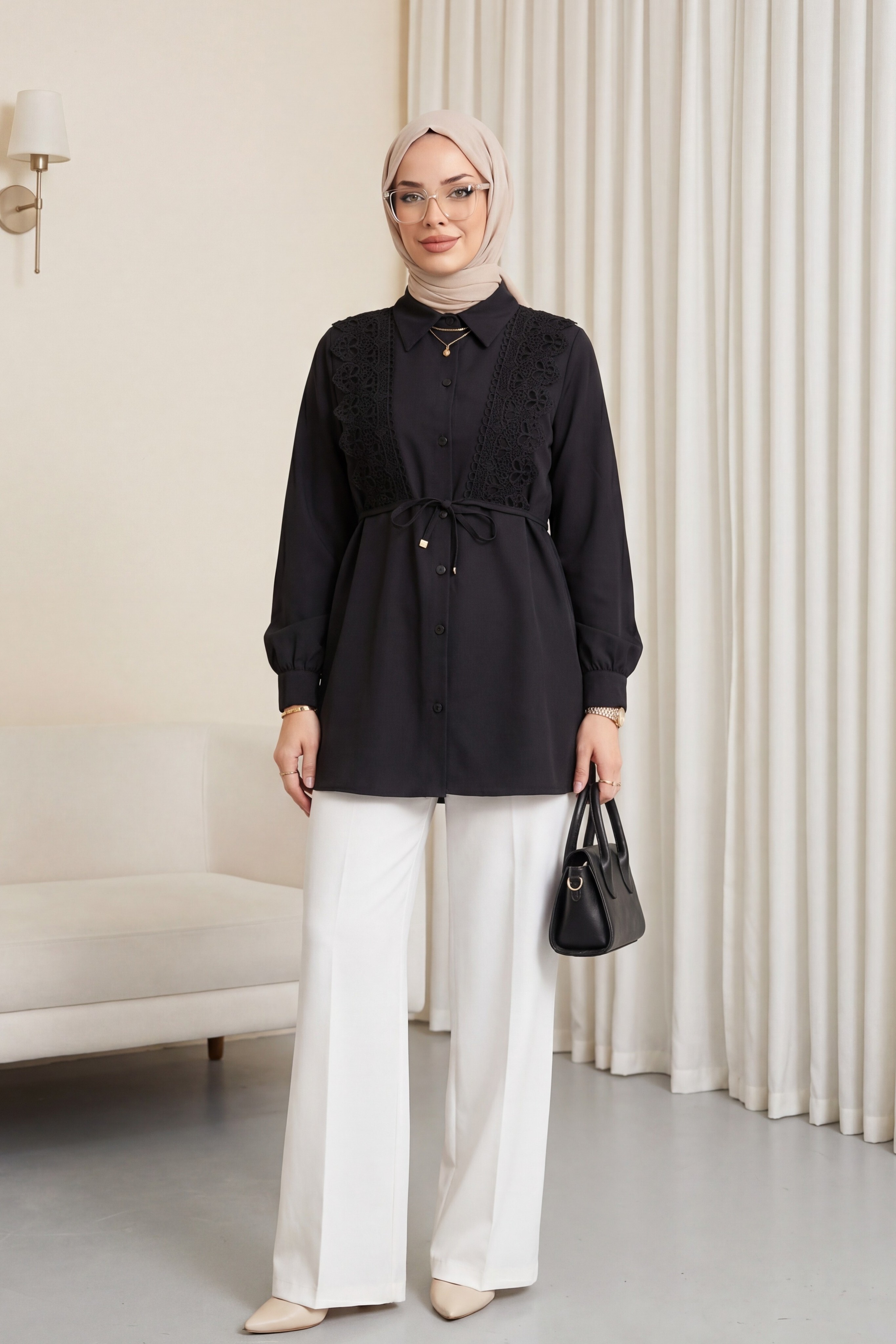 Buttoned Poplin Shirt with Lace Tie Detail at the Front -Black