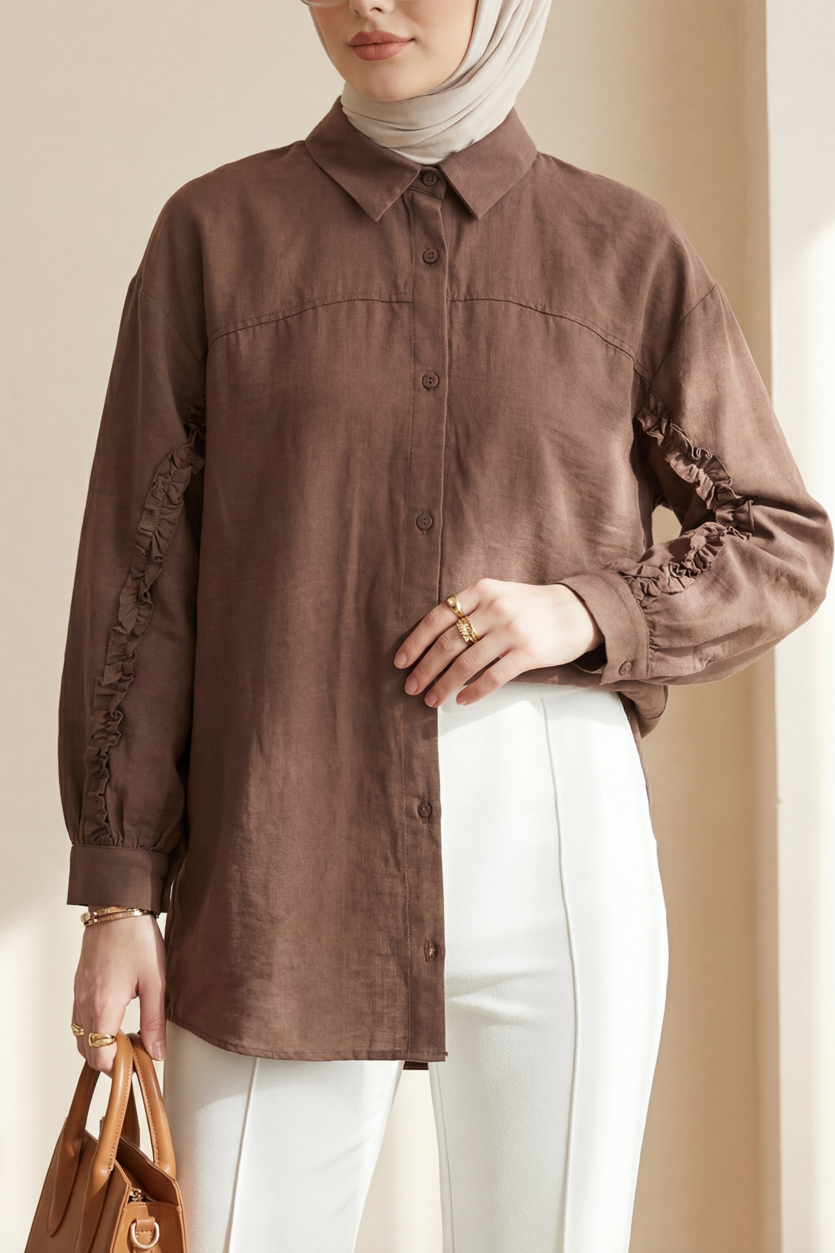 Buttoned Poplin Shirt with Ruffled Sleeves -Brown