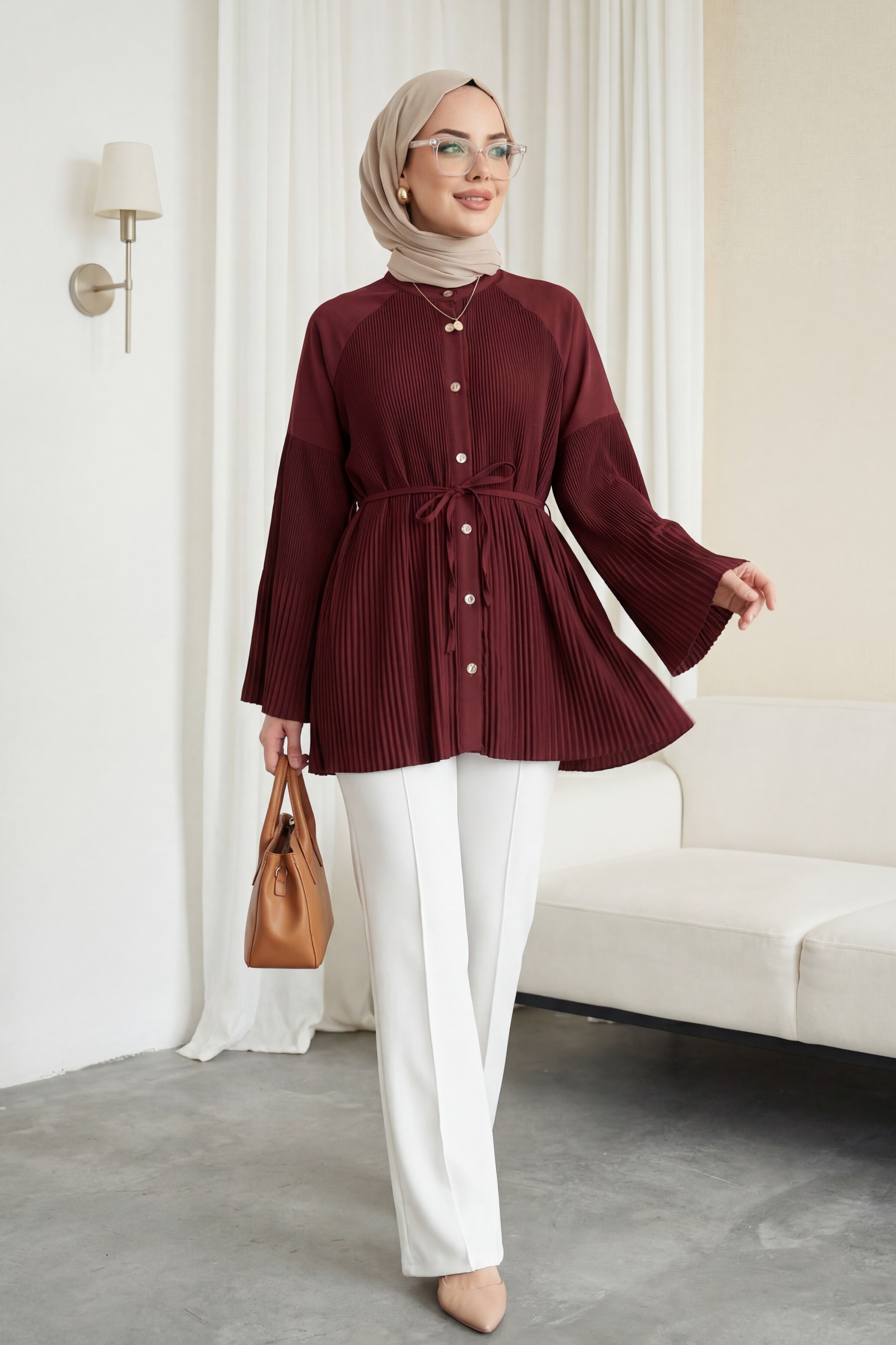 Gold Buttoned Shirt with Pleated Front and Sleeves and Lace-up -Maroon