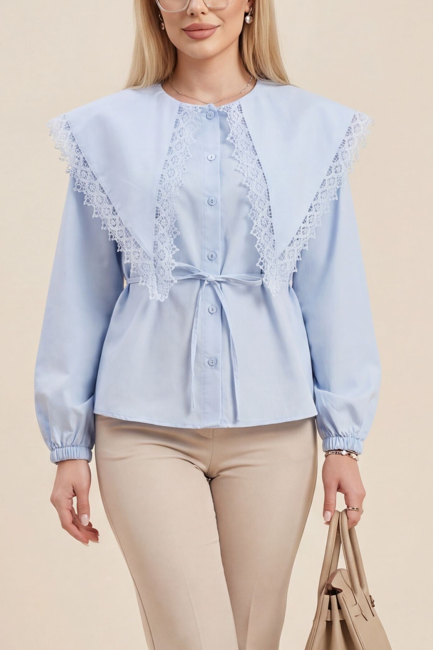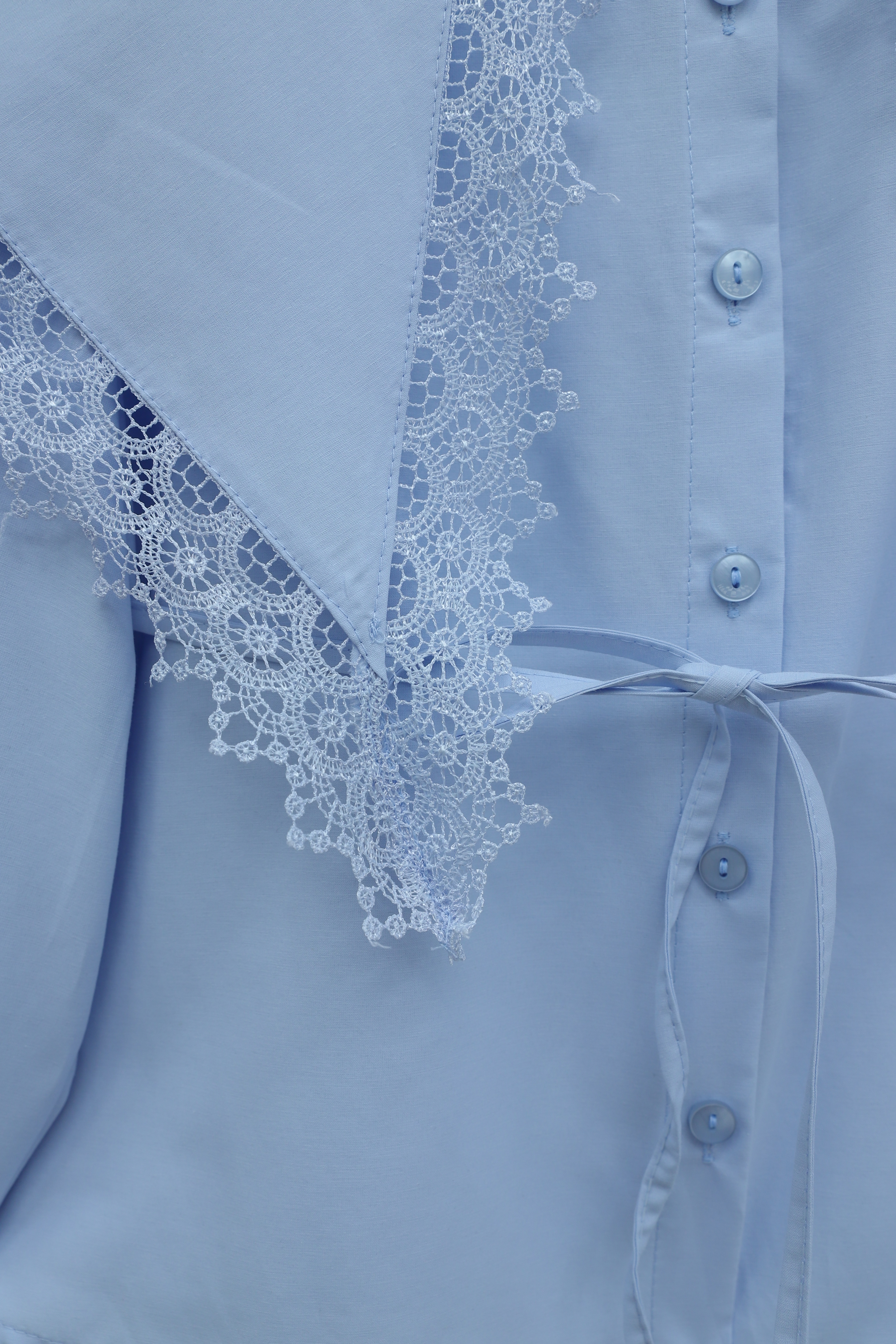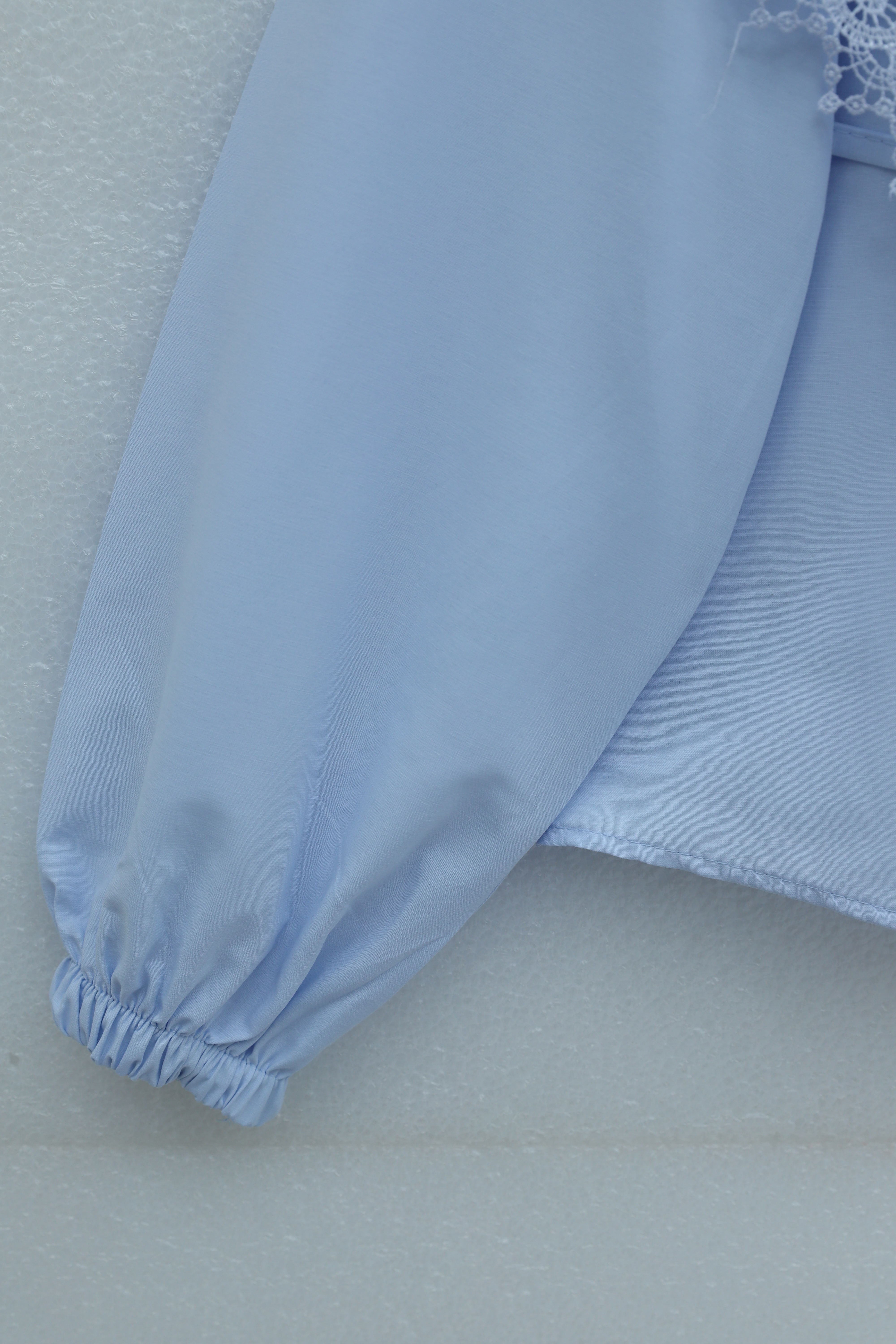 Lace-trimmed Wide-Neck Poplin Shirt with Drawstring and Elasticated Cuffs -Baby Blue