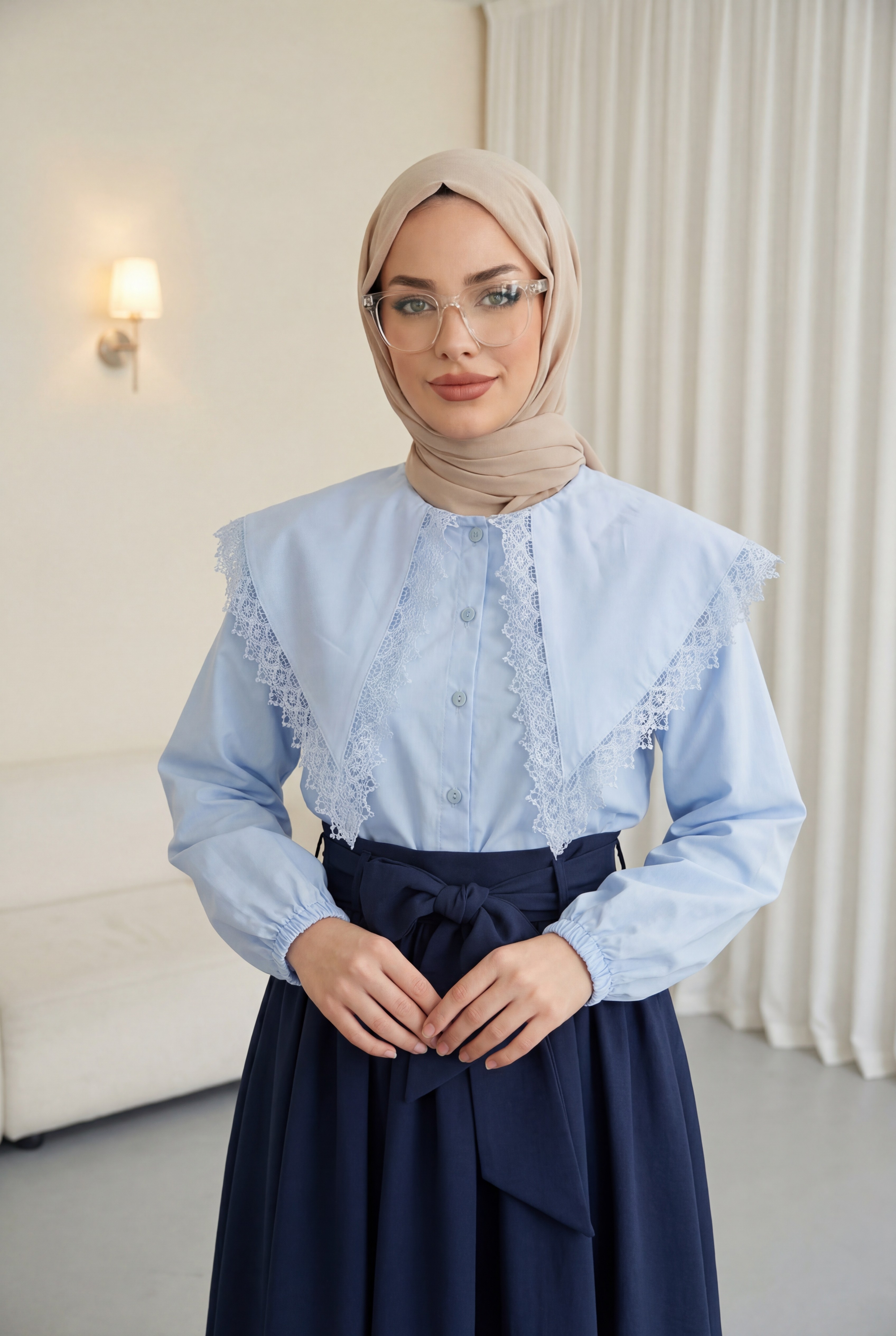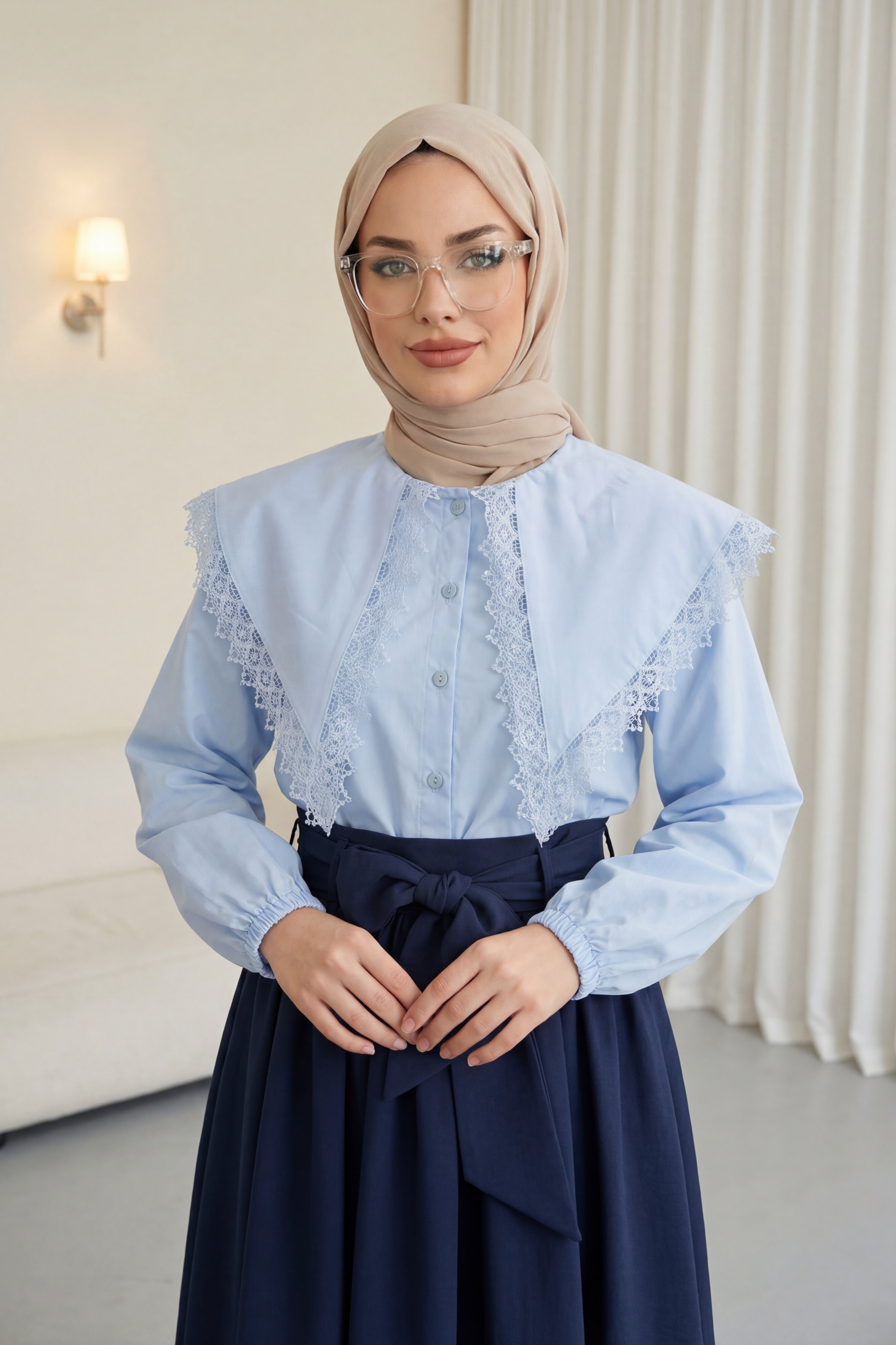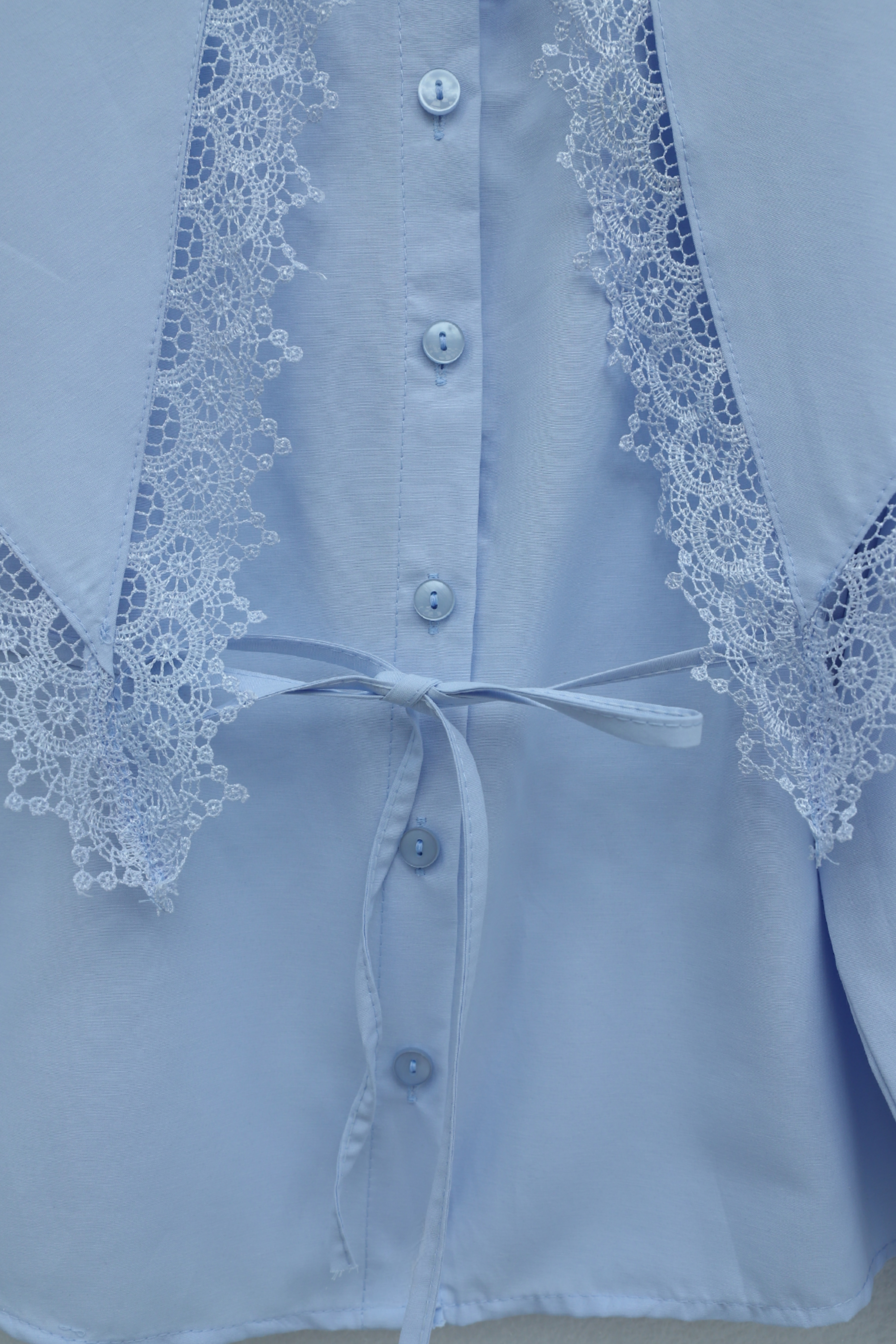 Lace-trimmed Wide-Neck Poplin Shirt with Drawstring and Elasticated Cuffs -Baby Blue