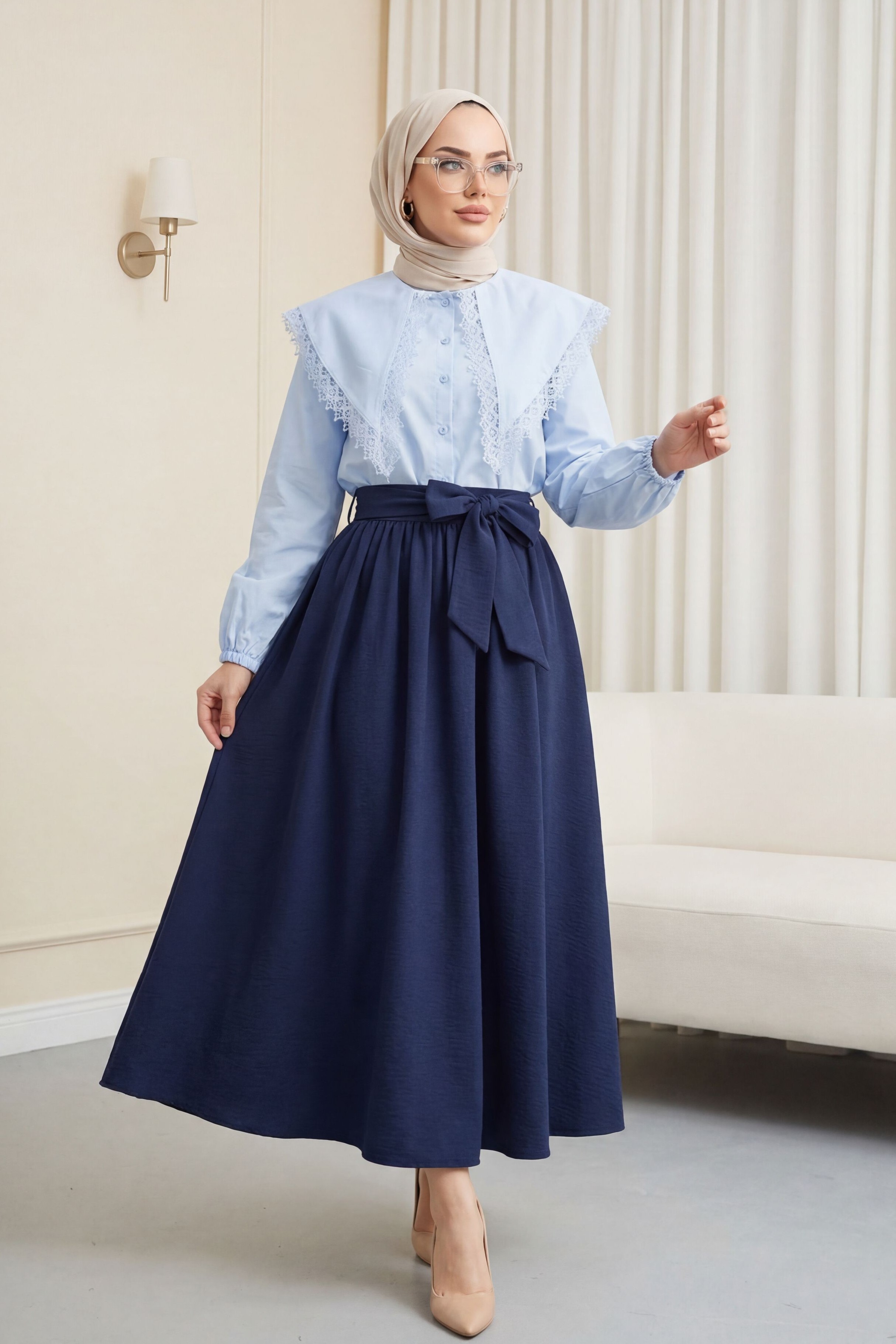 Asymmetrical Crepe Dress with Front Allery Skirt -Blue