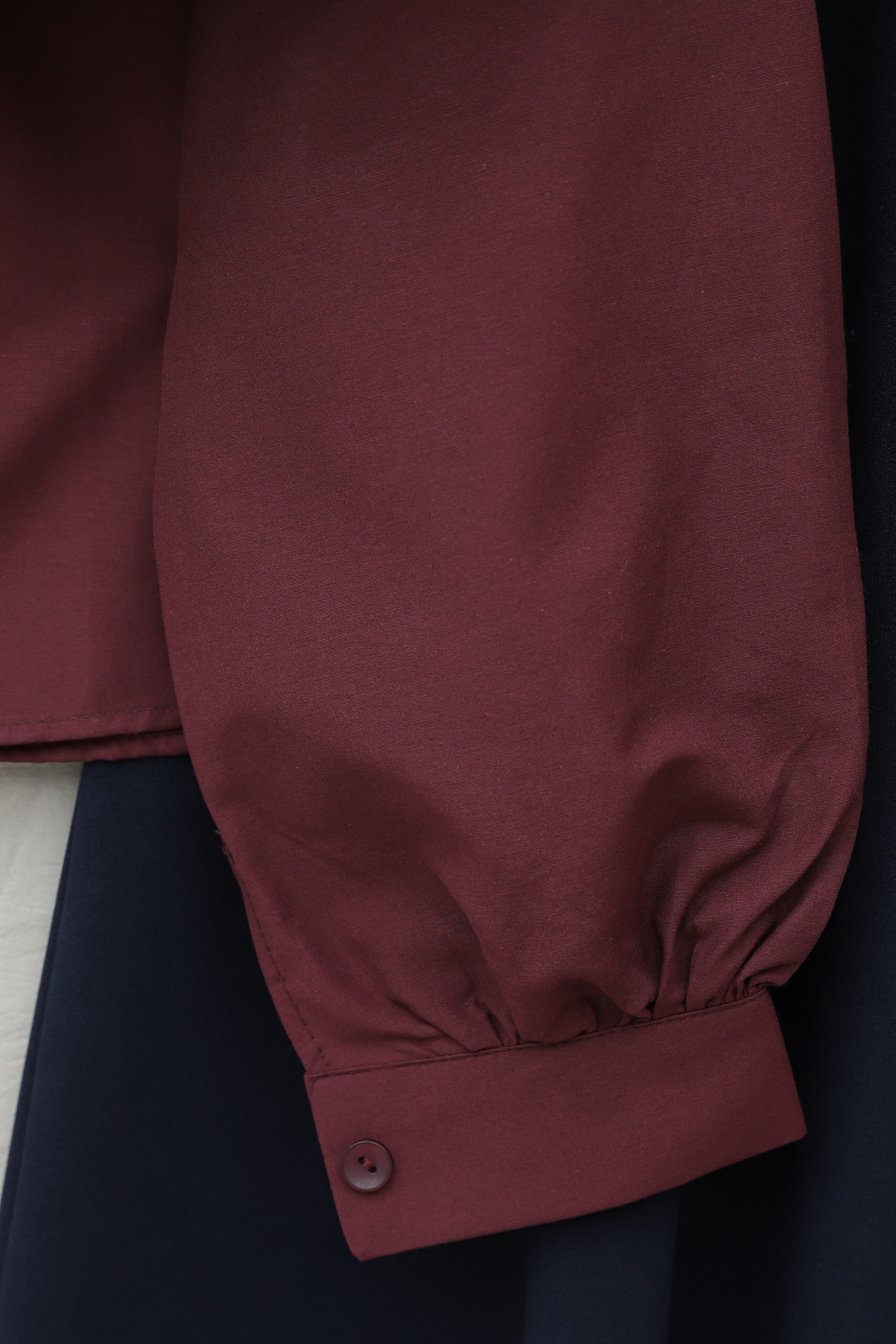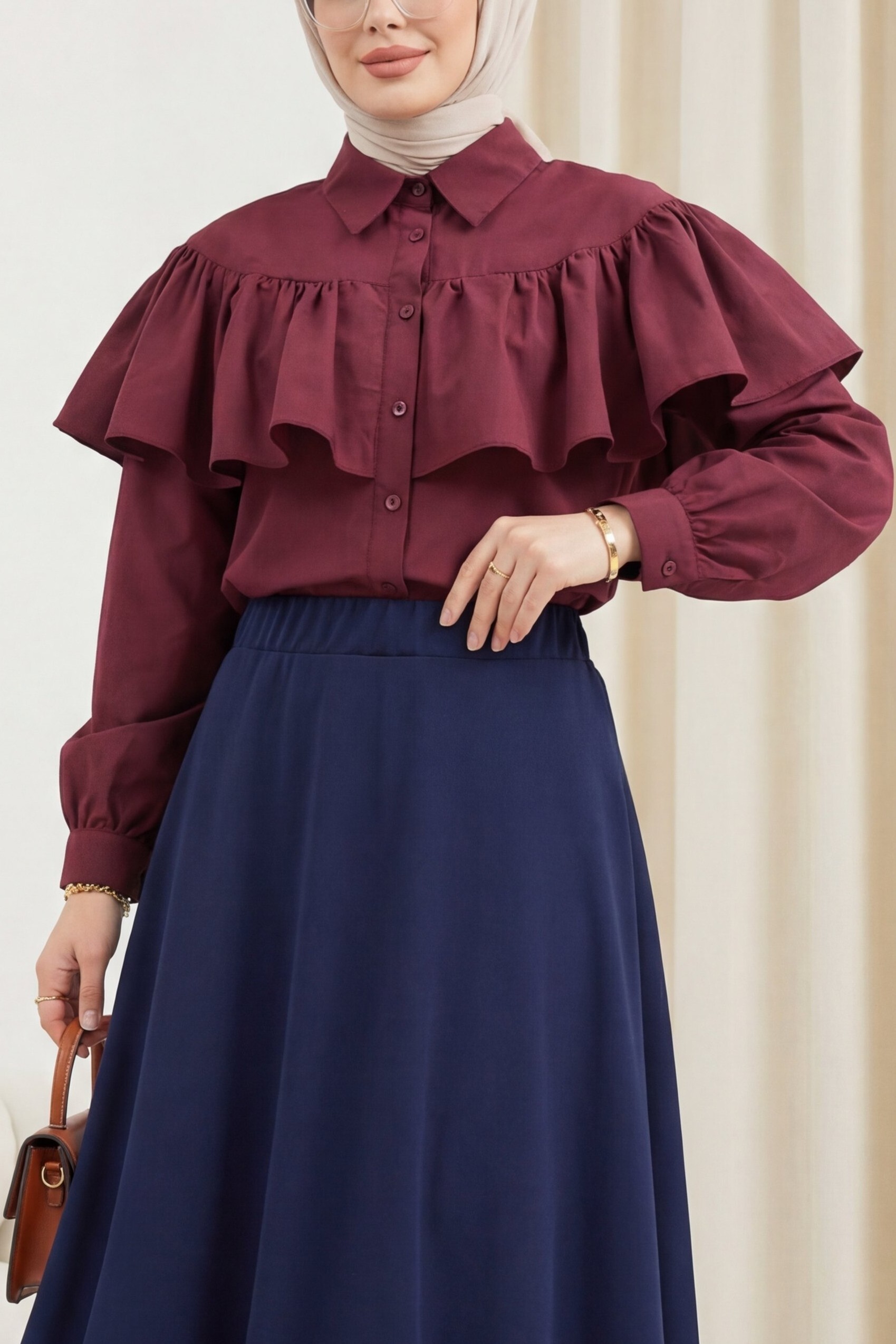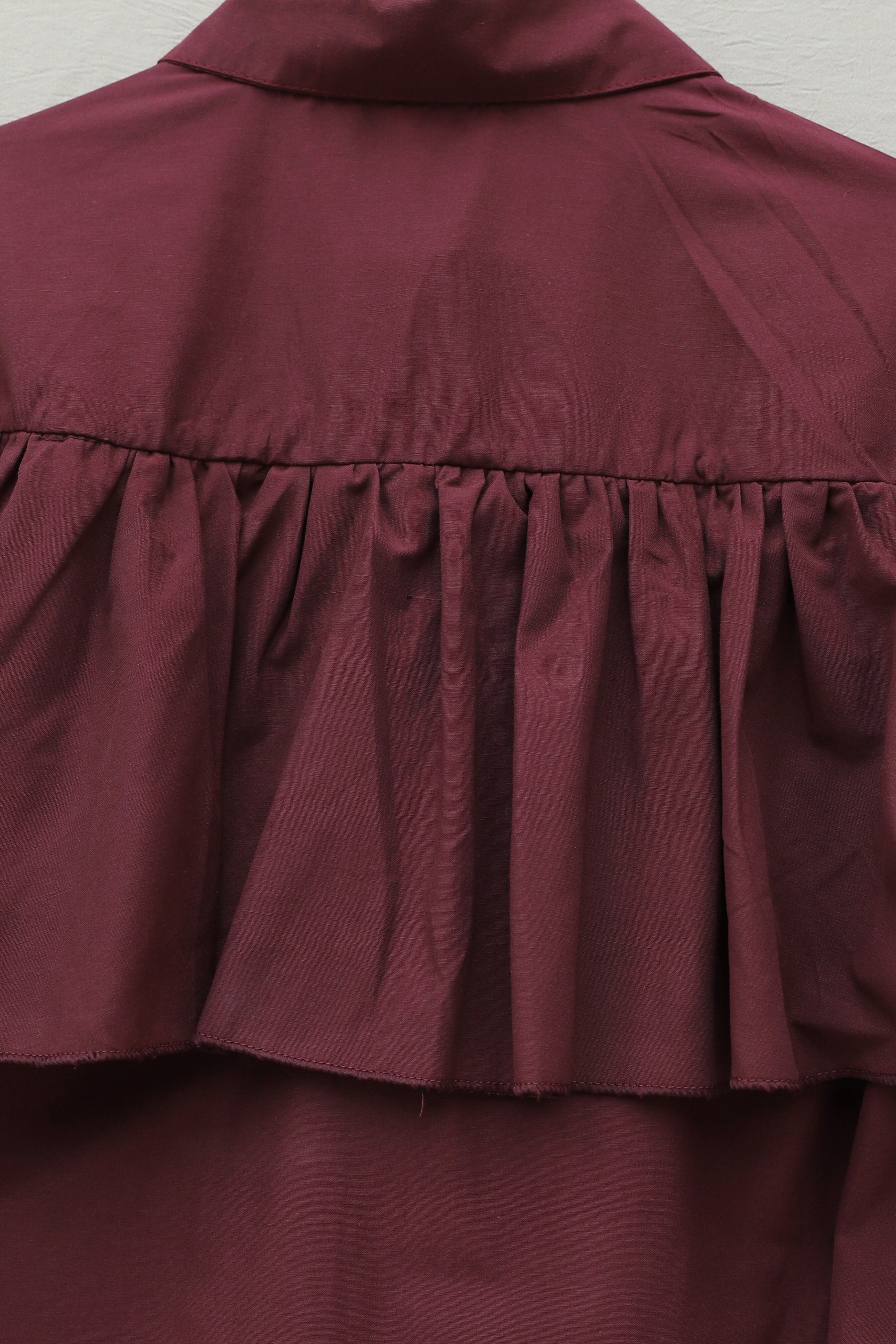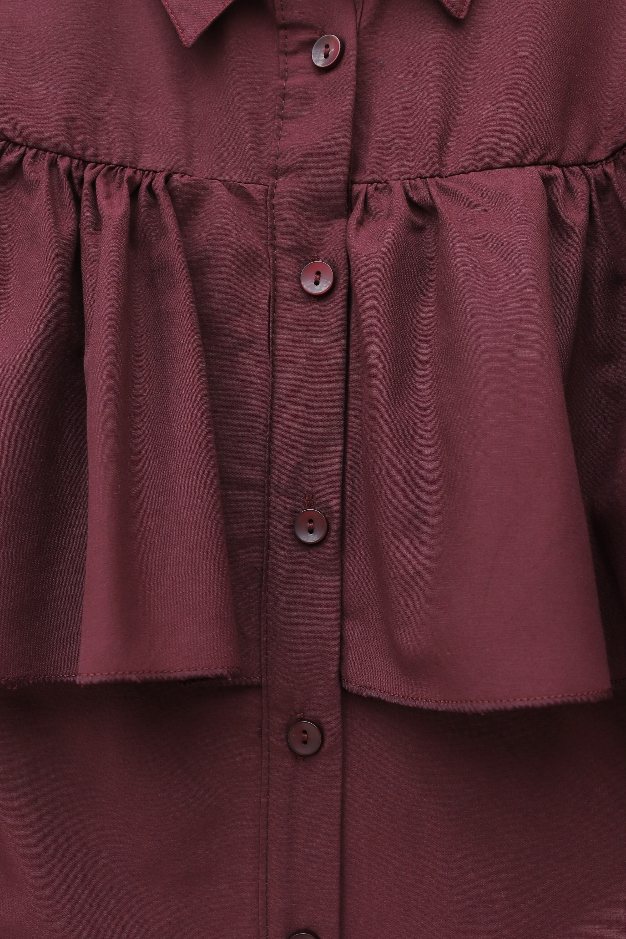 Poplin Shirt Blouse with Ruffle Detail on Front and Shoulders -Maroon