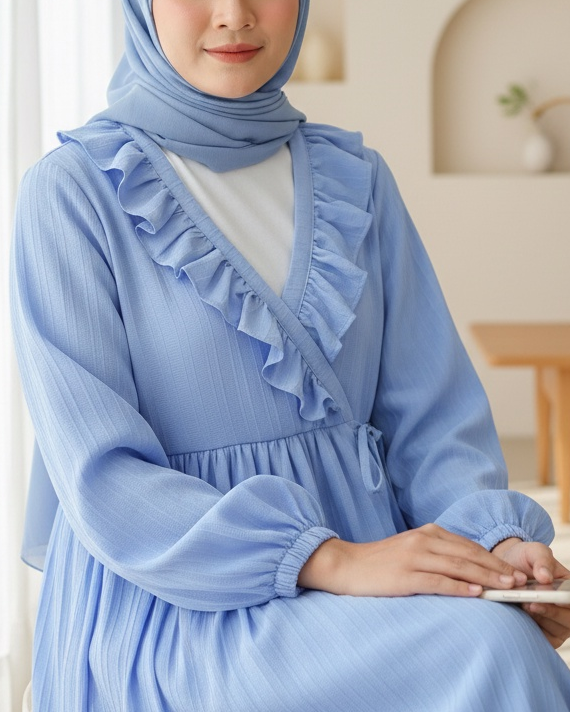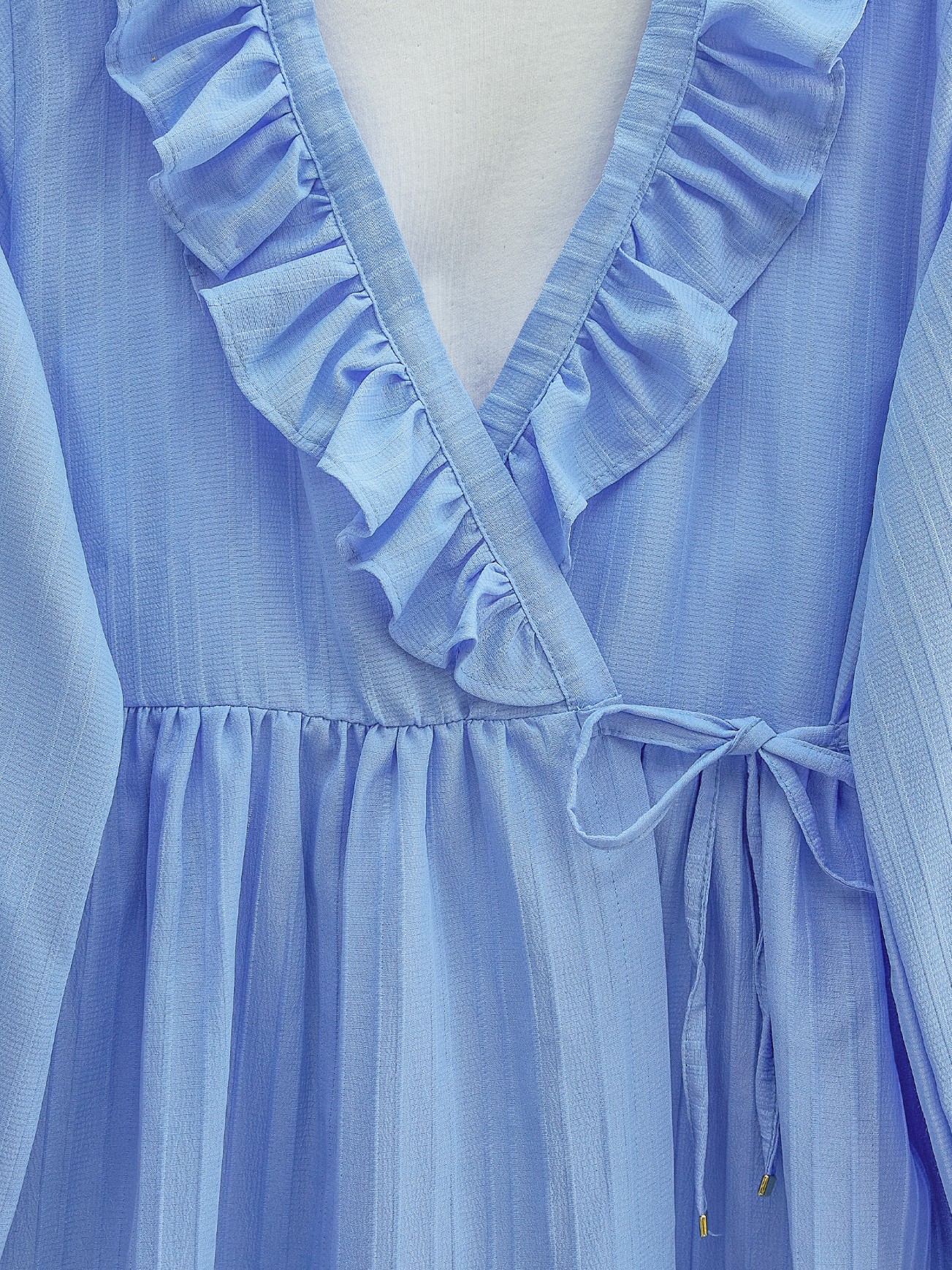 Ruffled Lace-Up Front Elastic Sleeve Kimono -Blue - 398-1031-R31