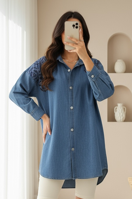 Sequin Detailed Denim Shirt with Buttons on the Front -İndigo