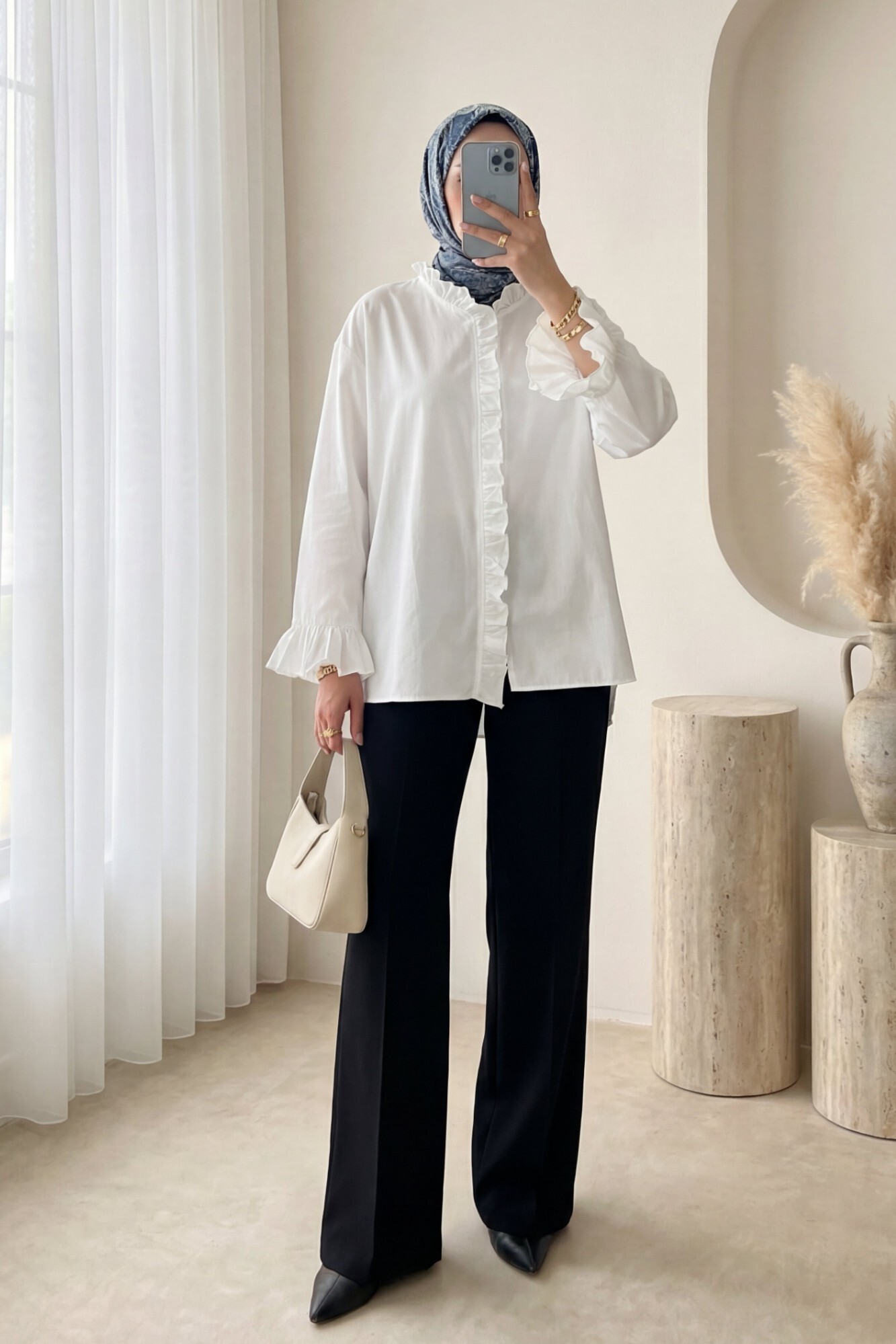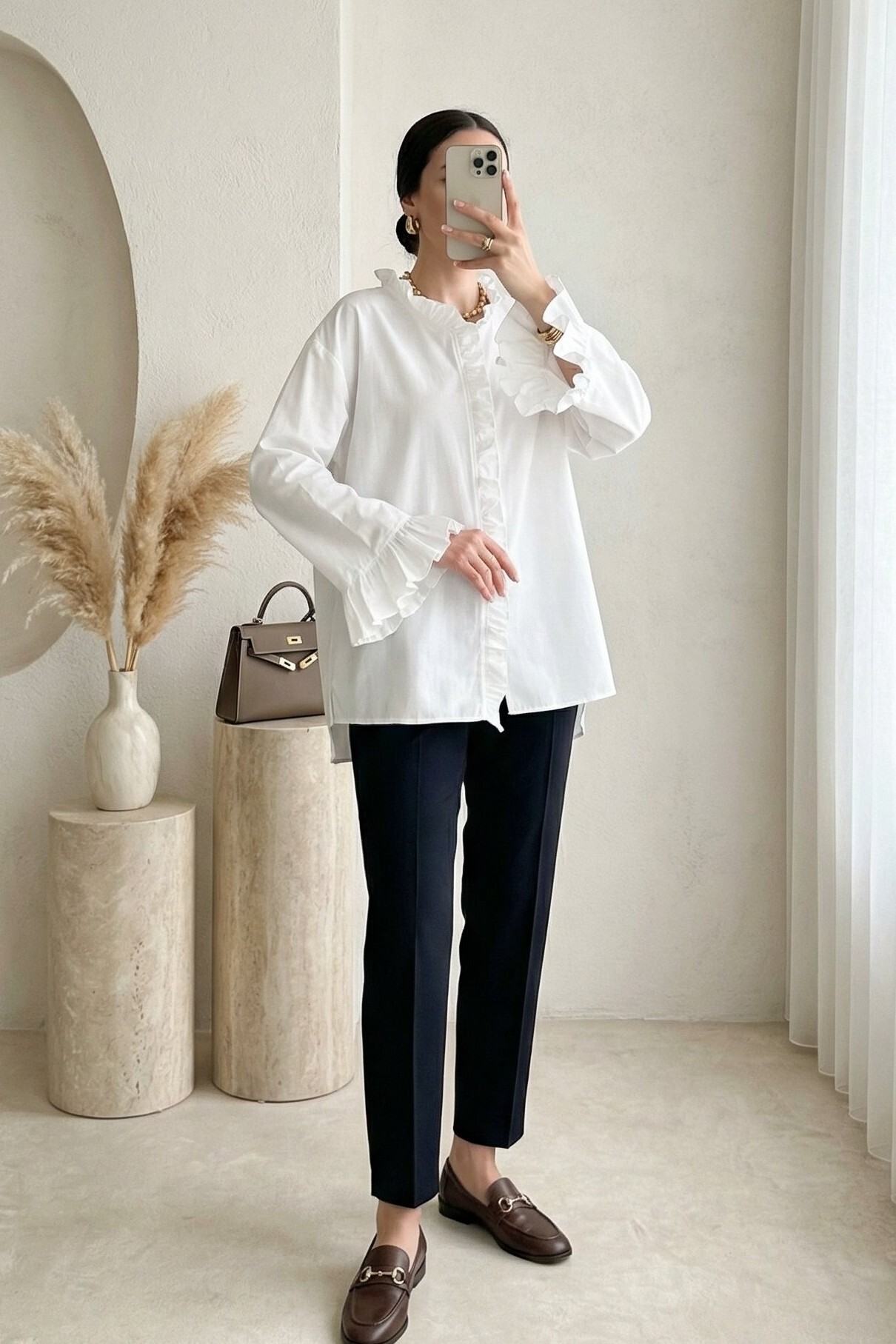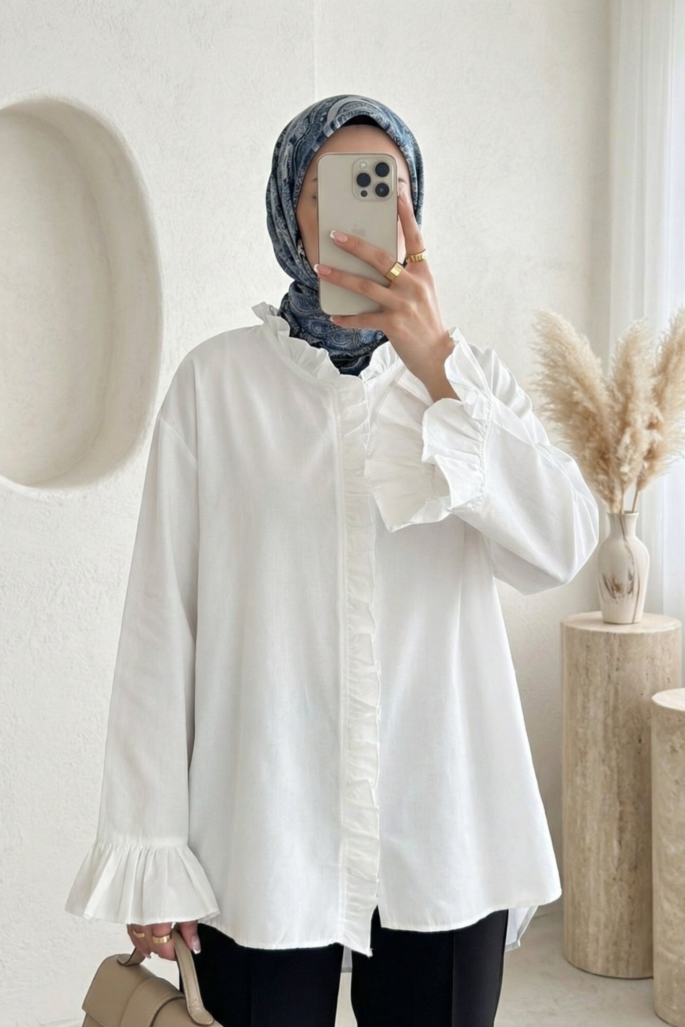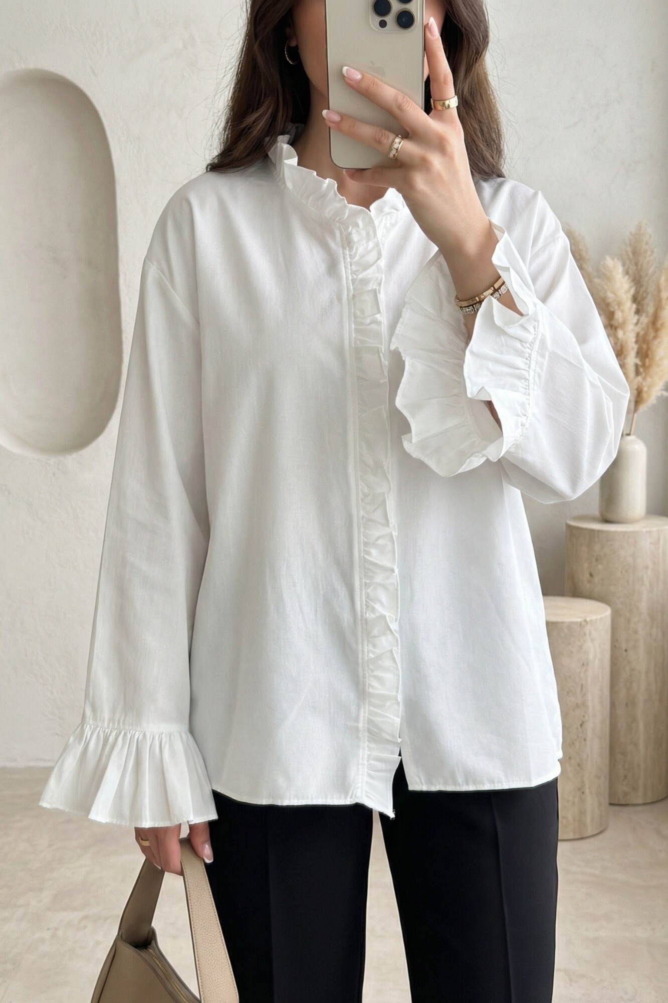 Shirt with Long Back, Long Sleeves and Ruffles at the Front -White