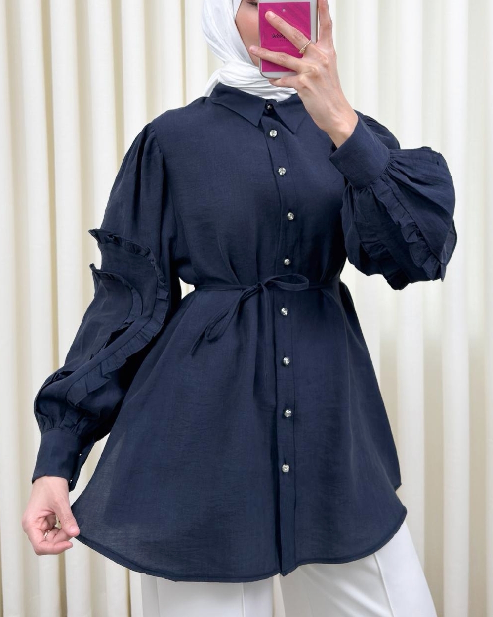 Shirt with Ruffled Sleeves, Rhinestone Embellished Buttons and Tie Closure -Navy blue