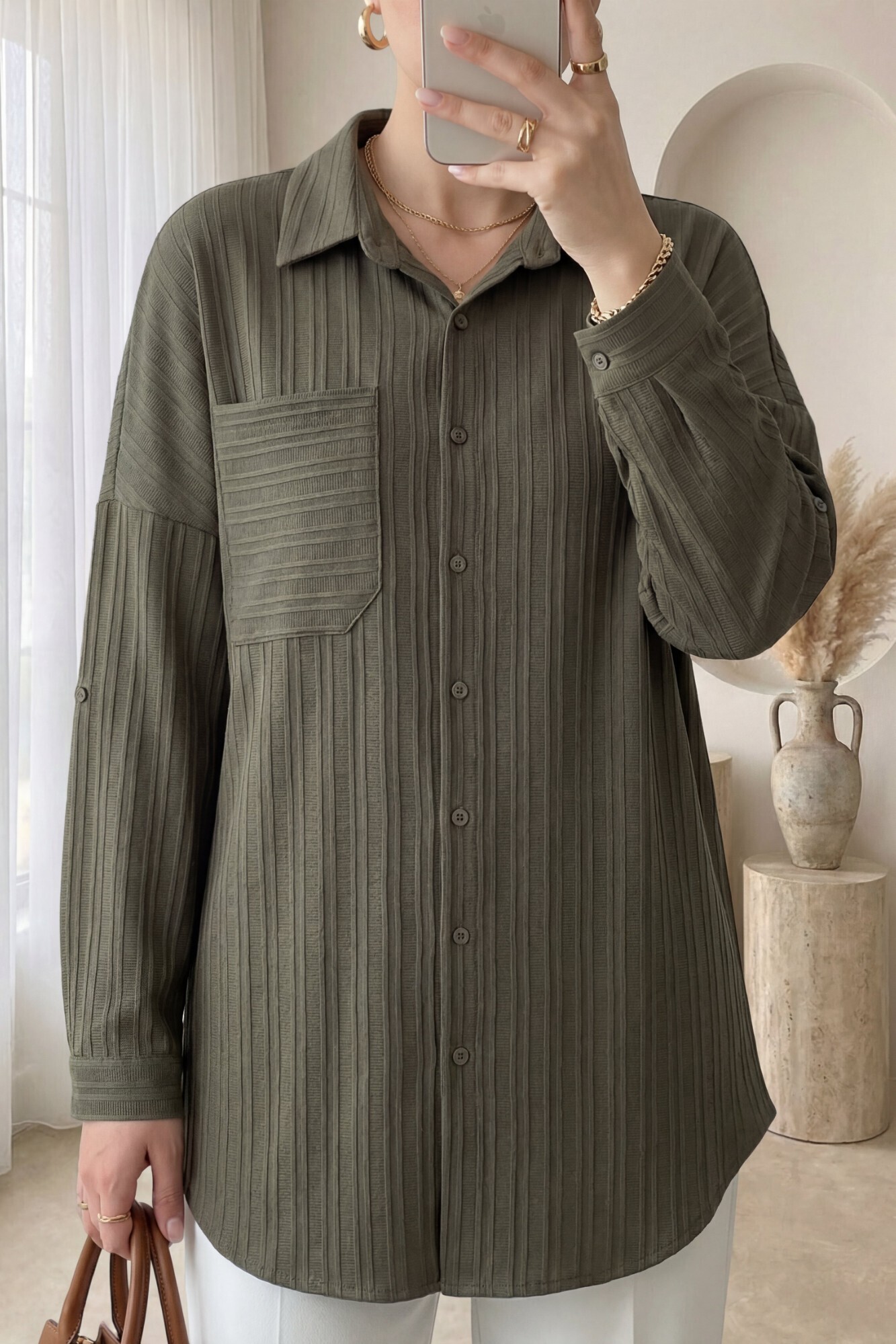 Single Pocket Striped Crinkle Shirt -Khaki