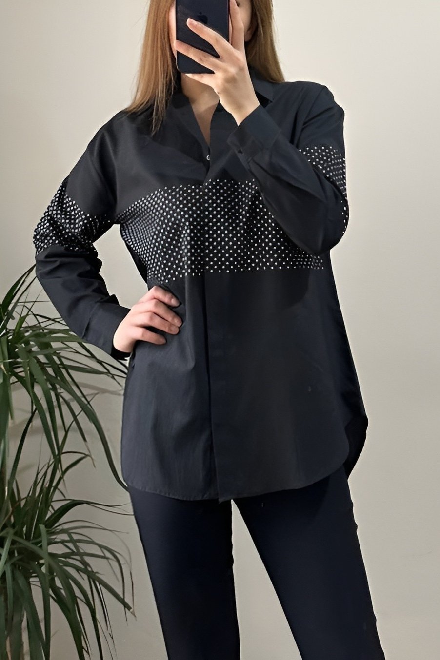 The Stone-Detail Front Poplin Shirt is a must-have piece for your wardrobe, offering elegant details and a chic design. The stone embellishments add a sophisticated look, while the poplin fabric ensures comfort and breathability. Perfect for both everyday outfits and special occasions, this shirt is an ideal choice for those seeking a modern and refined style.