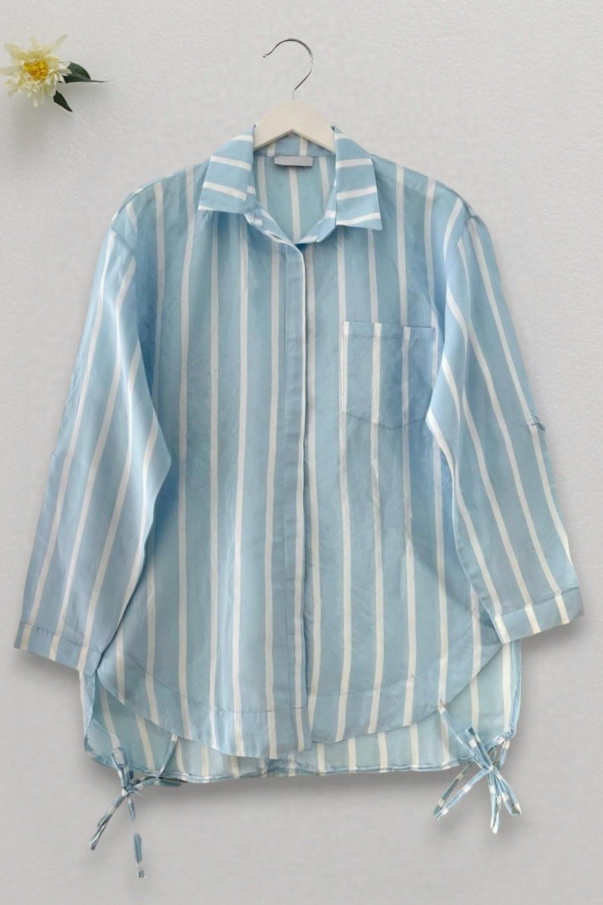 The Side-Tie Pocket Striped Shirt features a modern design that combines style and comfort. The side tie detail adds a dynamic touch, while the pocket design provides functionality. The striped pattern offers timeless elegance and suits any season. The lightweight fabric keeps you cool during the summer and provides a comfortable wearing experience. Perfect for casual wear or creating a chic look, this shirt gives you a graceful and relaxed appearance.