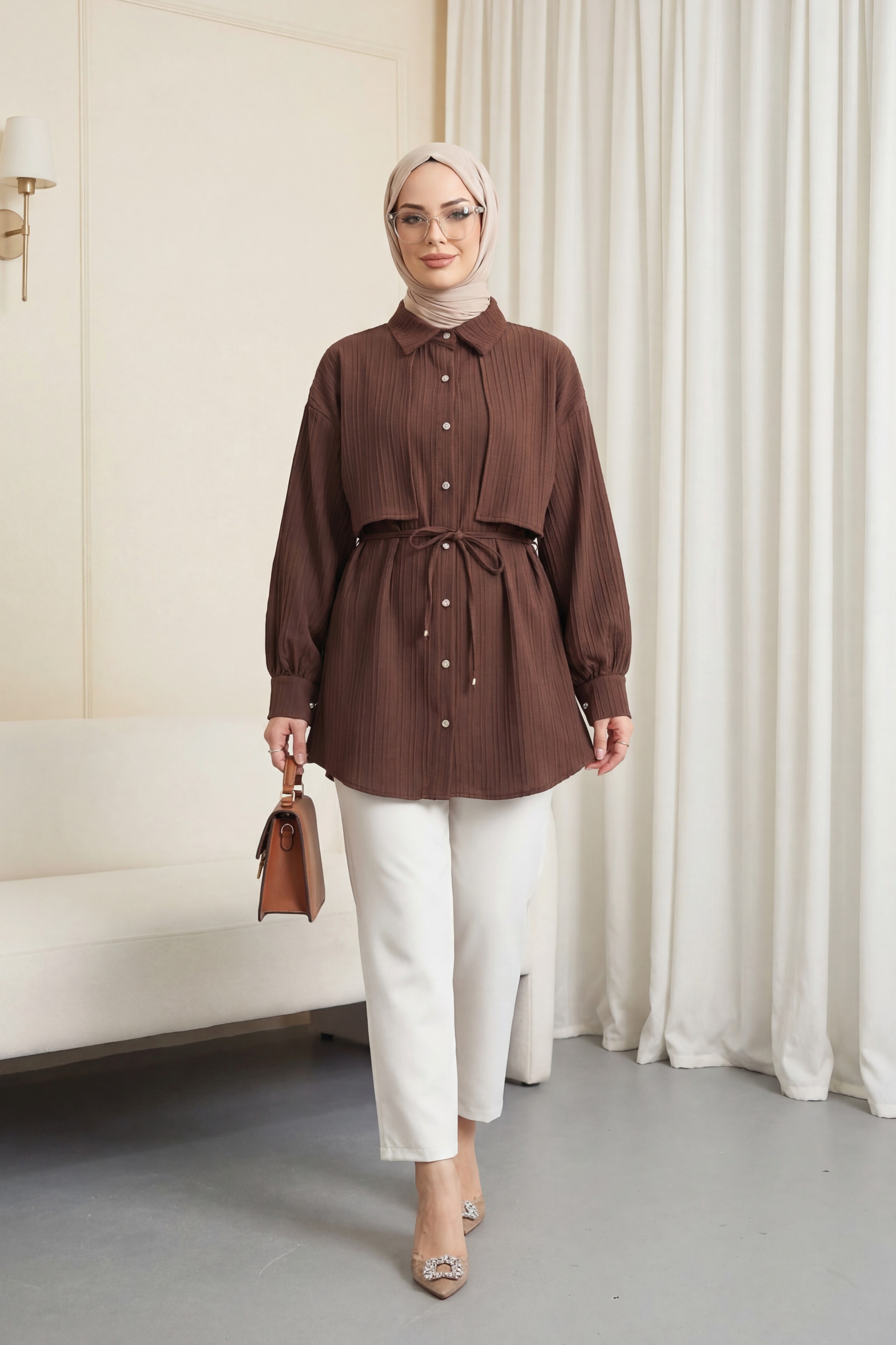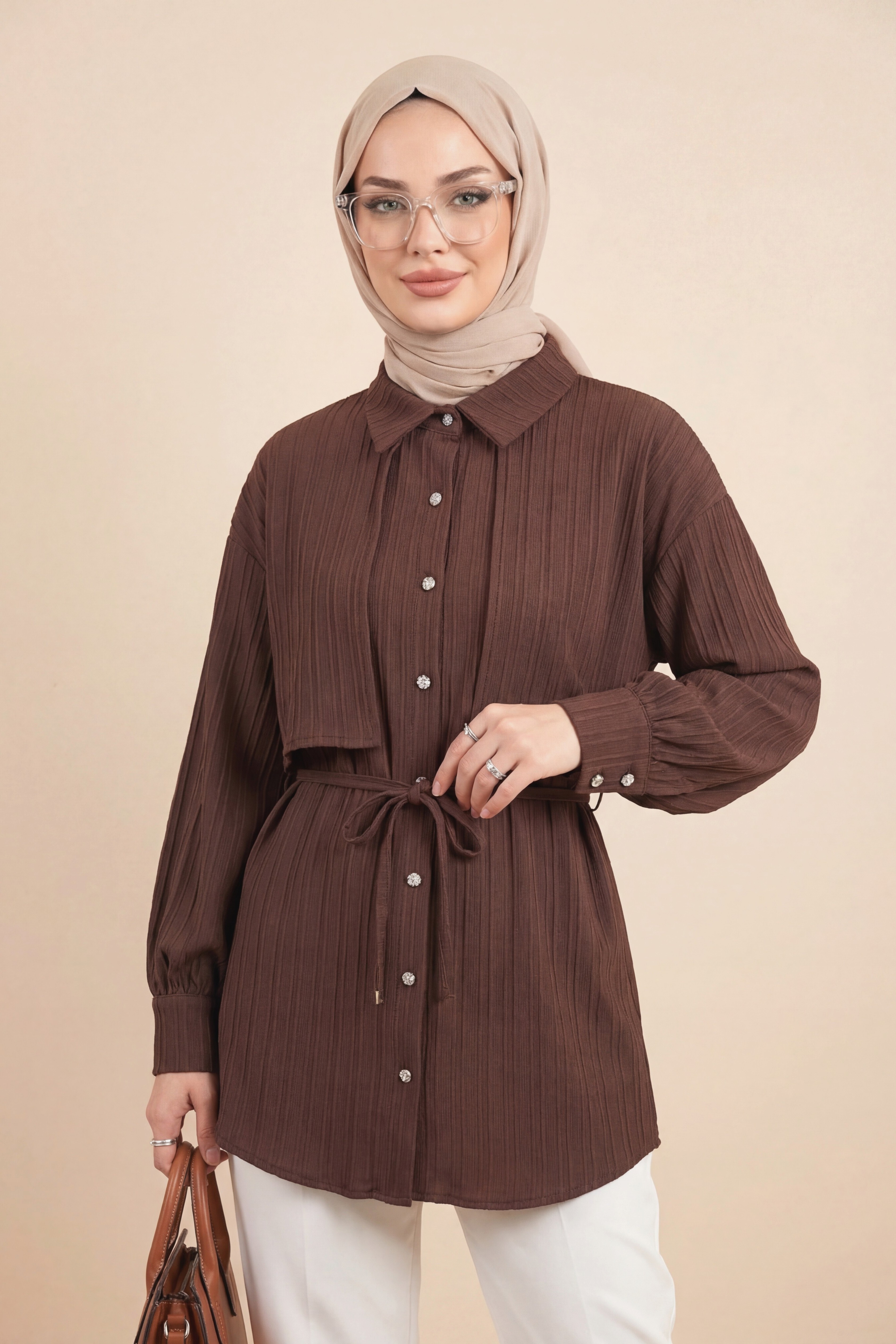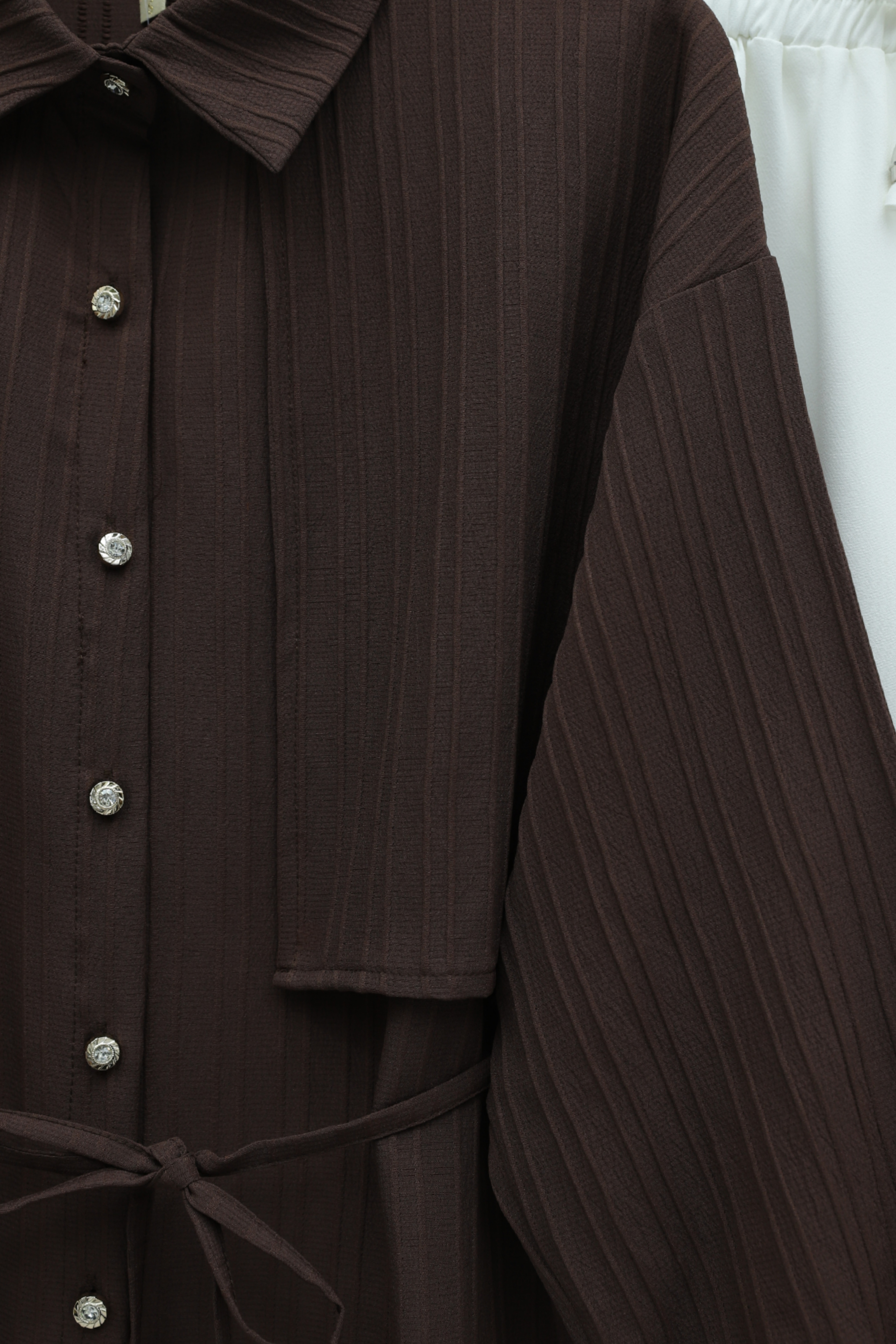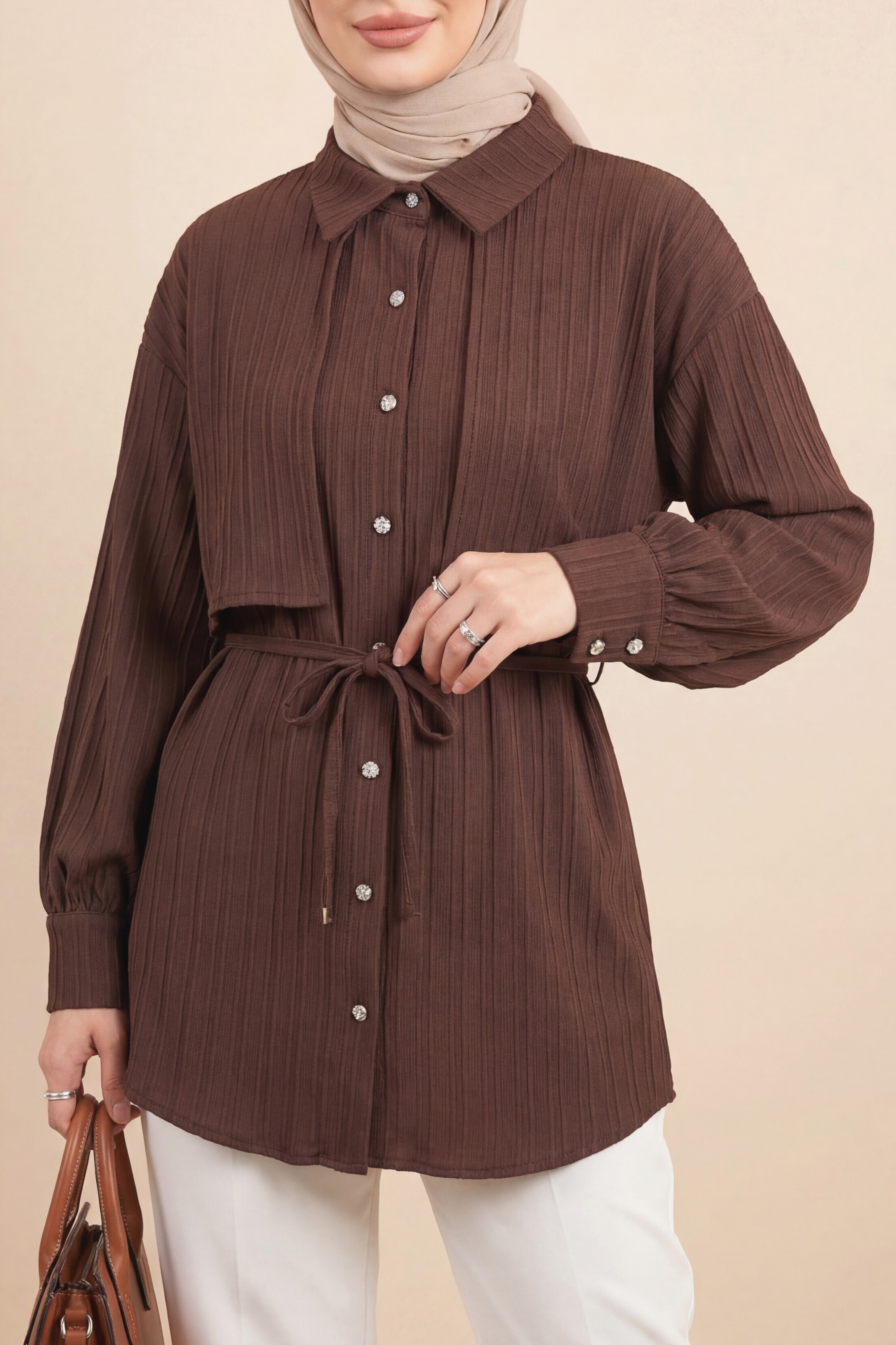 Tied Waist Bolero Detailed Stoned Button -Dark Coffee