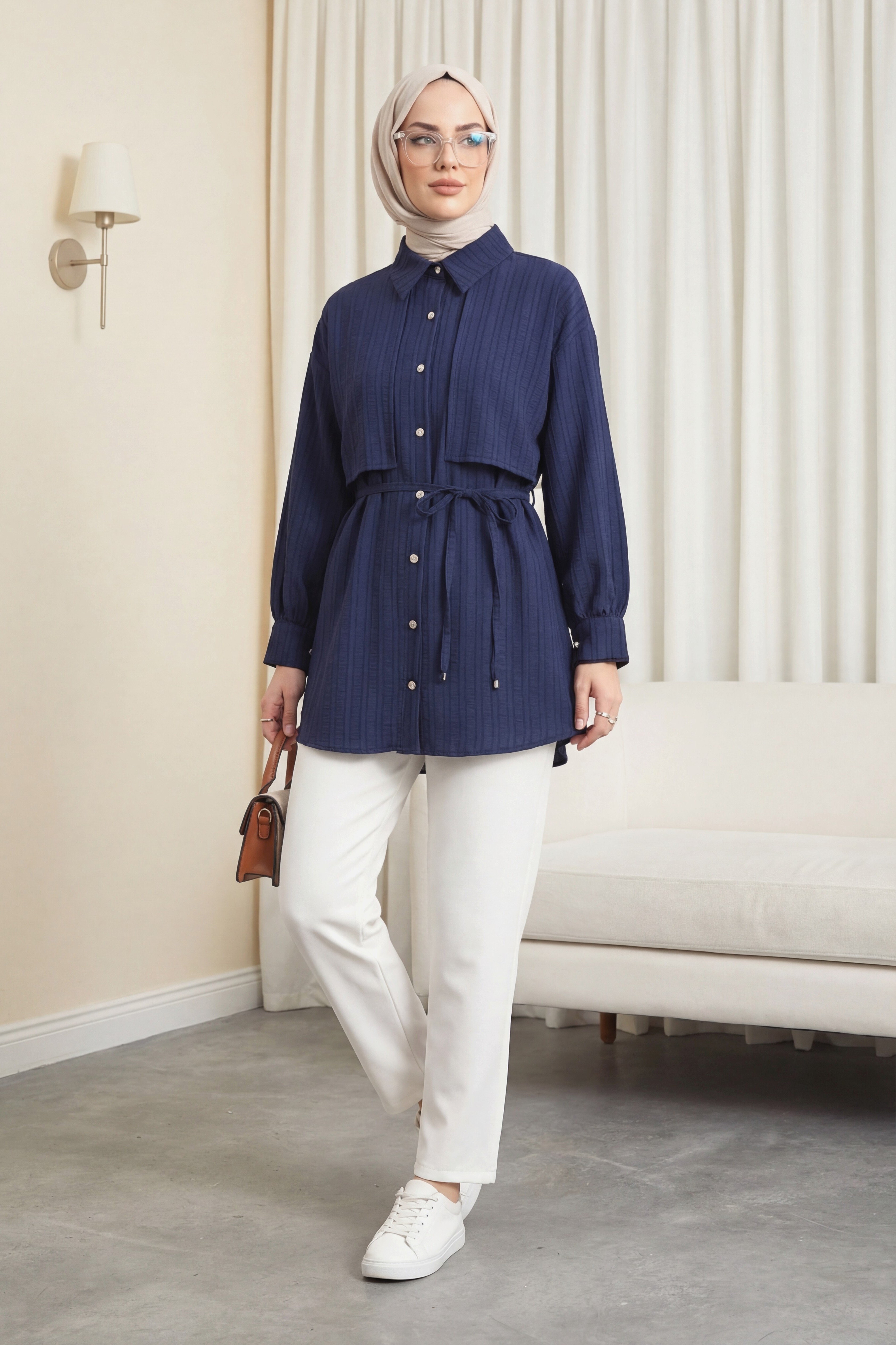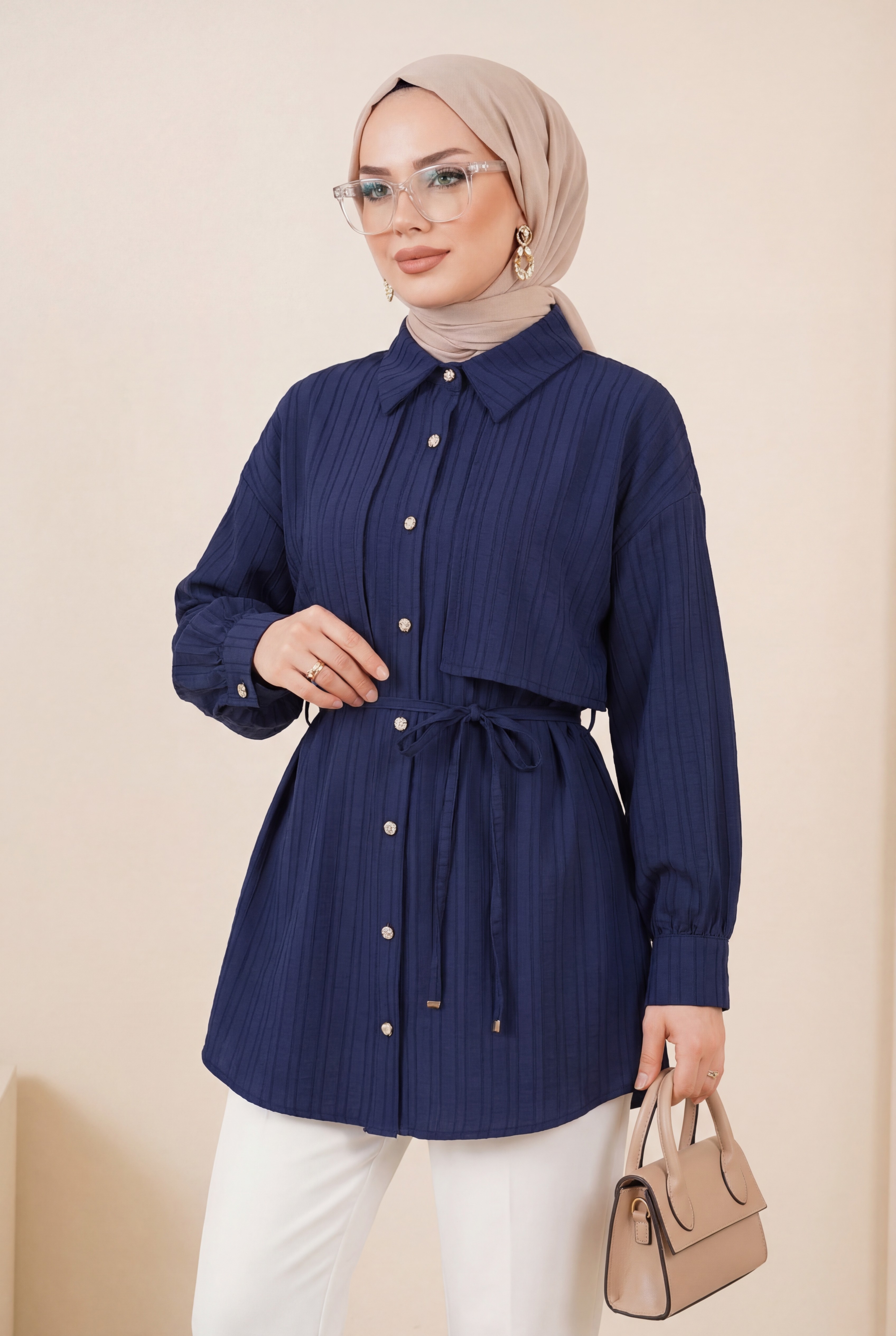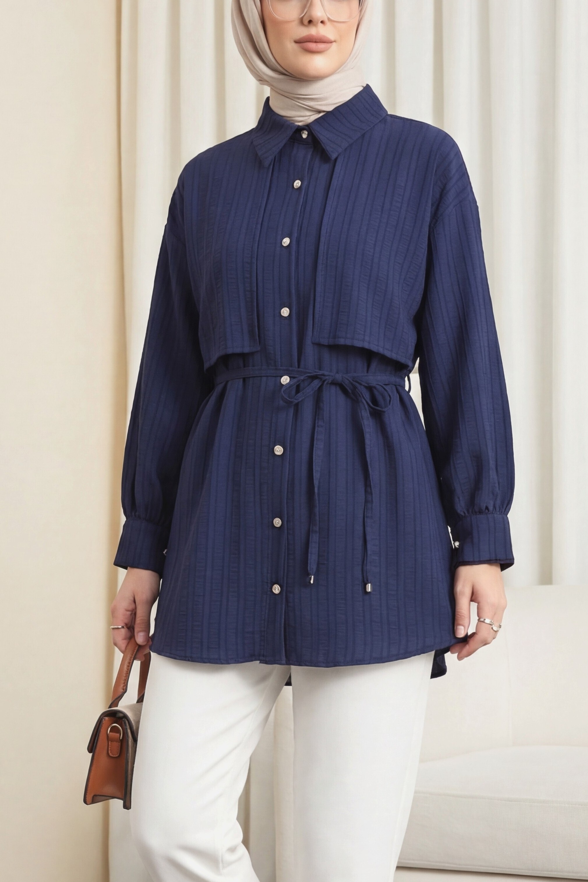 Tied Waist Bolero Detailed Stoned Button -Navy blue