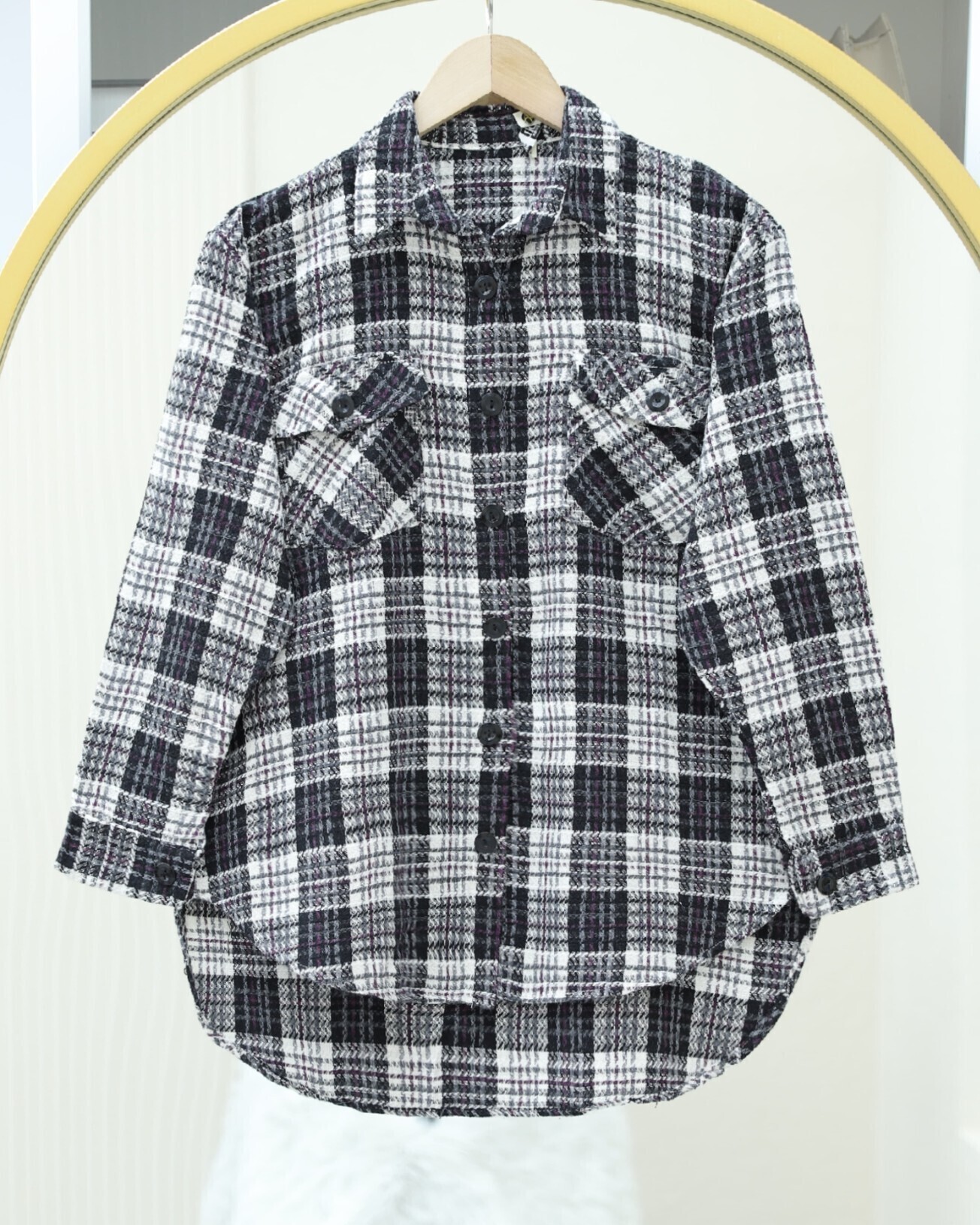 The flap pocket tweed shirt combines elegance and sophistication. Made from high-quality tweed fabric, it offers both comfort and style. The flap pockets add a modern touch while providing practical use. Perfect for both casual outfits and chic events, this shirt adds a sophisticated flair to your look. Available in various colors, it complements every style and becomes an essential piece in your wardrobe.