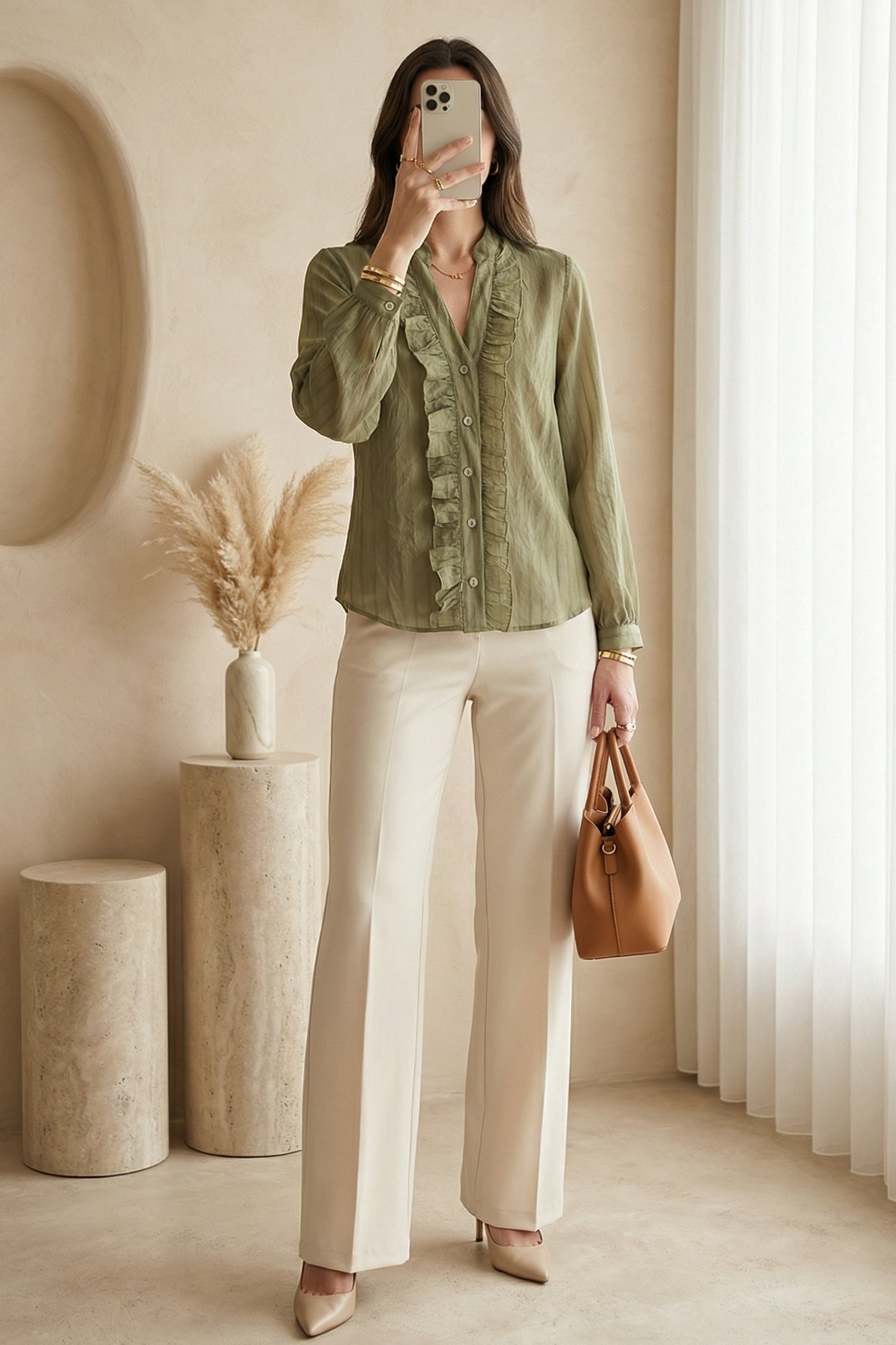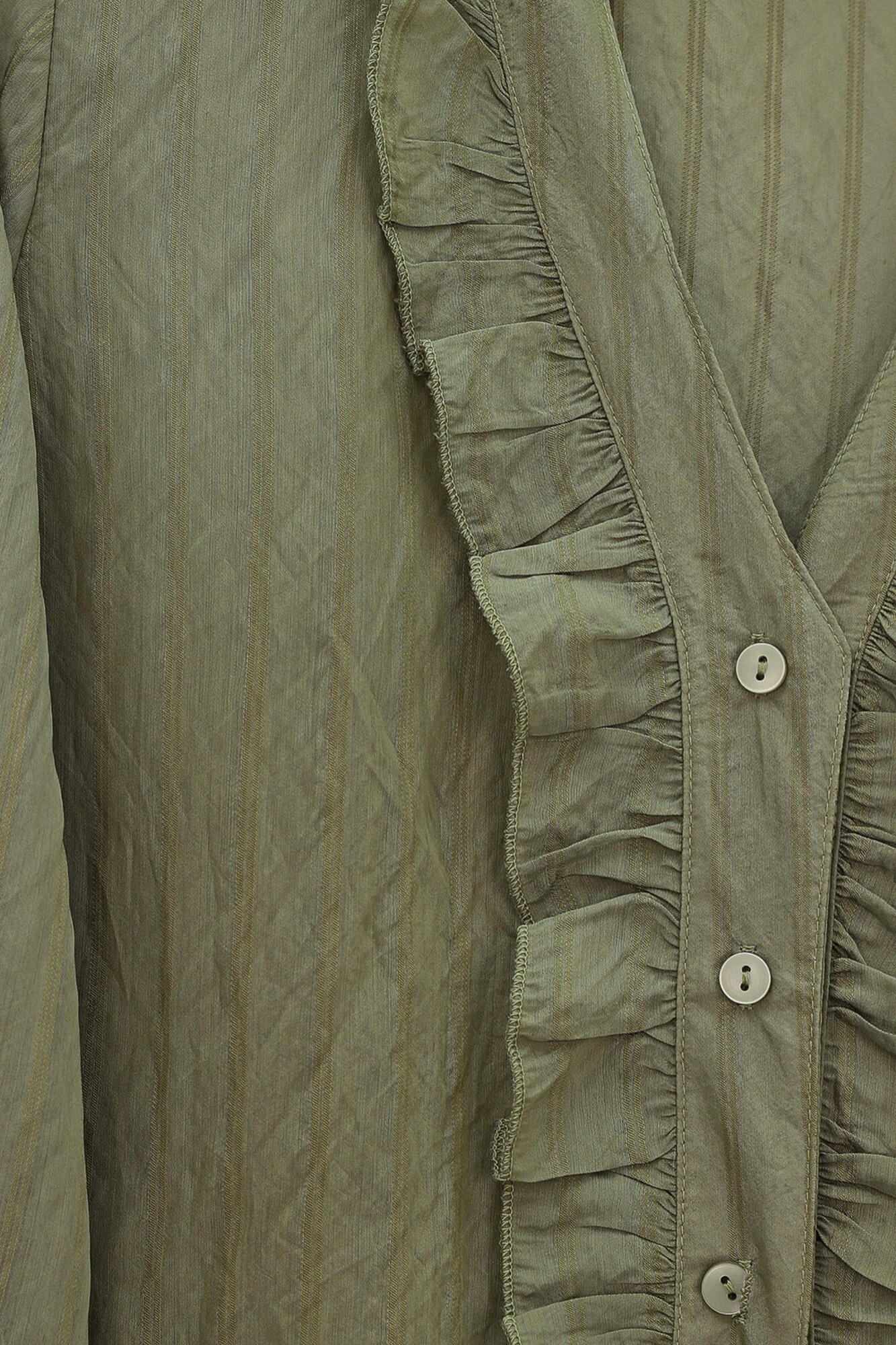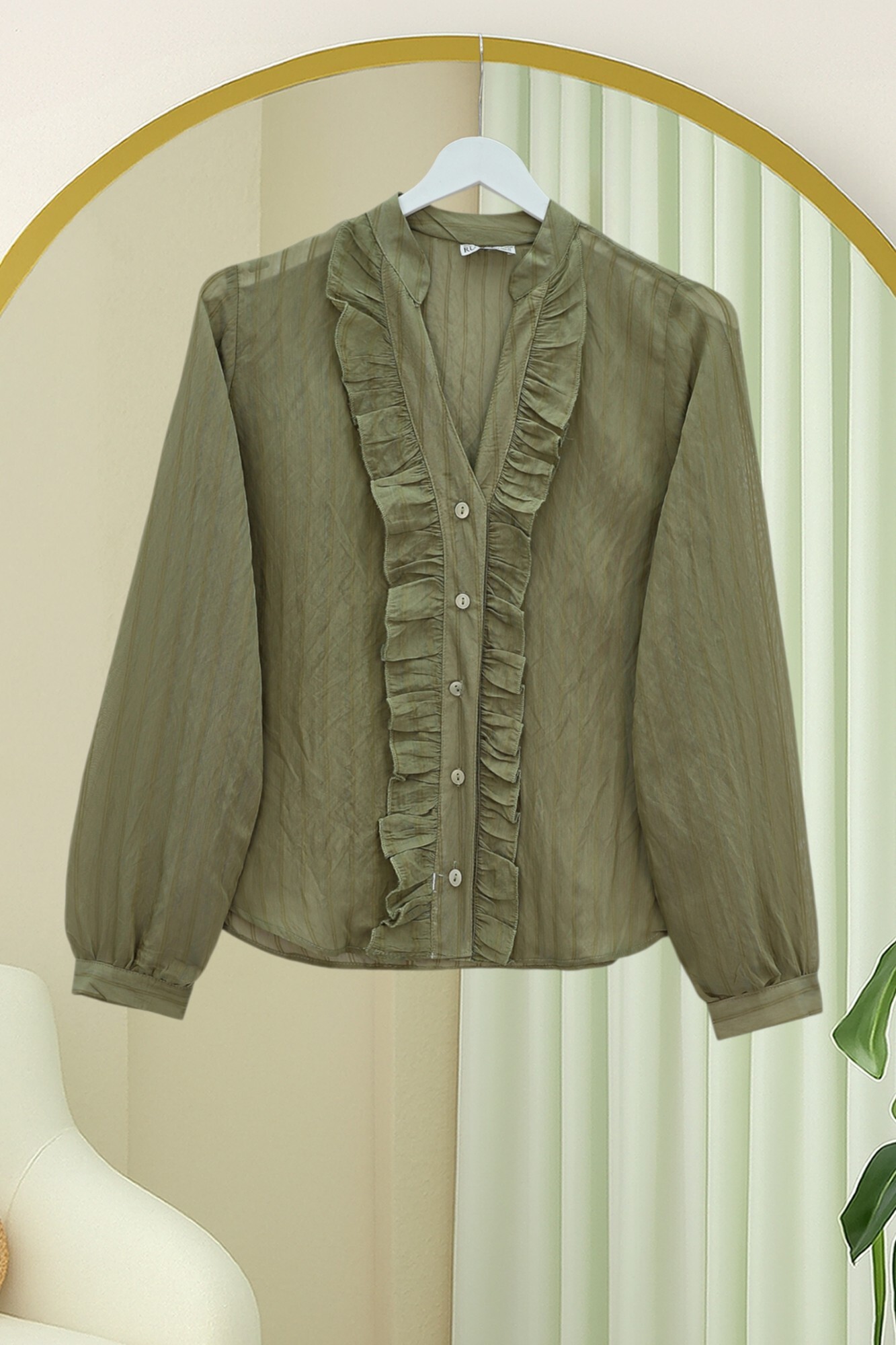 V-Neck Front Ruffled Tencel Semi-Sheer Bouquet Shirt -Khaki