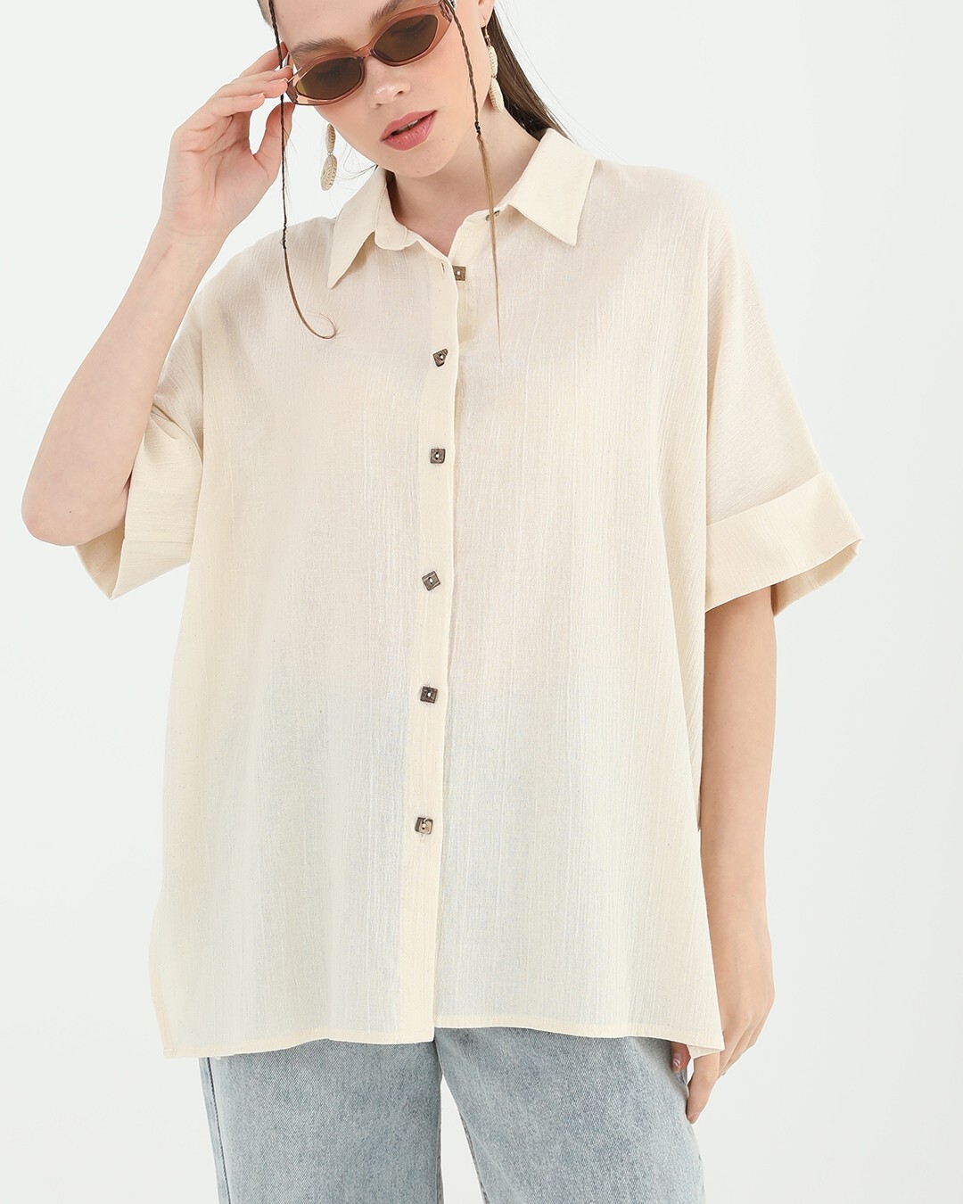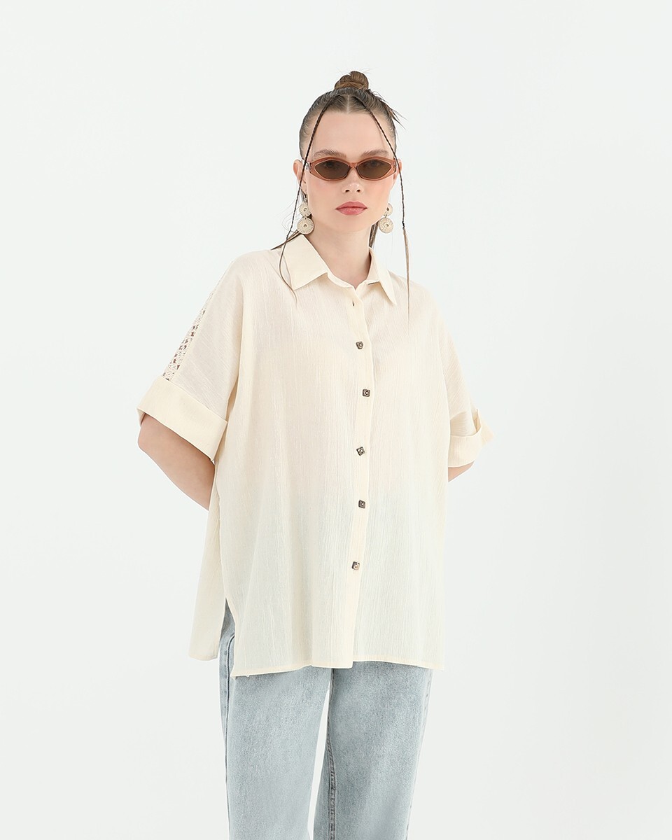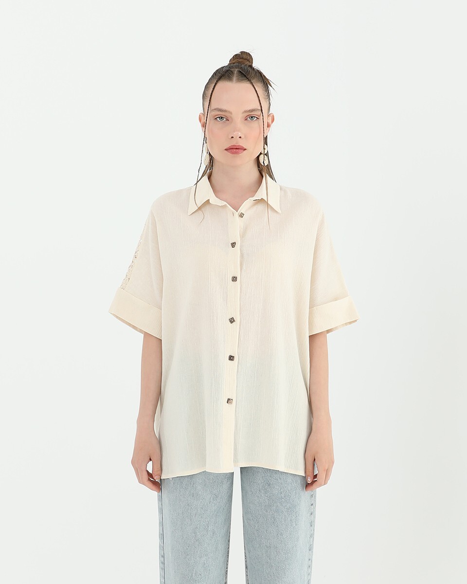 This short-sleeved shirt, enhanced by a lace detail at the back yoke, offers a feminine look. Its relaxed cut makes it suitable for everyday wear.