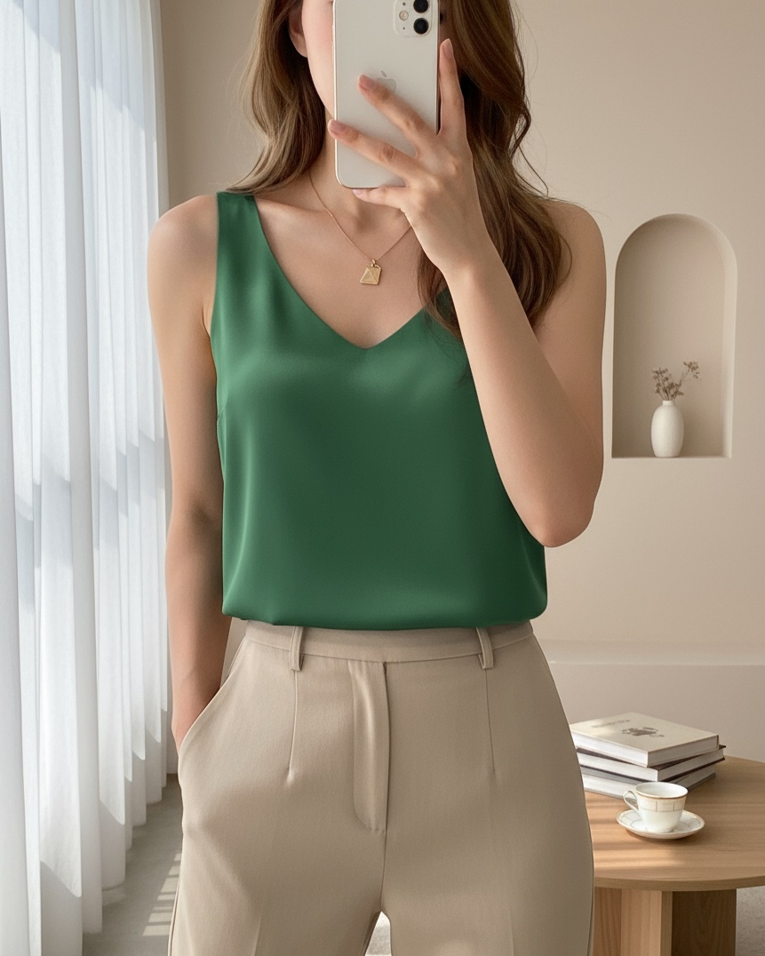 V Neck Zero Sleeve Satin Blouse -Emerald