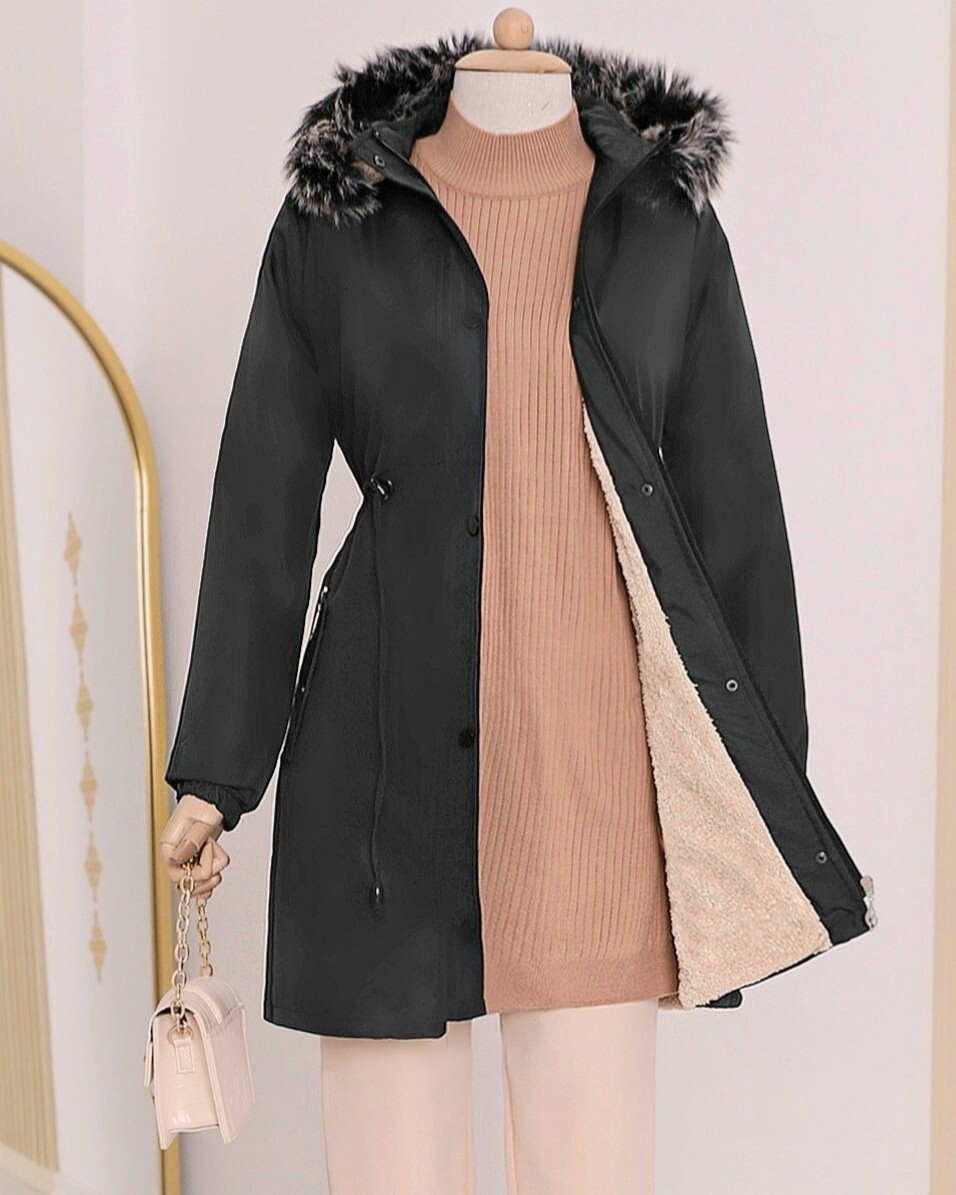 Our hooded, front zippered, furry inside, 2-pocket coat model has taken its place among the most trendy models of the new season.