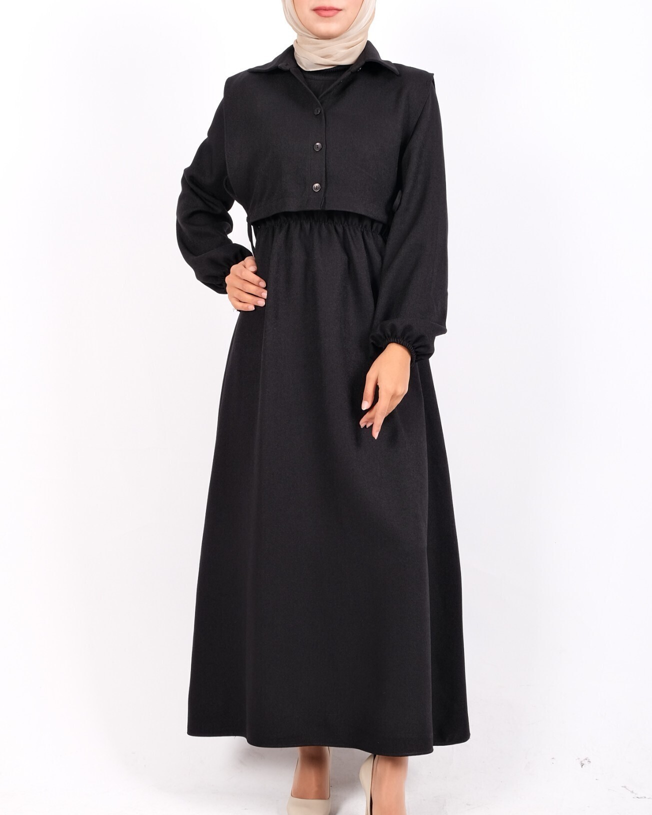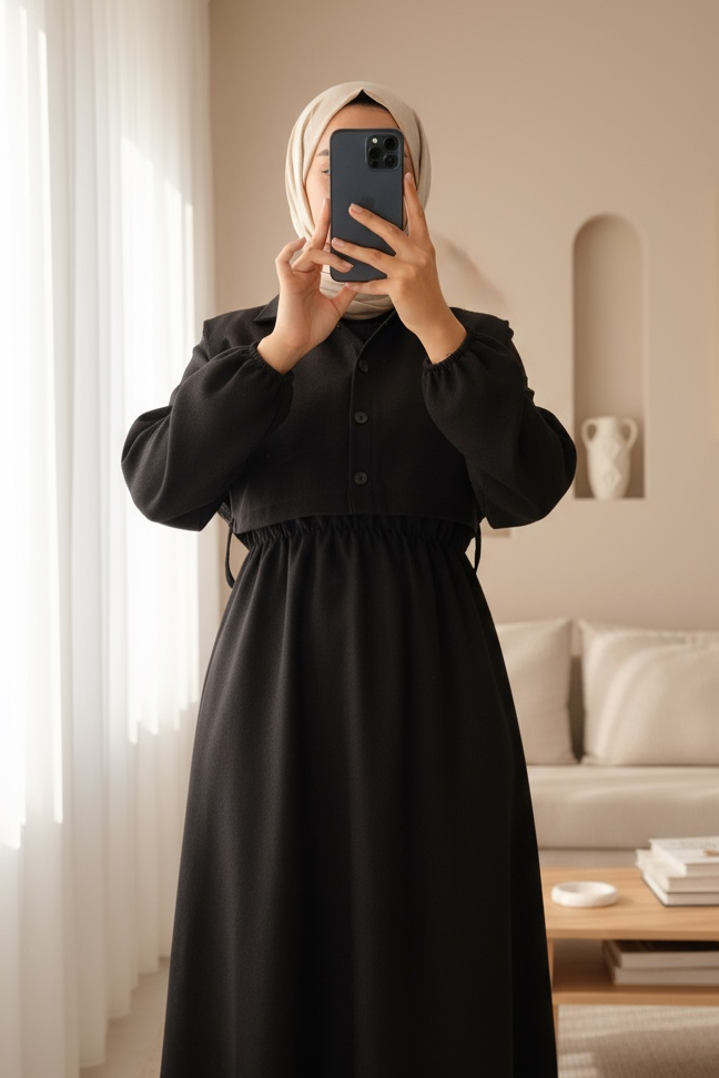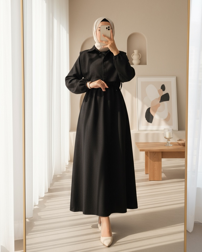 The shirt-detailed, elastic-sleeve, and belted dress offers a modern and stylish look. The shirt collar and button details add a sophisticated touch, while the elastic waist and sleeves provide comfort and a flattering fit. This dress is a practical and elegant choice, perfect for both everyday wear and special occasions, completing your chic look.