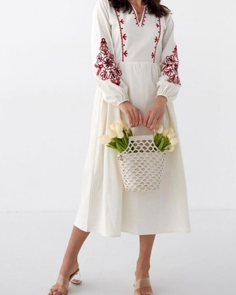 Our linen dress model with V-neck, embroidery on the neck and sleeves and elasticated sleeve cuffs is among the most popular models of the new season.