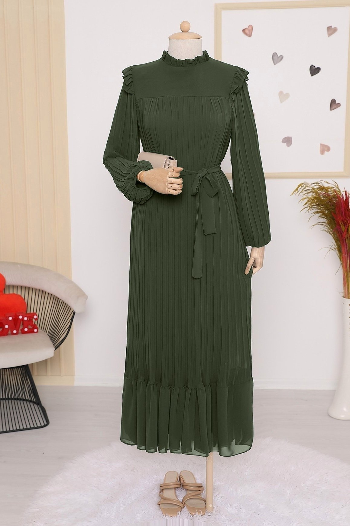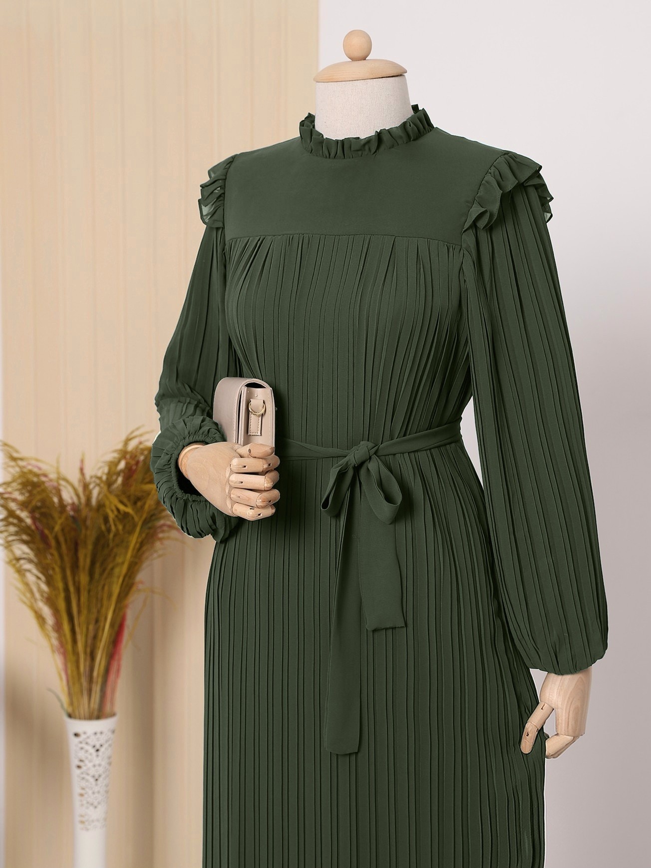 Front Robe Sleeves and Body Pleated Dress -Khaki