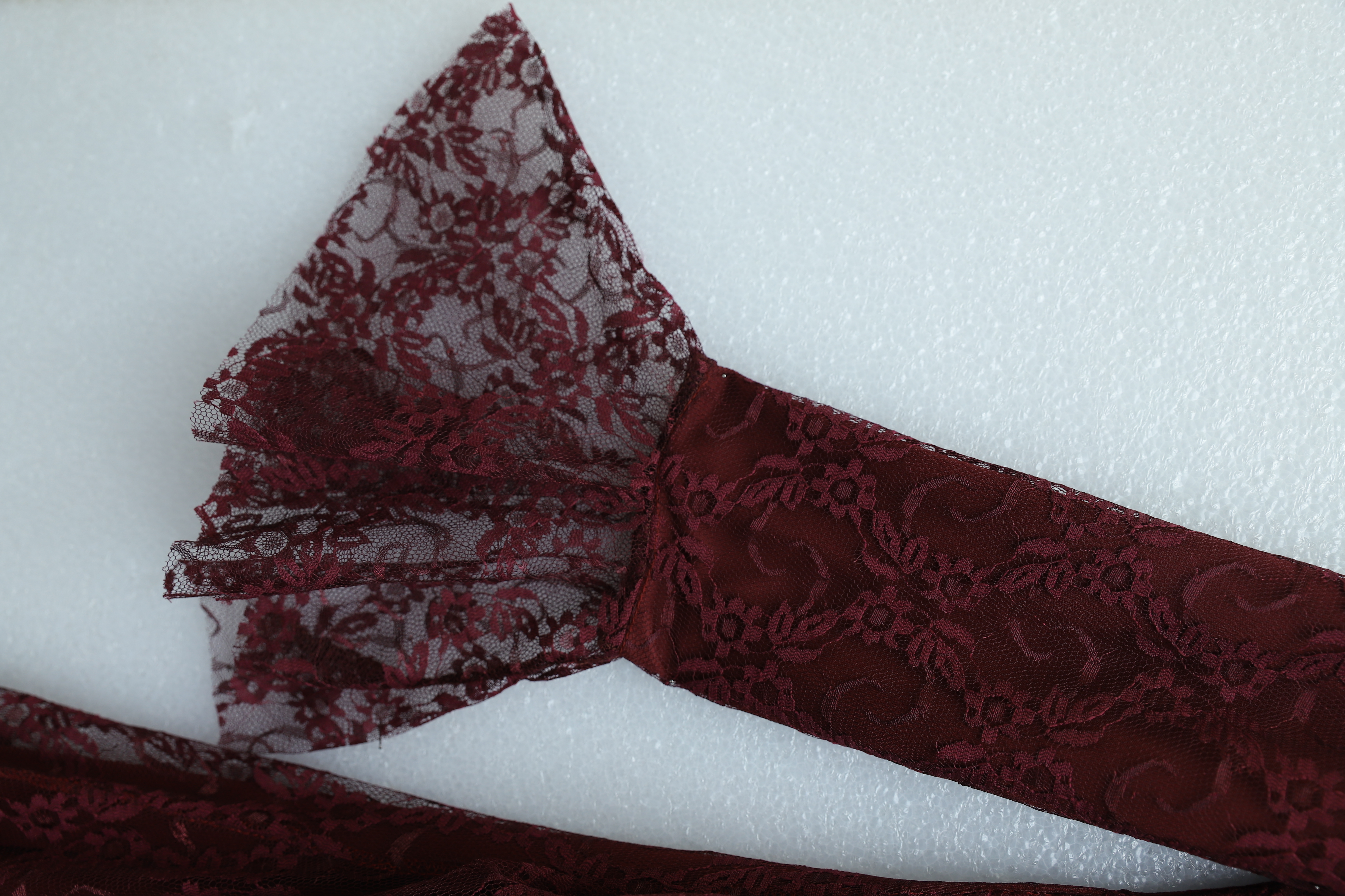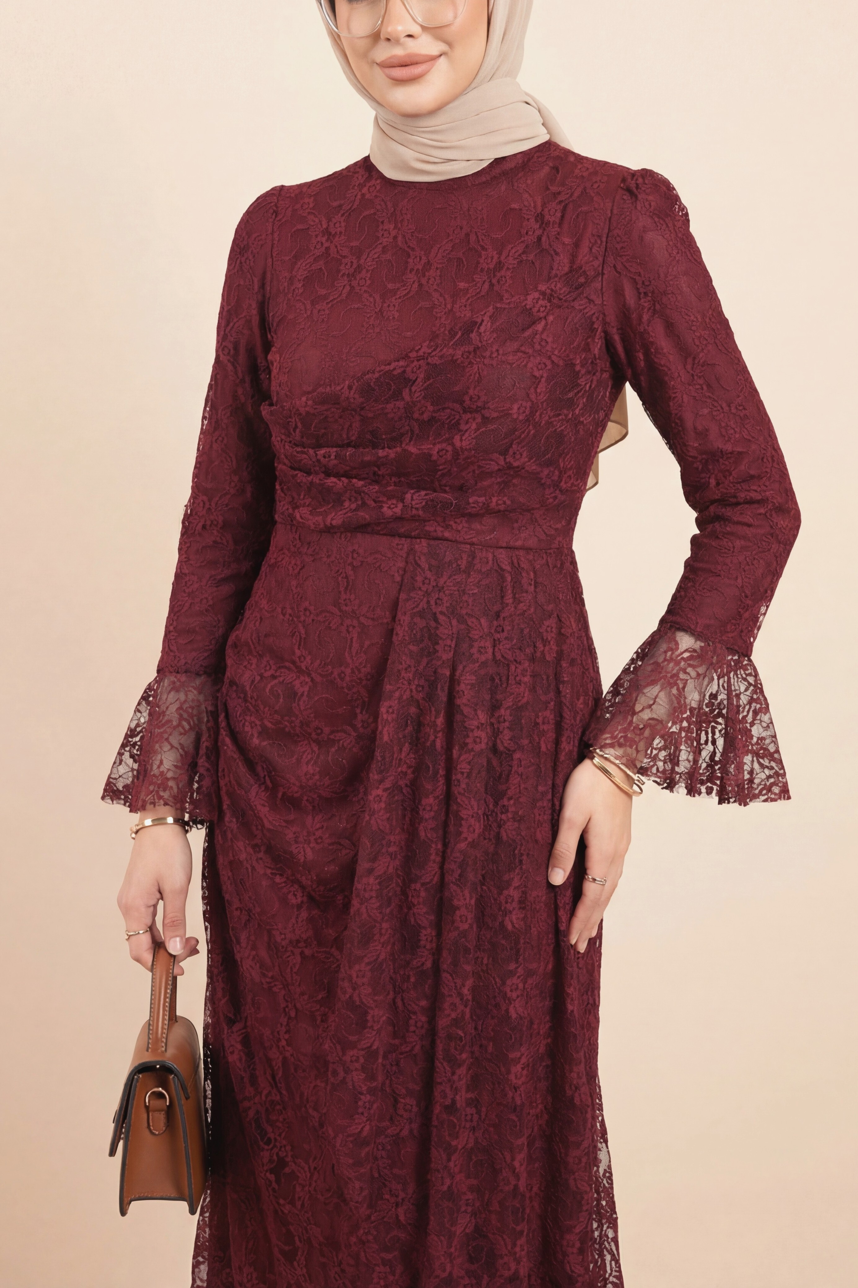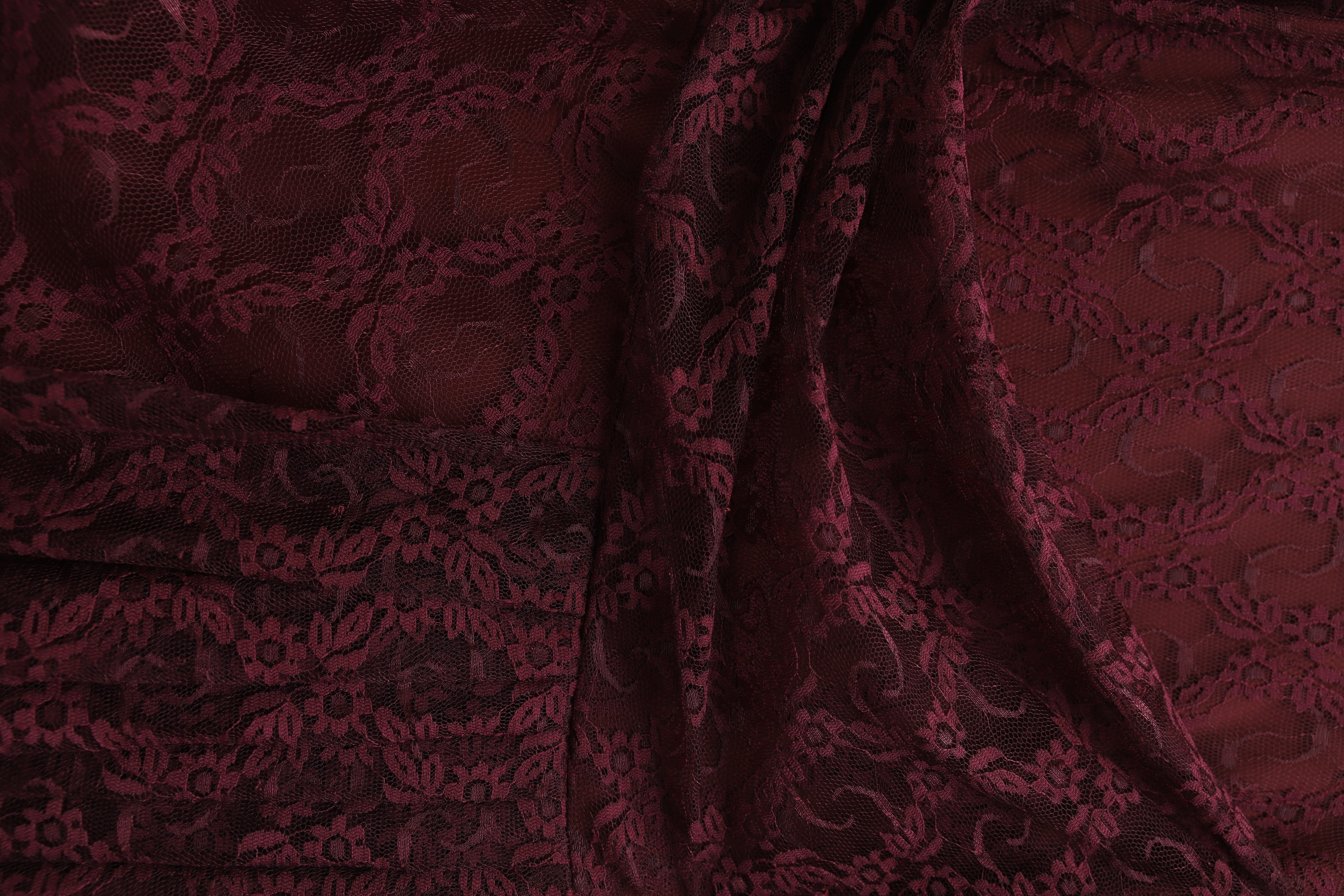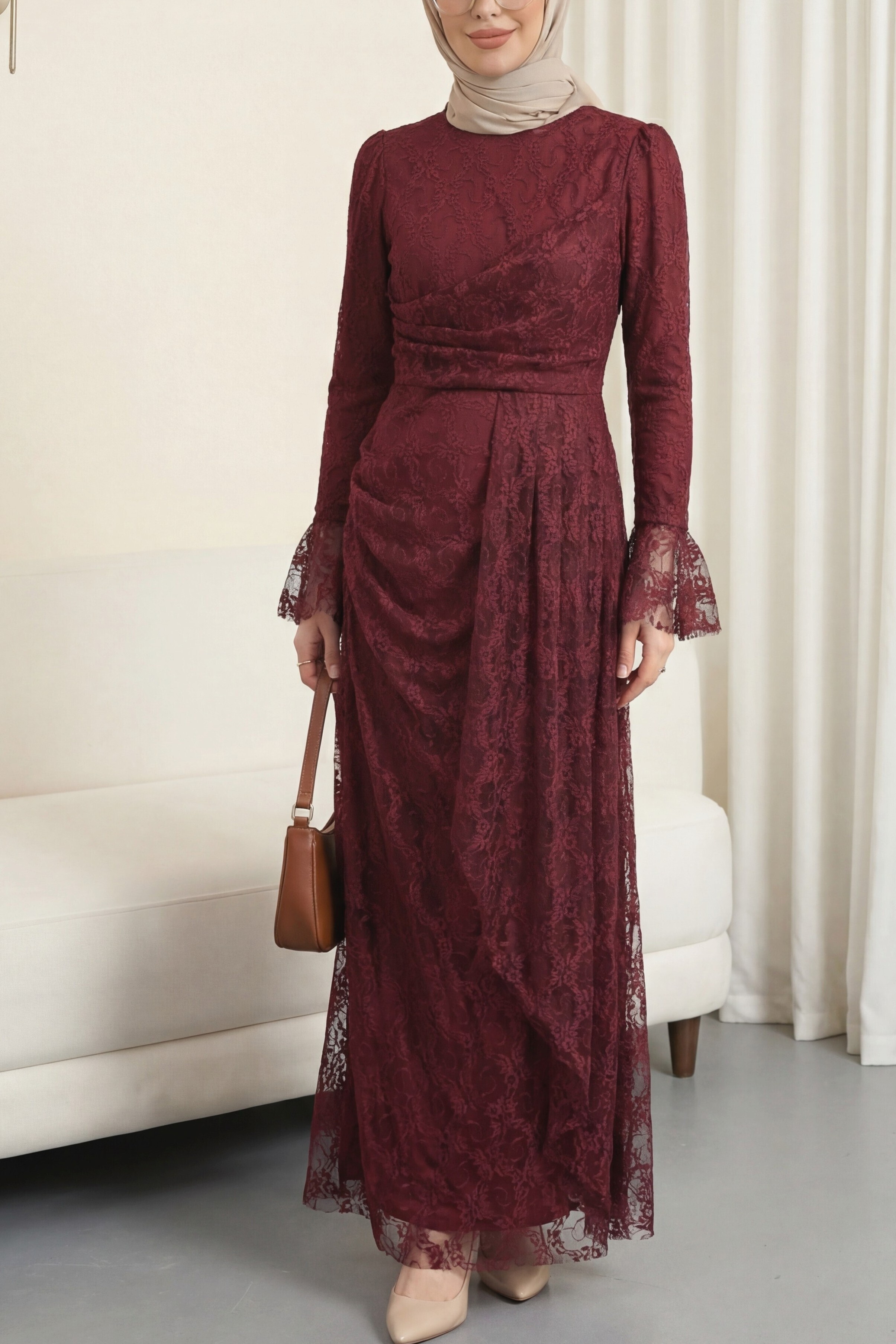 Lace Dress with Ruffled Cuffs, Draped Front, and Lining -Maroon