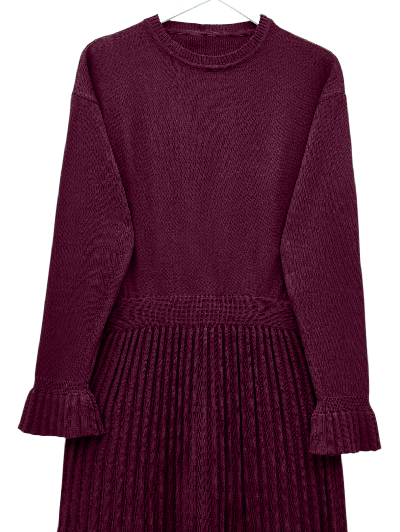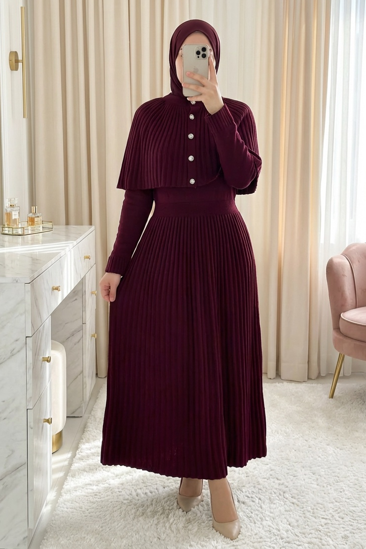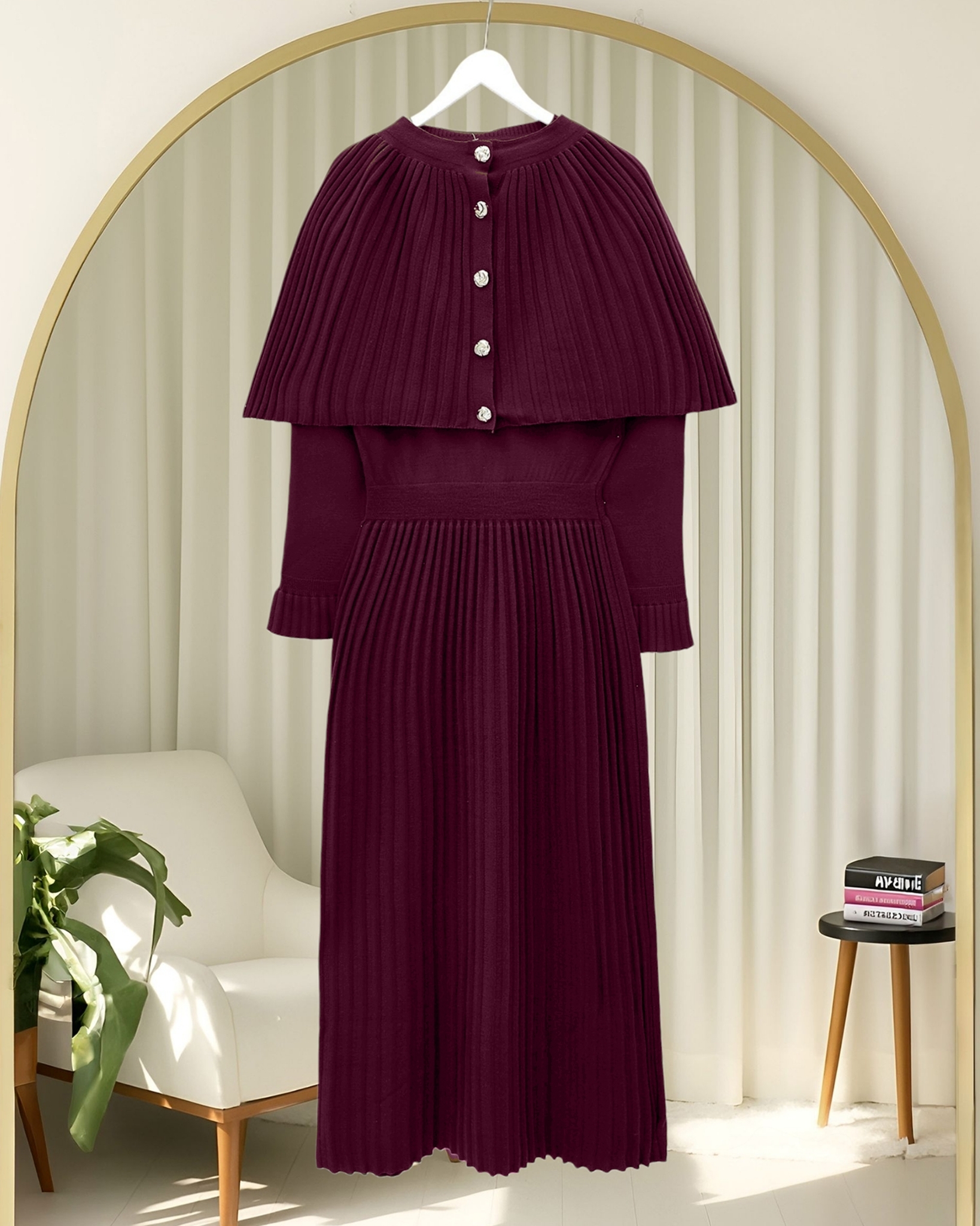 Long Knit Dress with Ribbed Skirt and Elastic Waistband and Cape Detail -Maroon