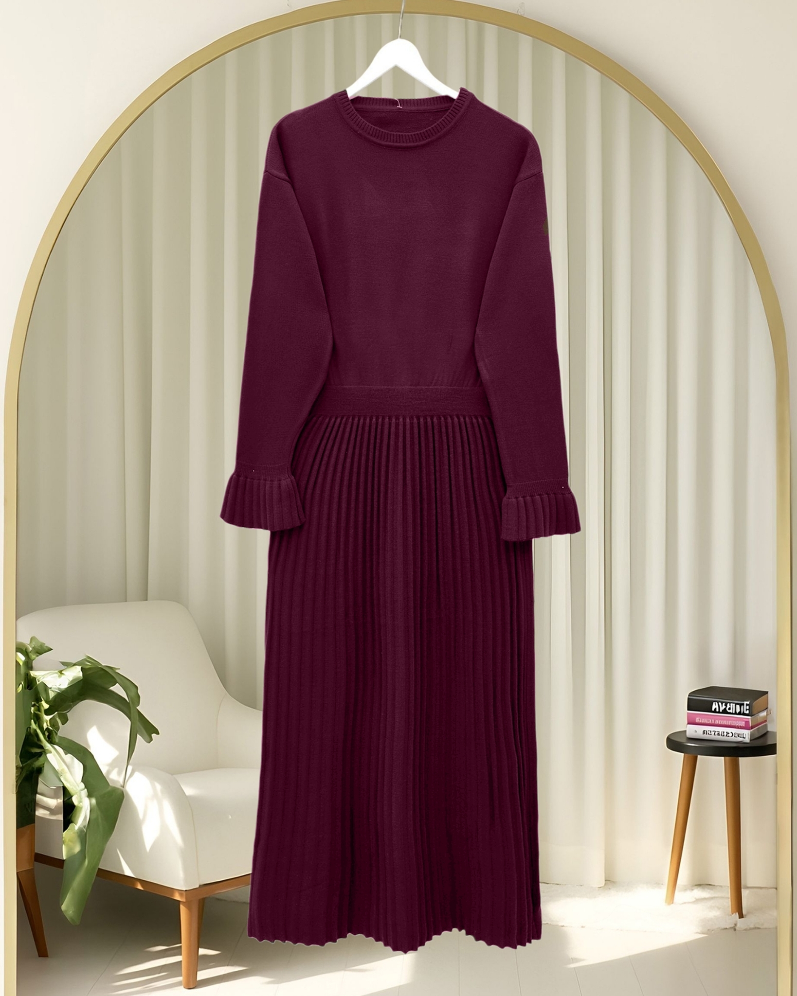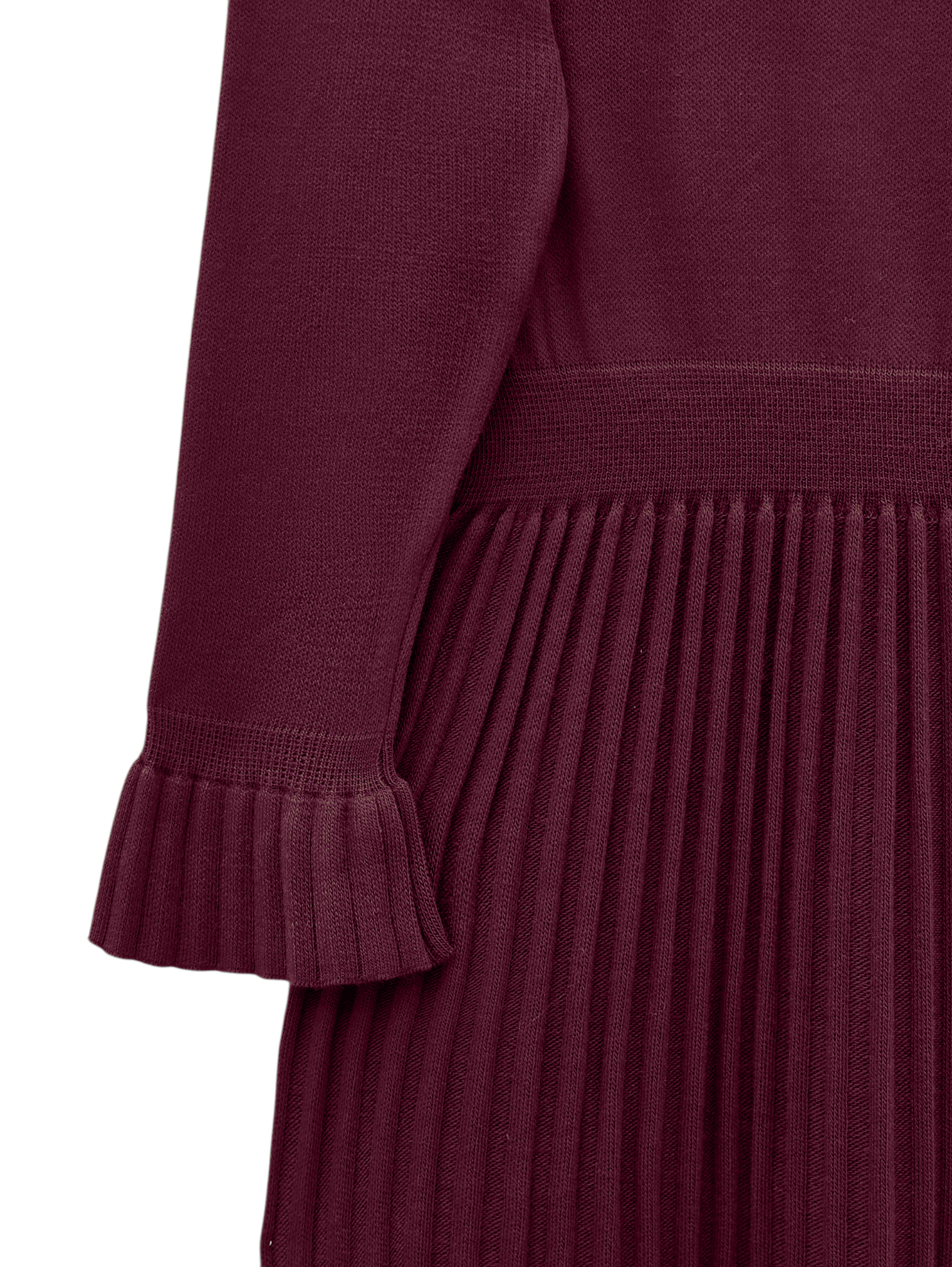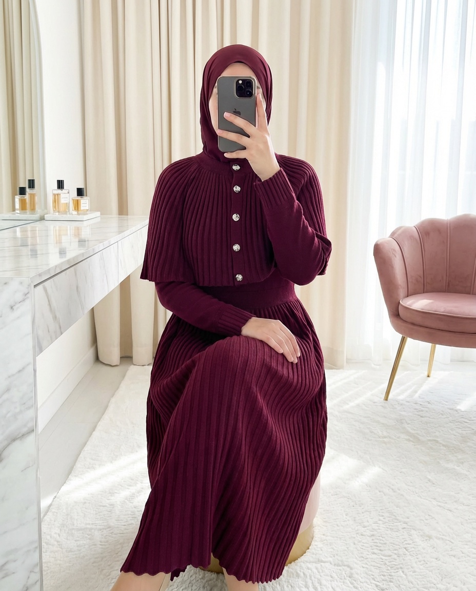 Long Knit Dress with Ribbed Skirt and Elastic Waistband and Cape Detail -Maroon